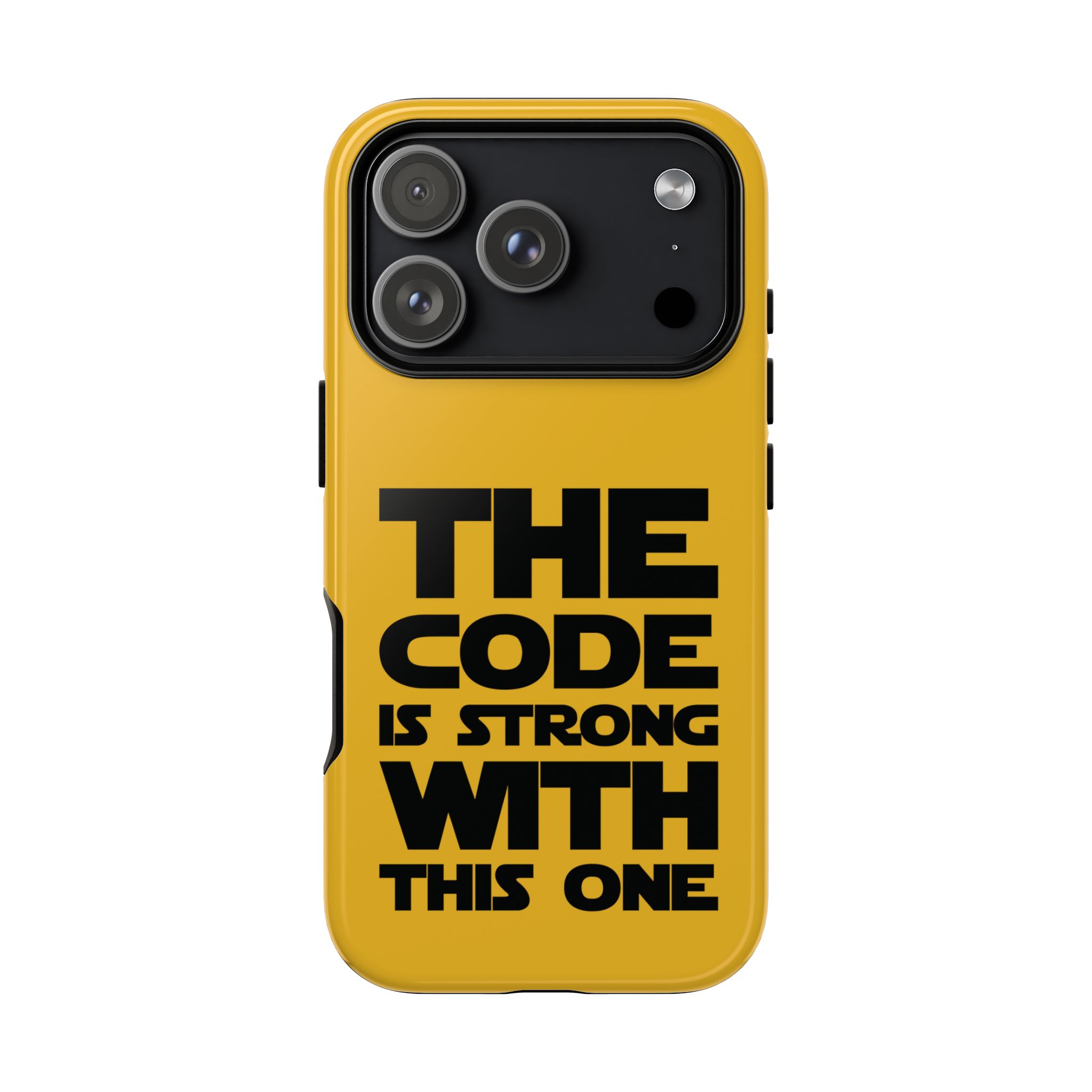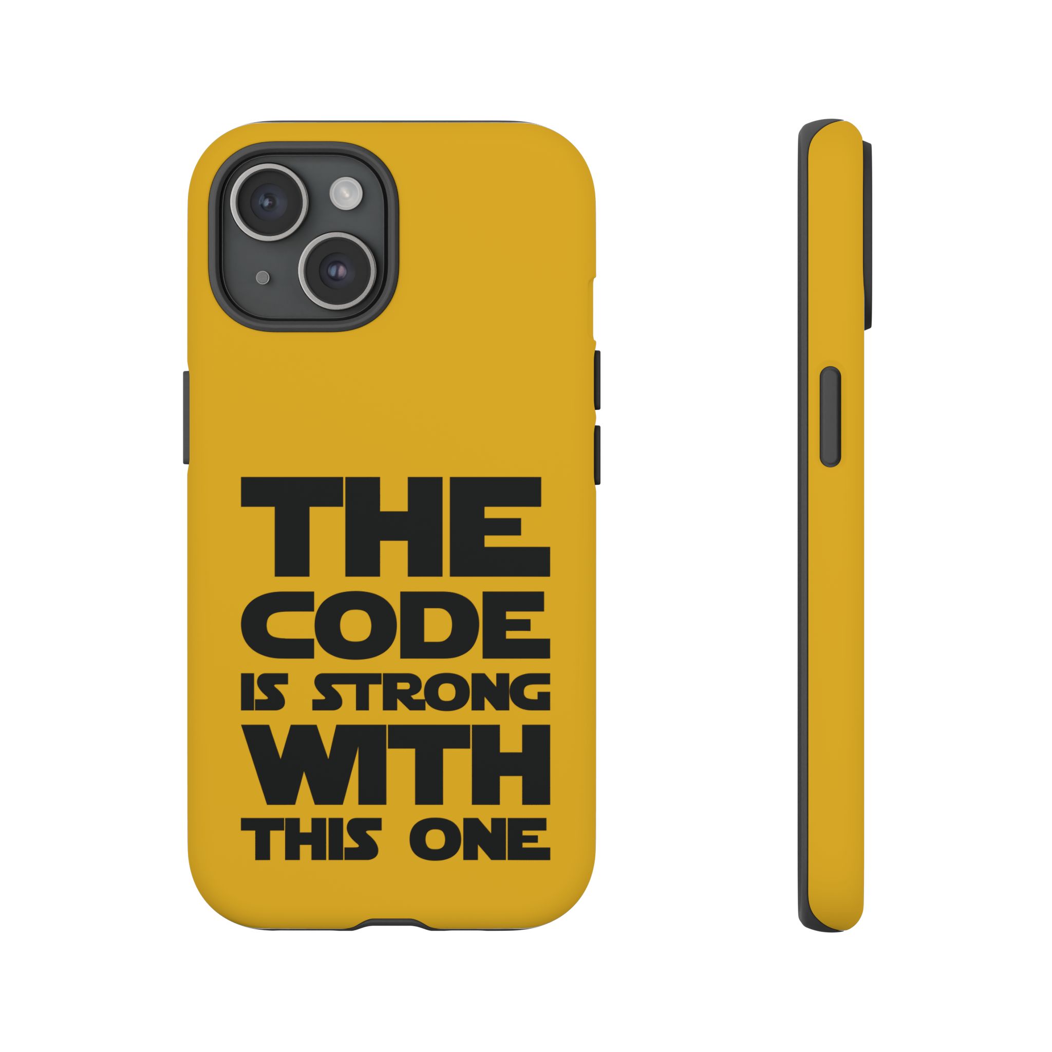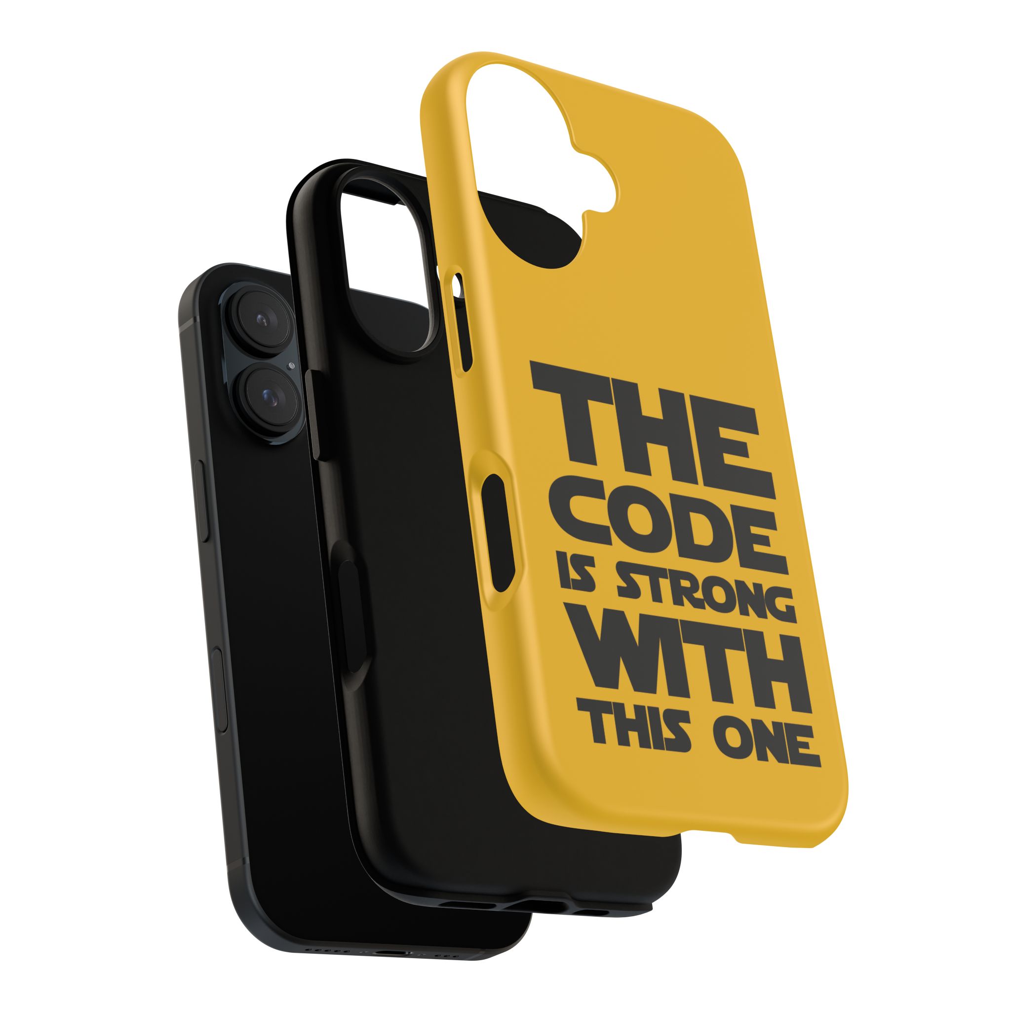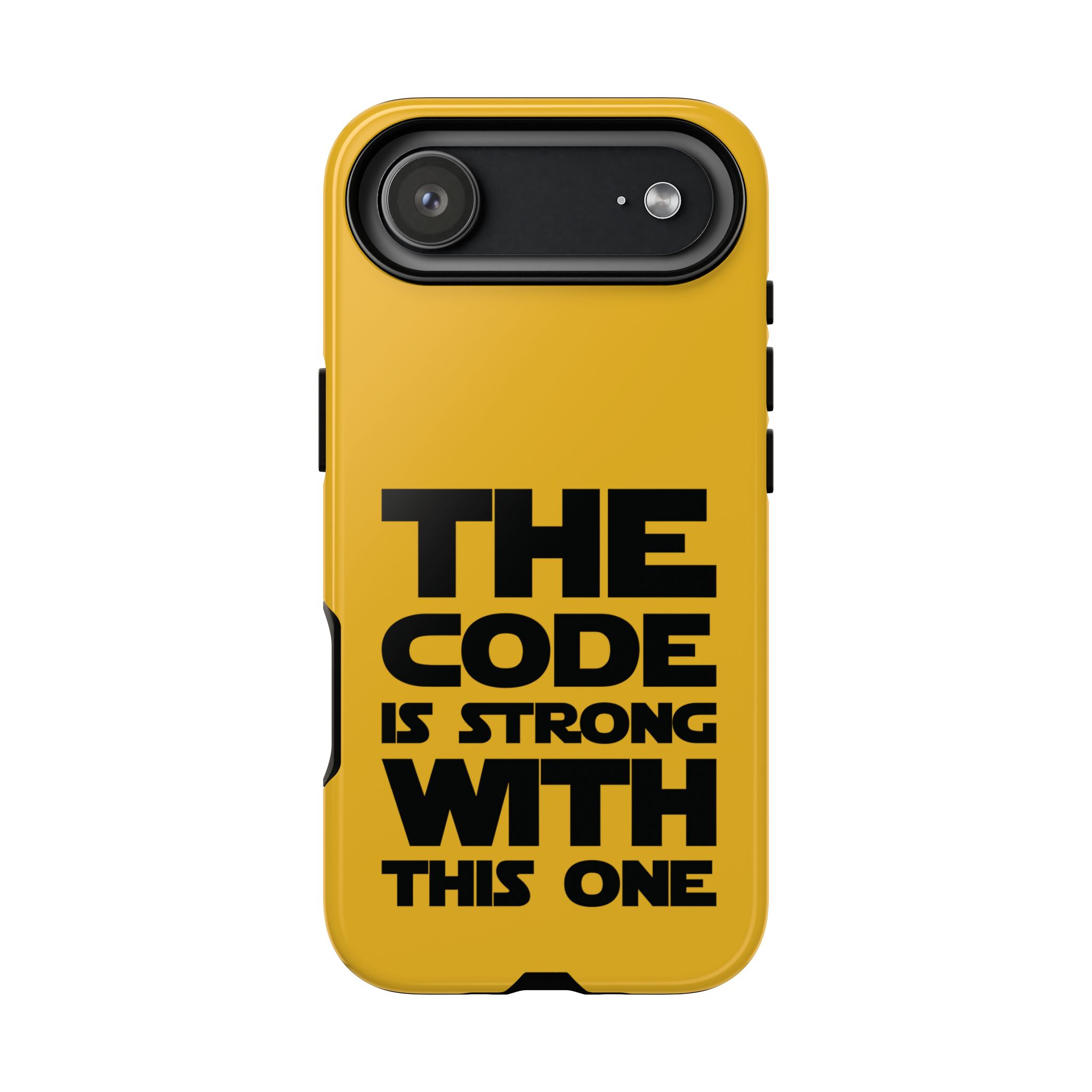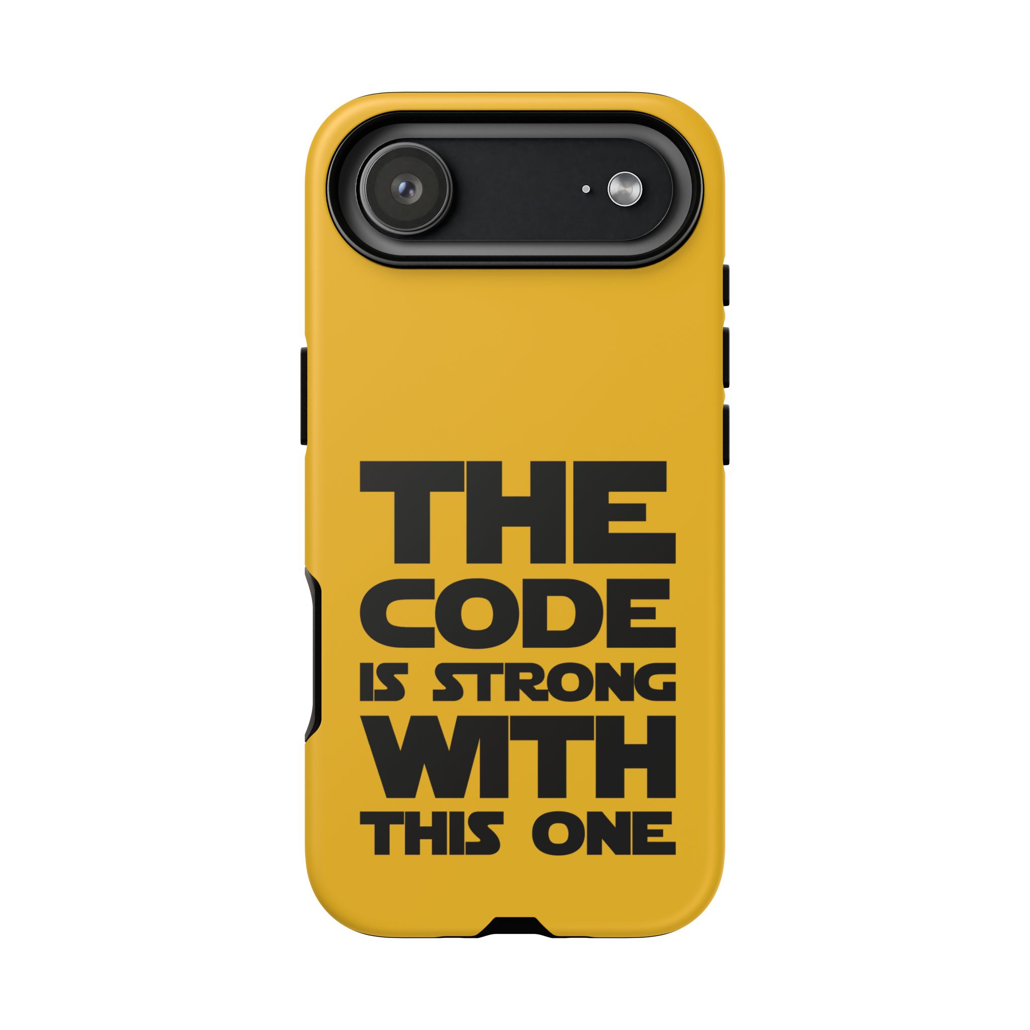 Une coque de téléphone audacieuse et protectrice qui affiche fièrement son côté geek. Un jaune moutarde éclatant habille la coque double couche, tandis qu'un slogan typographique noir net proclame : “ THE CODE IS STRONG WITH THIS ONE ”. La doublure en silicone TPU amortit les chutes et offre une sensation haut de gamme au contact du téléphone. L'impression 3D intégrale préserve l'éclat du message, et la protection UV protège les couleurs en extérieur. Des découpes précises laissent les ports accessibles et la coque est compatible avec la recharge sans fil. Conçue pour résister aux aléas du quotidien d'un développeur – trajets domicile-travail, sessions de travail intensives au café, sessions de débogage nocturnes – elle affiche avec style et assurance.