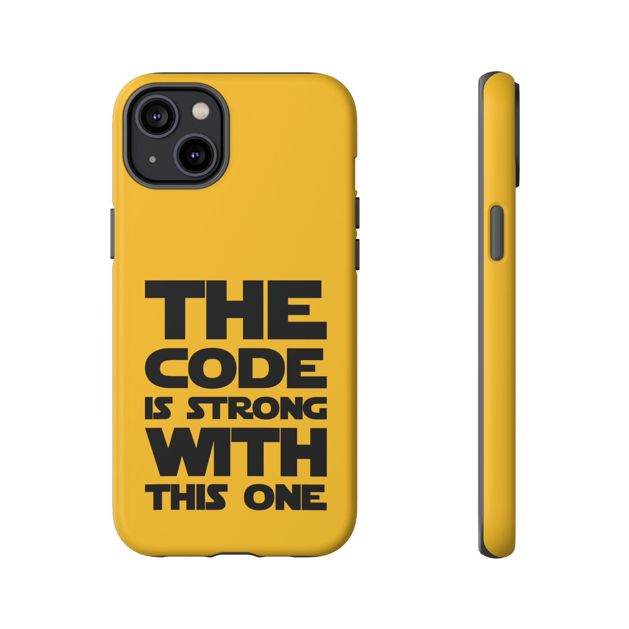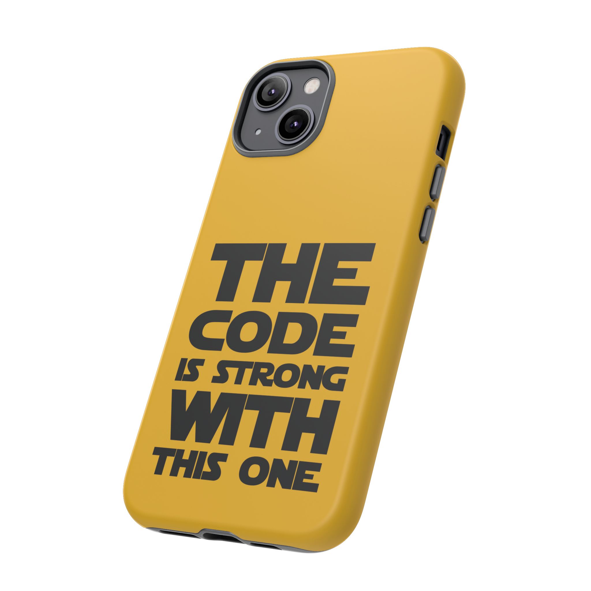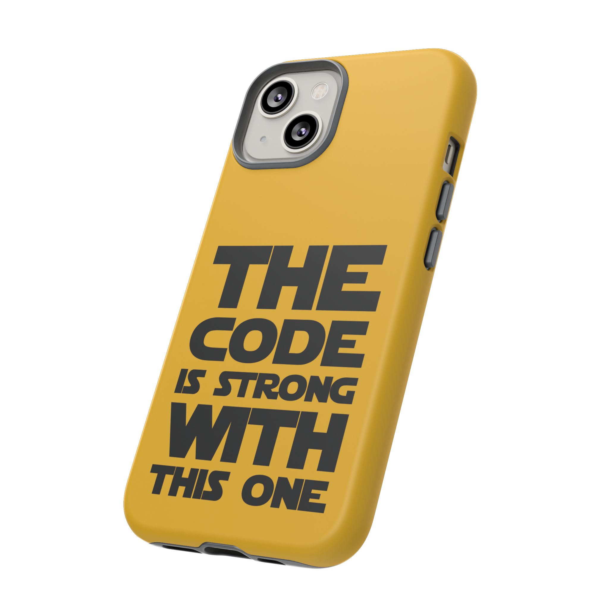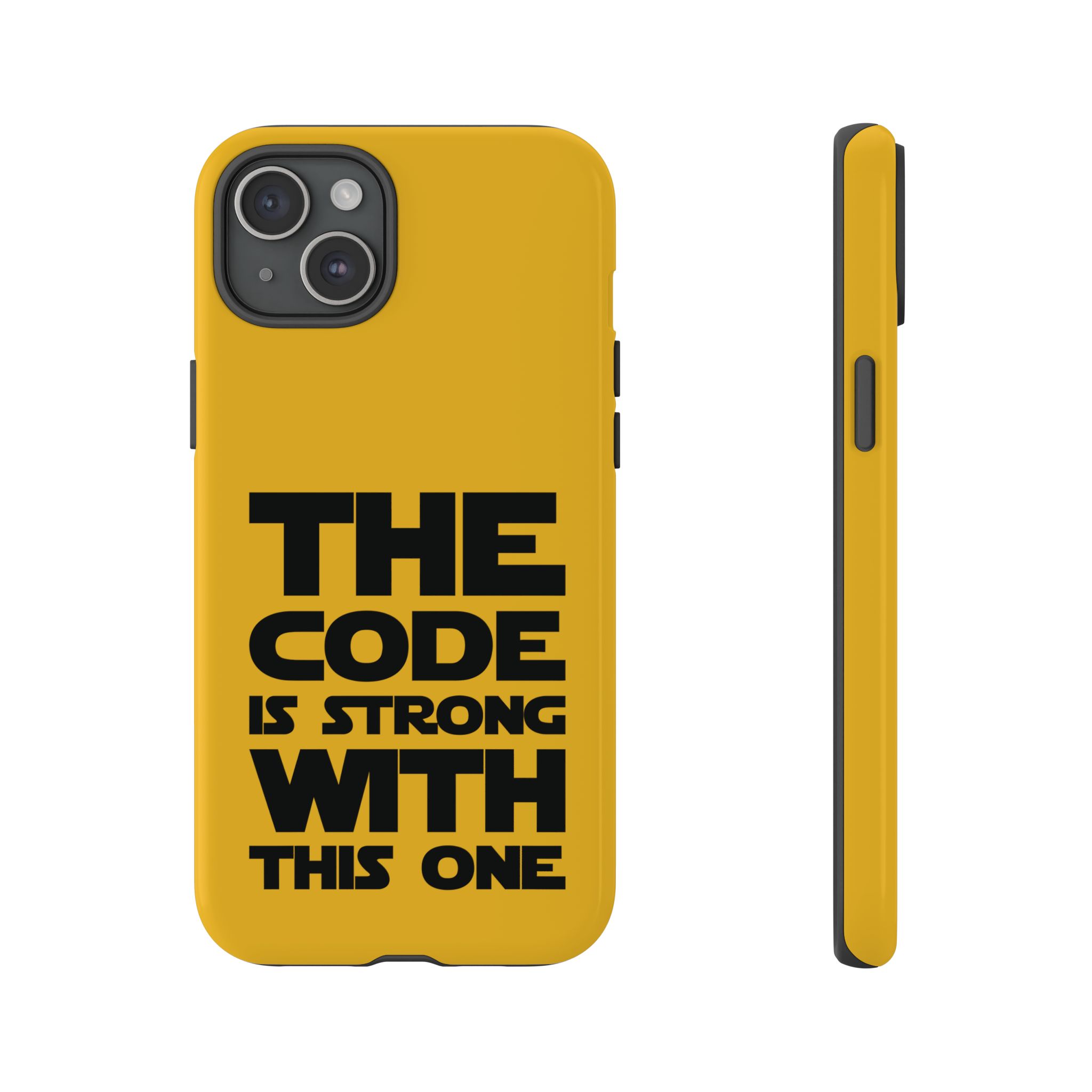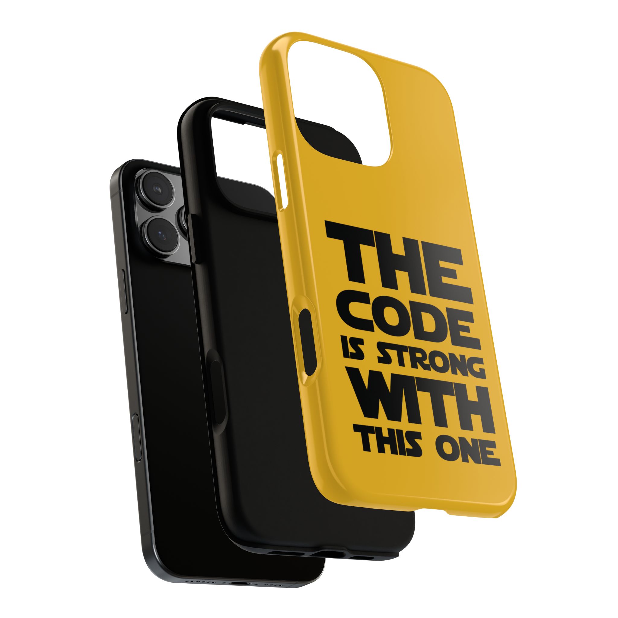 Une coque de téléphone audacieuse et protectrice qui affiche fièrement son côté geek. Un jaune moutarde éclatant habille la coque double couche, tandis qu'un slogan typographique noir net proclame : “ THE CODE IS STRONG WITH THIS ONE ”. La doublure en silicone TPU amortit les chutes et offre une sensation haut de gamme au contact du téléphone. L'impression 3D intégrale préserve l'éclat du message, et la protection UV protège les couleurs en extérieur. Des découpes précises laissent les ports accessibles et la coque est compatible avec la recharge sans fil. Conçue pour résister aux aléas du quotidien d'un développeur – trajets domicile-travail, sessions de travail intensives au café, sessions de débogage nocturnes – elle affiche avec style et assurance.