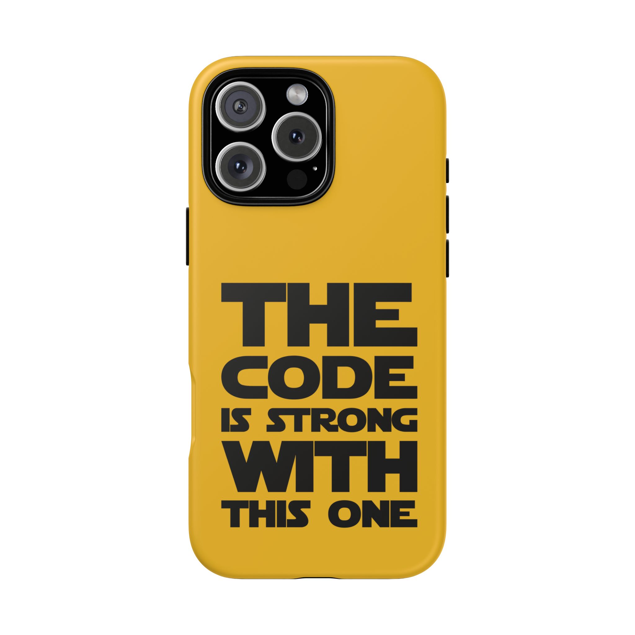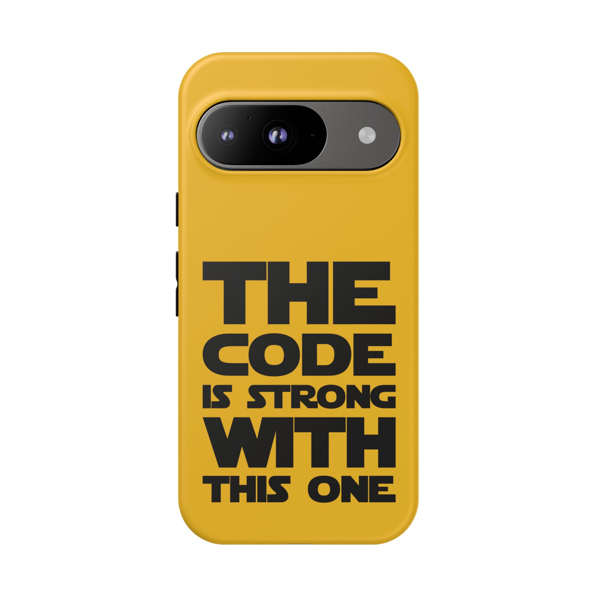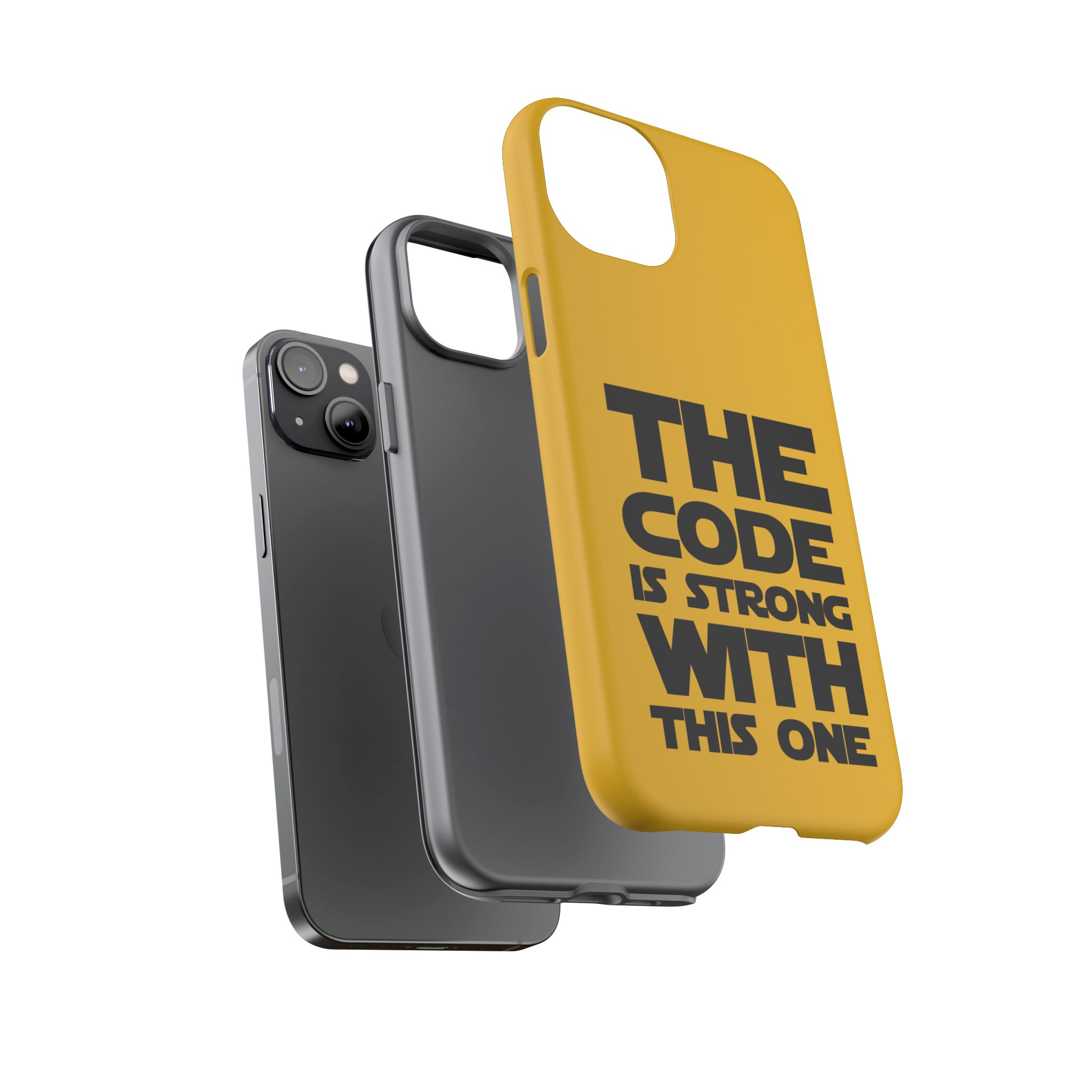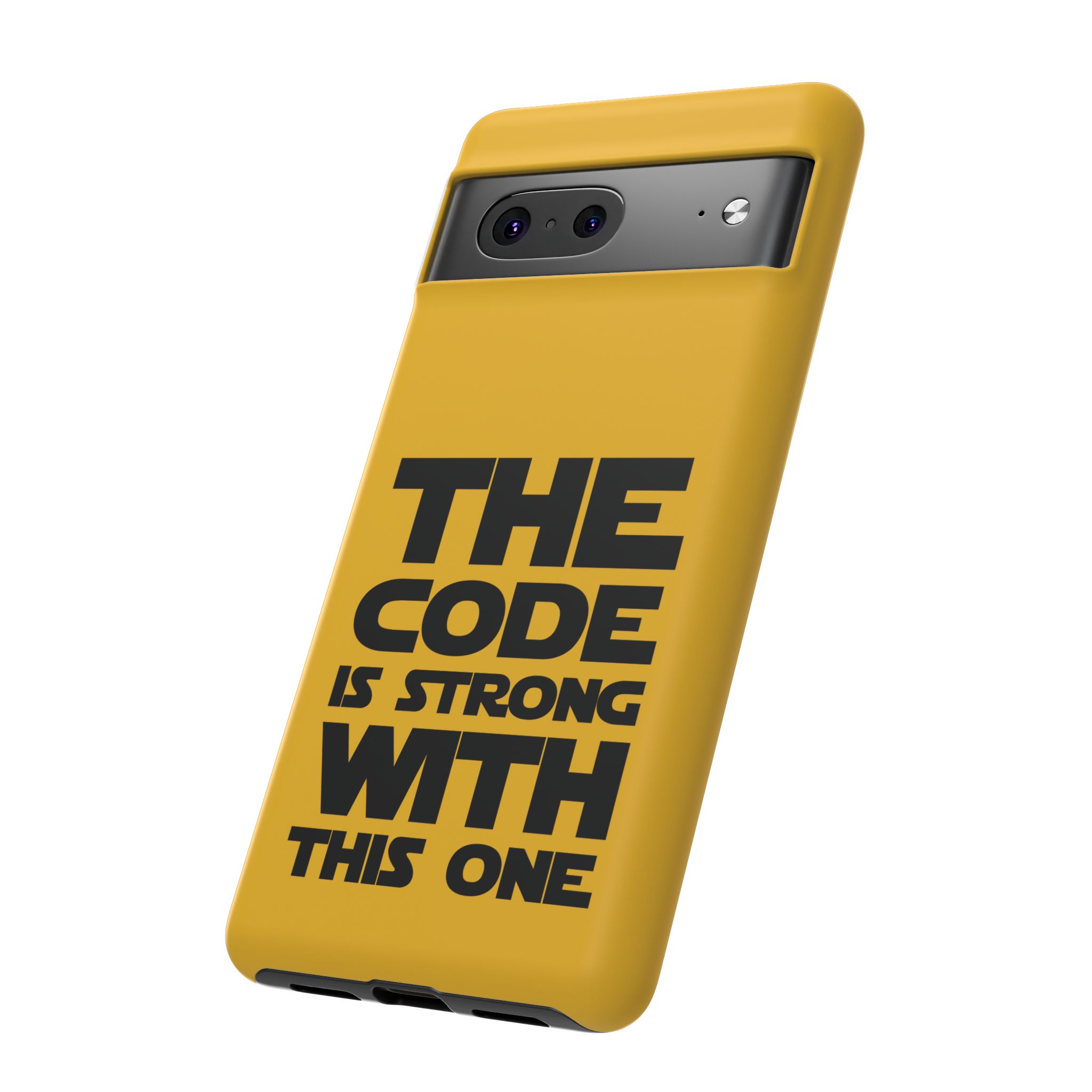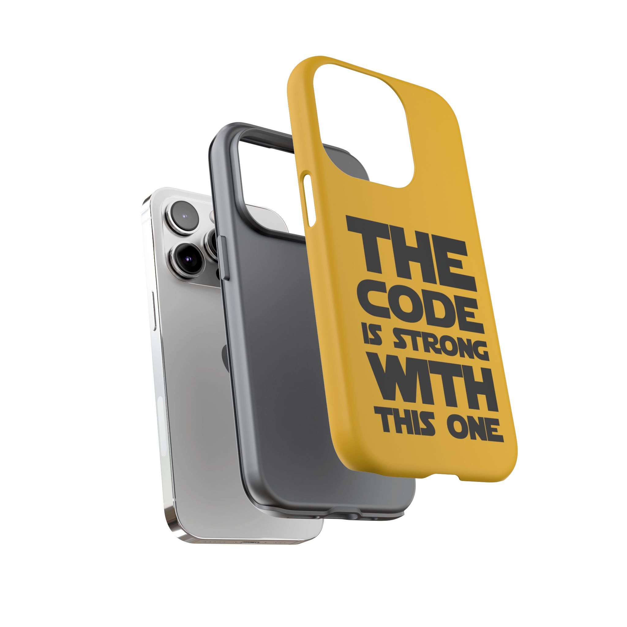 Une coque de téléphone audacieuse et protectrice qui affiche fièrement son côté geek. Un jaune moutarde éclatant habille la coque double couche, tandis qu'un slogan typographique noir net proclame : “ THE CODE IS STRONG WITH THIS ONE ”. La doublure en silicone TPU amortit les chutes et offre une sensation haut de gamme au contact du téléphone. L'impression 3D intégrale préserve l'éclat du message, et la protection UV protège les couleurs en extérieur. Des découpes précises laissent les ports accessibles et la coque est compatible avec la recharge sans fil. Conçue pour résister aux aléas du quotidien d'un développeur – trajets domicile-travail, sessions de travail intensives au café, sessions de débogage nocturnes – elle affiche avec style et assurance.