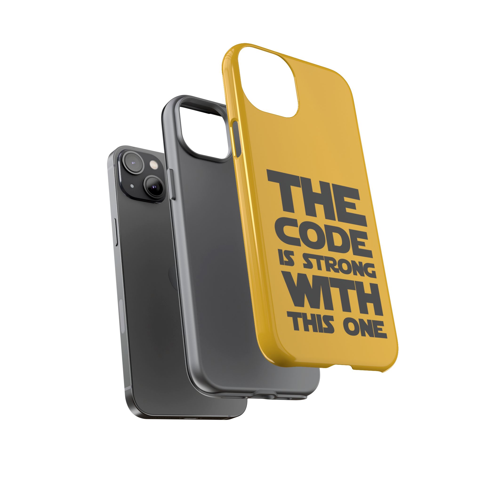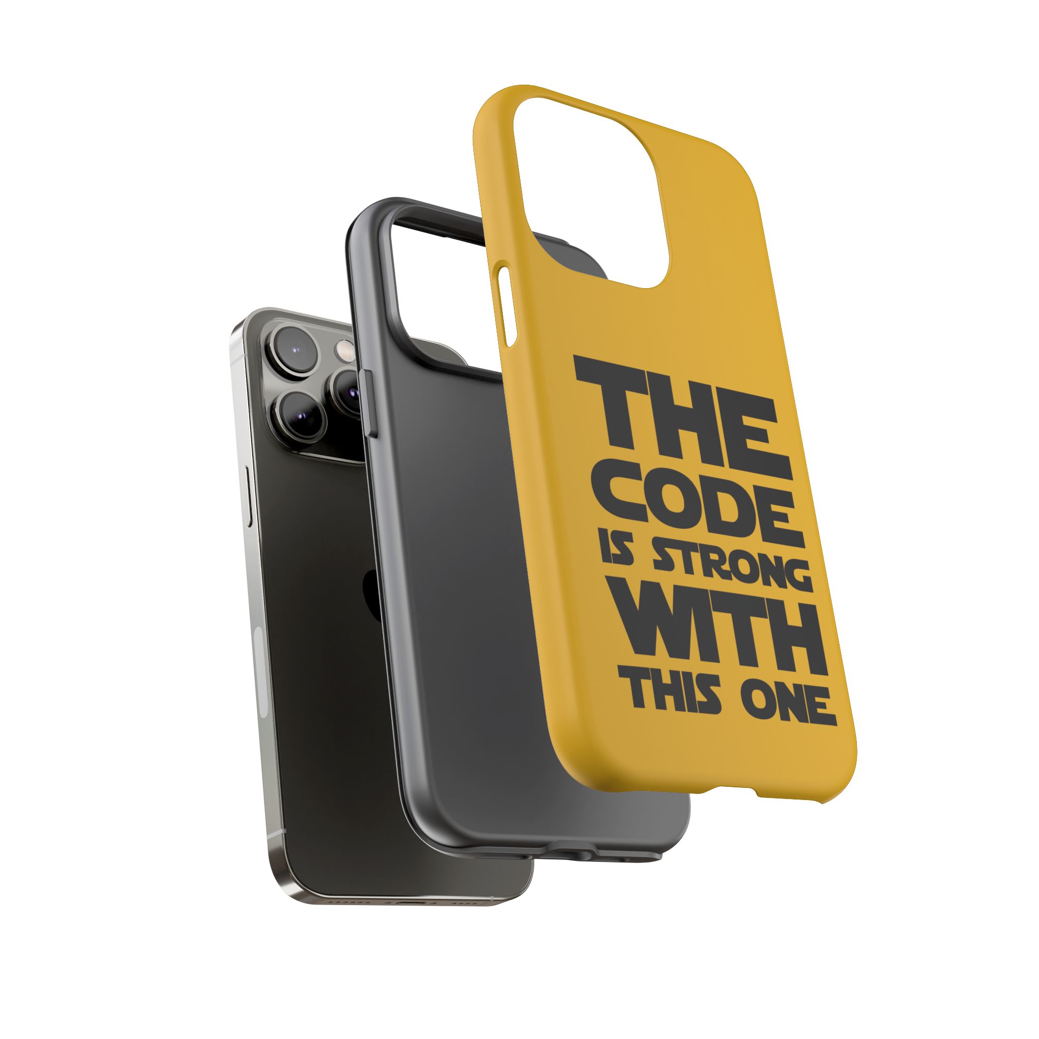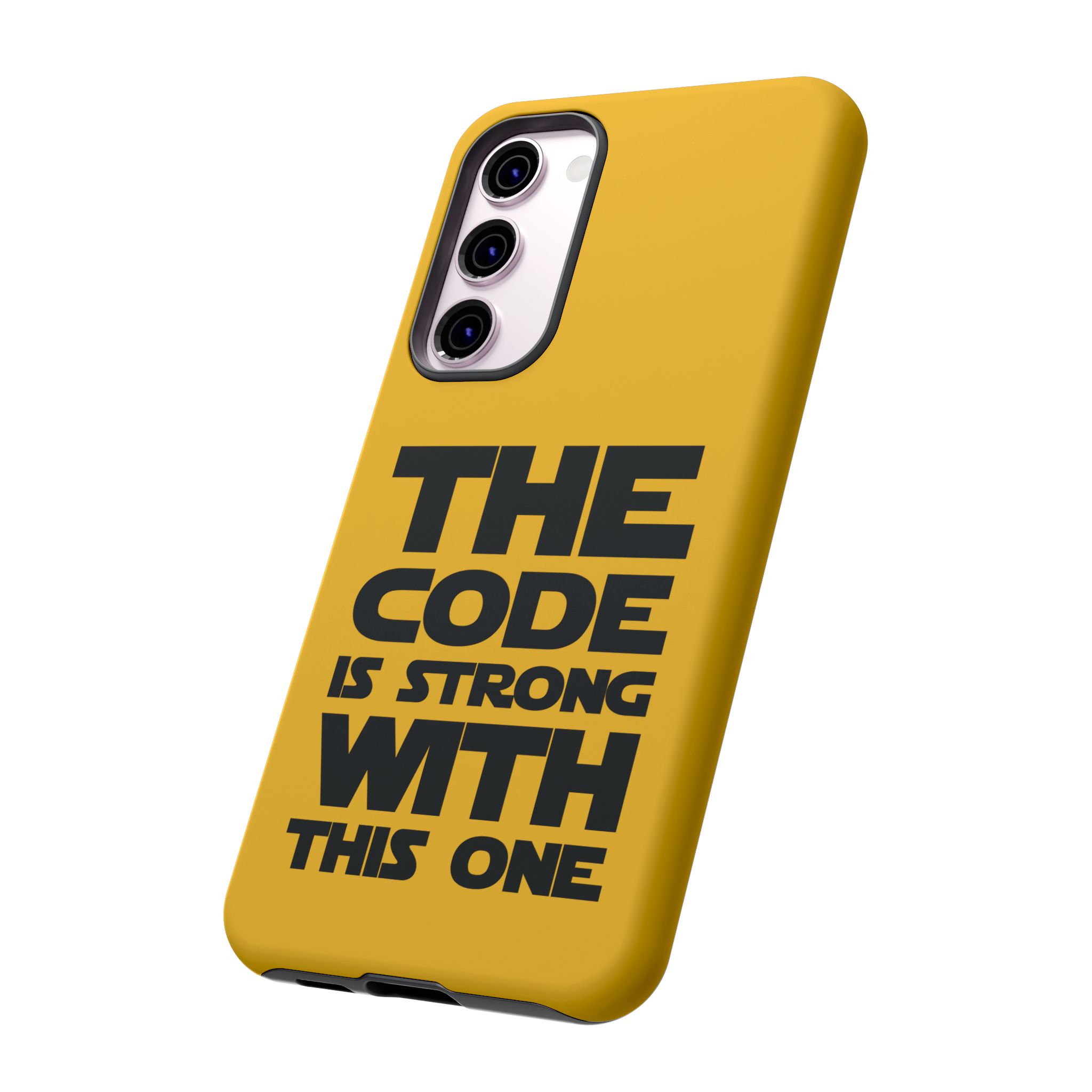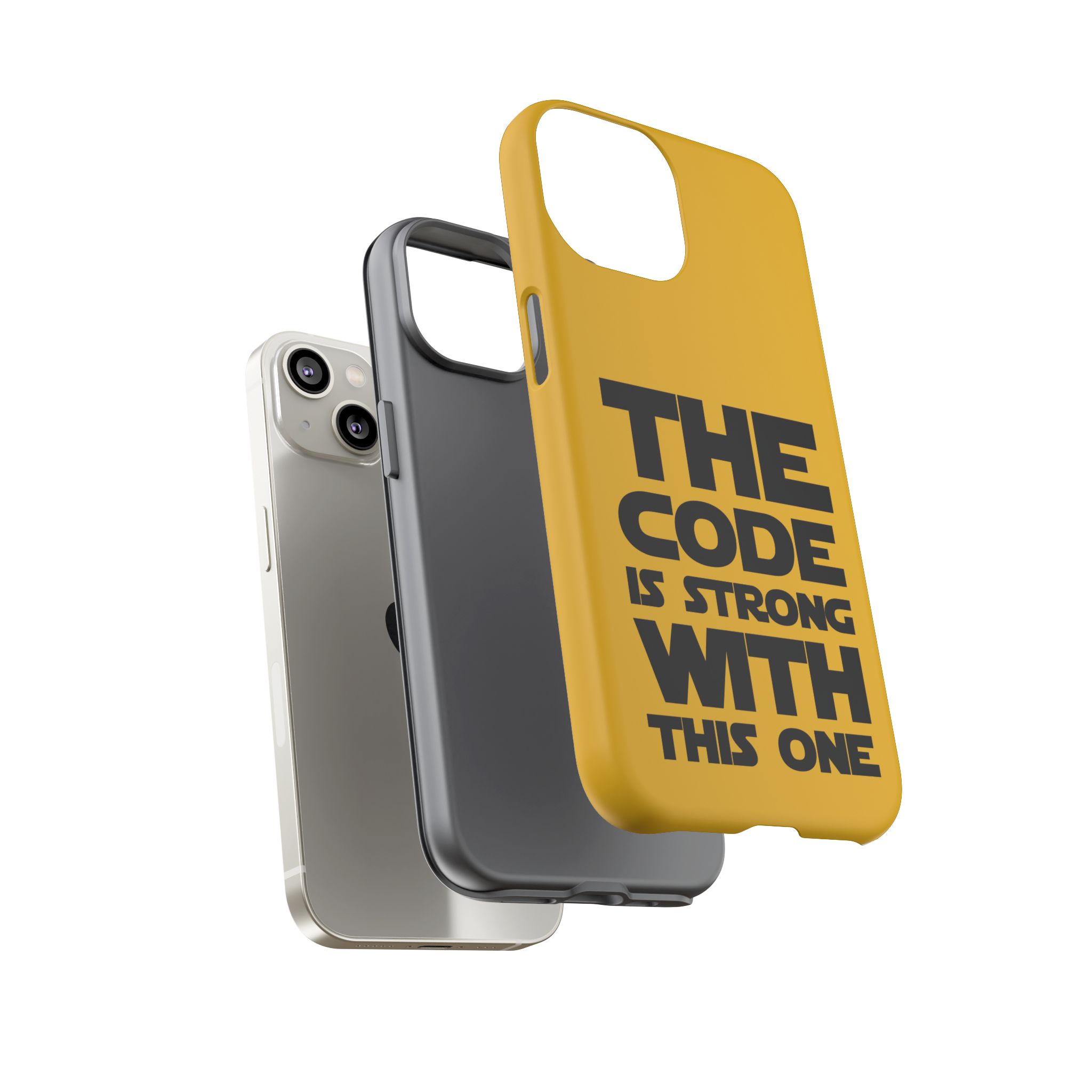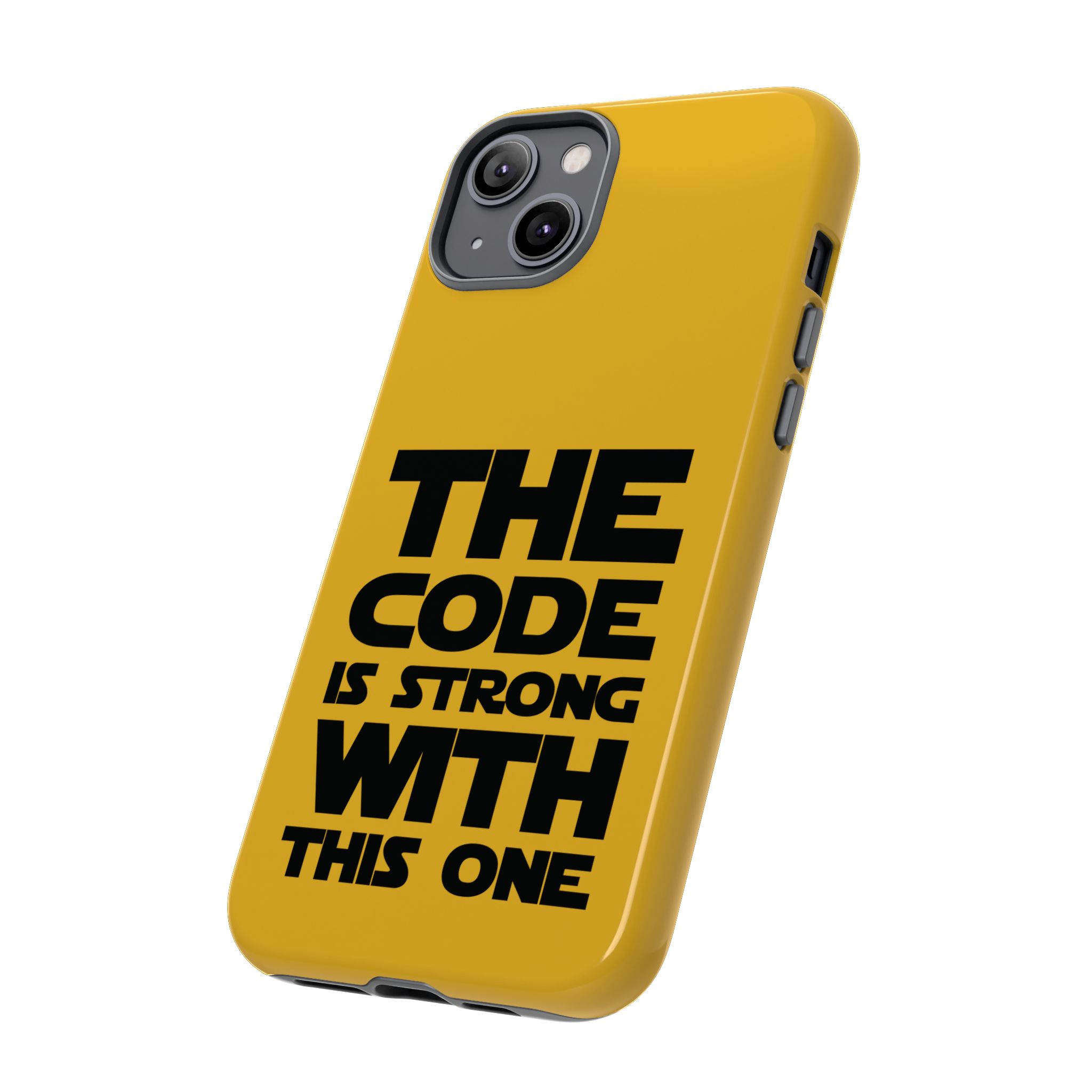 Une coque de téléphone audacieuse et protectrice qui affiche fièrement son côté geek. Un jaune moutarde éclatant habille la coque double couche, tandis qu'un slogan typographique noir net proclame : “ THE CODE IS STRONG WITH THIS ONE ”. La doublure en silicone TPU amortit les chutes et offre une sensation haut de gamme au contact du téléphone. L'impression 3D intégrale préserve l'éclat du message, et la protection UV protège les couleurs en extérieur. Des découpes précises laissent les ports accessibles et la coque est compatible avec la recharge sans fil. Conçue pour résister aux aléas du quotidien d'un développeur – trajets domicile-travail, sessions de travail intensives au café, sessions de débogage nocturnes – elle affiche avec style et assurance.