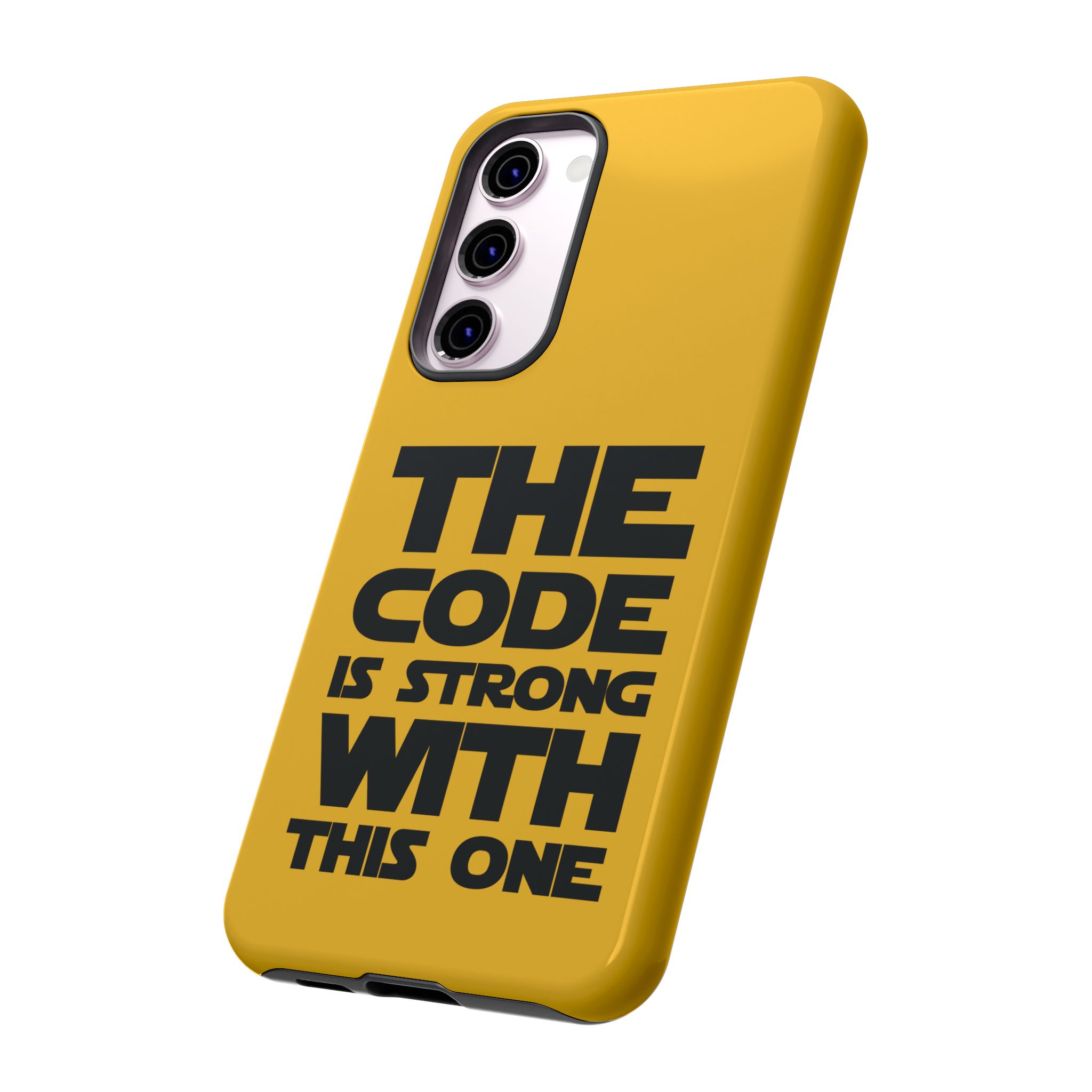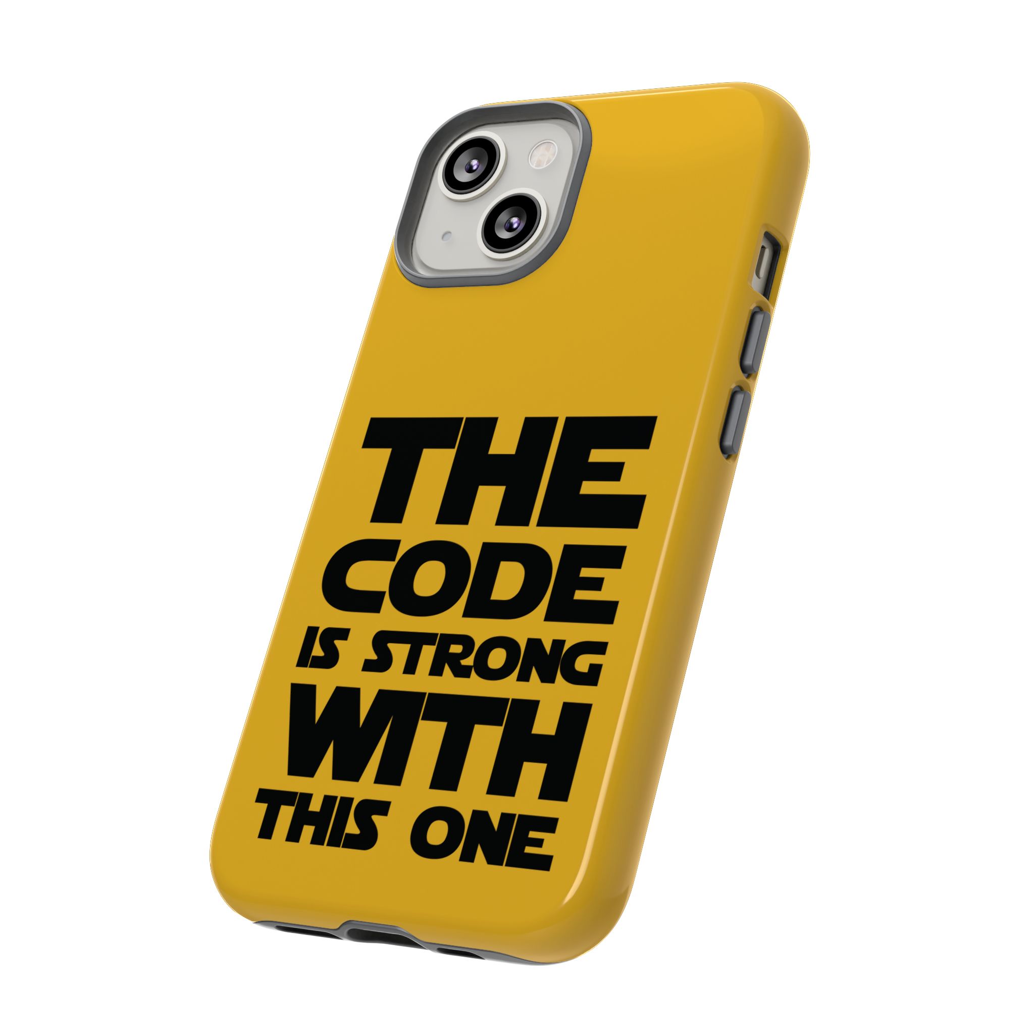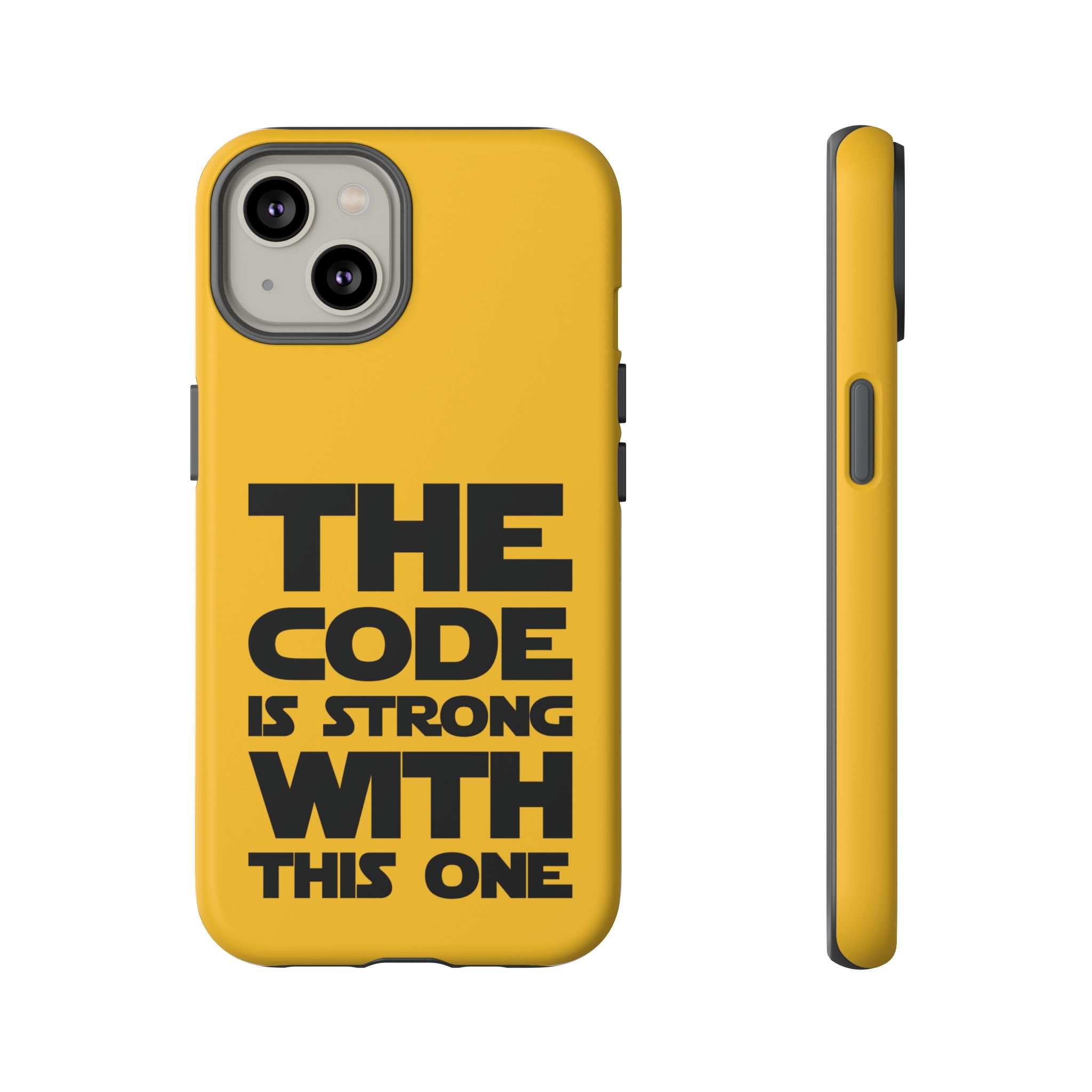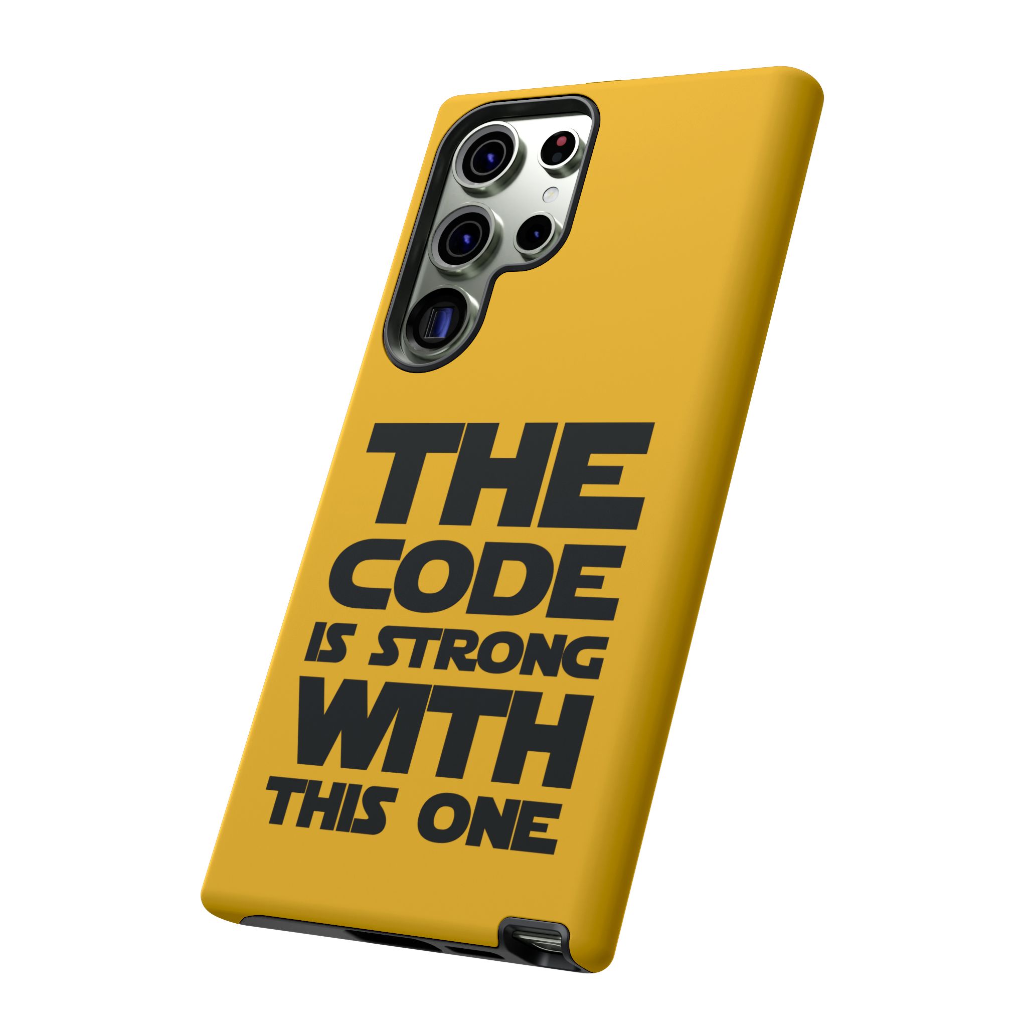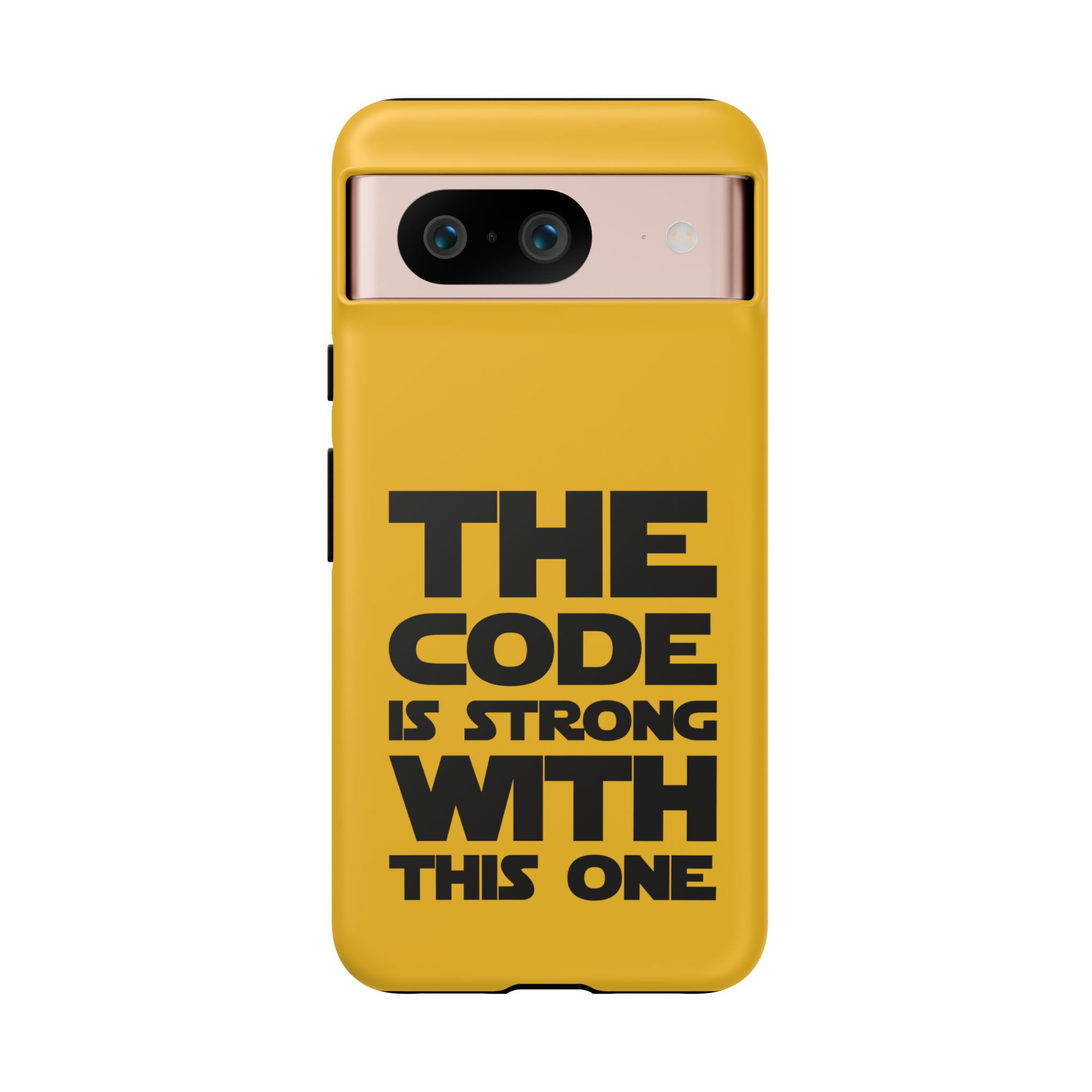 Une coque de téléphone audacieuse et protectrice qui affiche fièrement son côté geek. Un jaune moutarde éclatant habille la coque double couche, tandis qu'un slogan typographique noir net proclame : “ THE CODE IS STRONG WITH THIS ONE ”. La doublure en silicone TPU amortit les chutes et offre une sensation haut de gamme au contact du téléphone. L'impression 3D intégrale préserve l'éclat du message, et la protection UV protège les couleurs en extérieur. Des découpes précises laissent les ports accessibles et la coque est compatible avec la recharge sans fil. Conçue pour résister aux aléas du quotidien d'un développeur – trajets domicile-travail, sessions de travail intensives au café, sessions de débogage nocturnes – elle affiche avec style et assurance.
