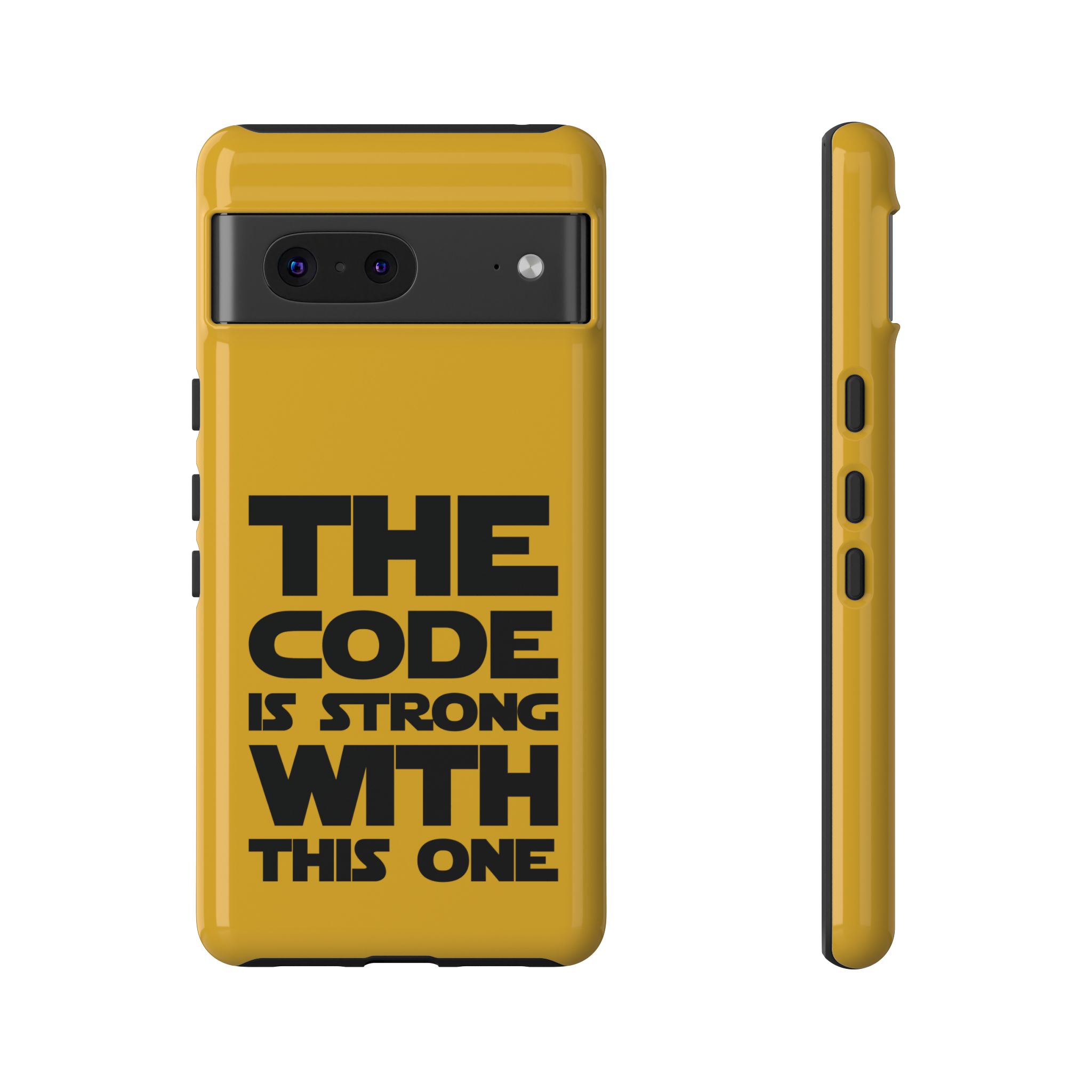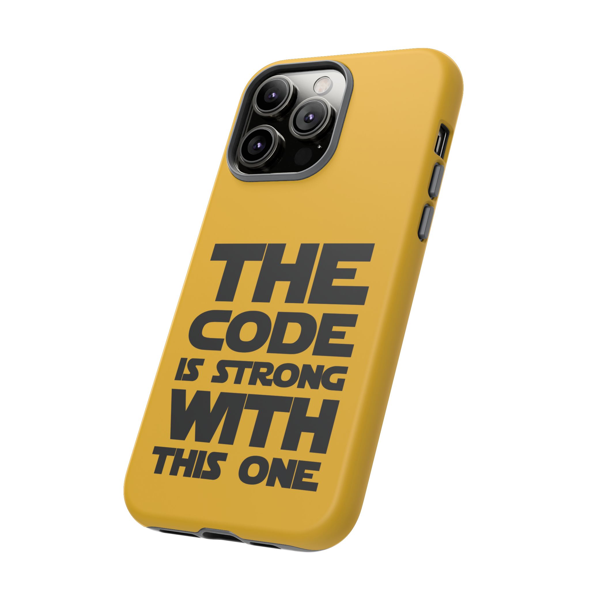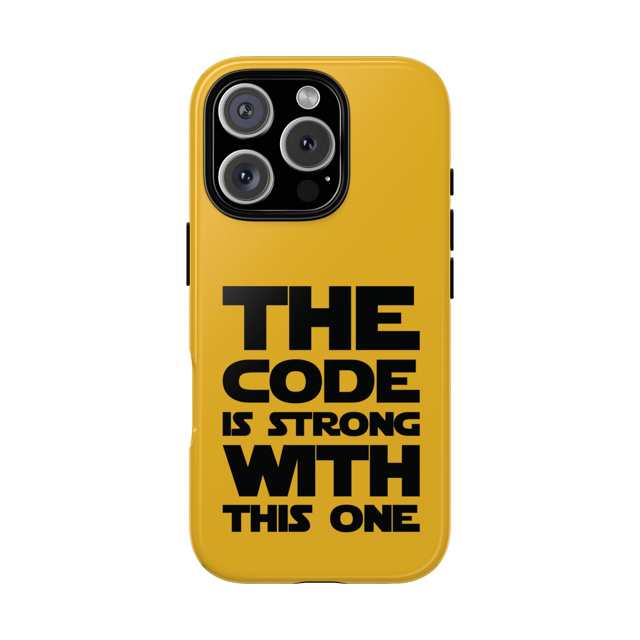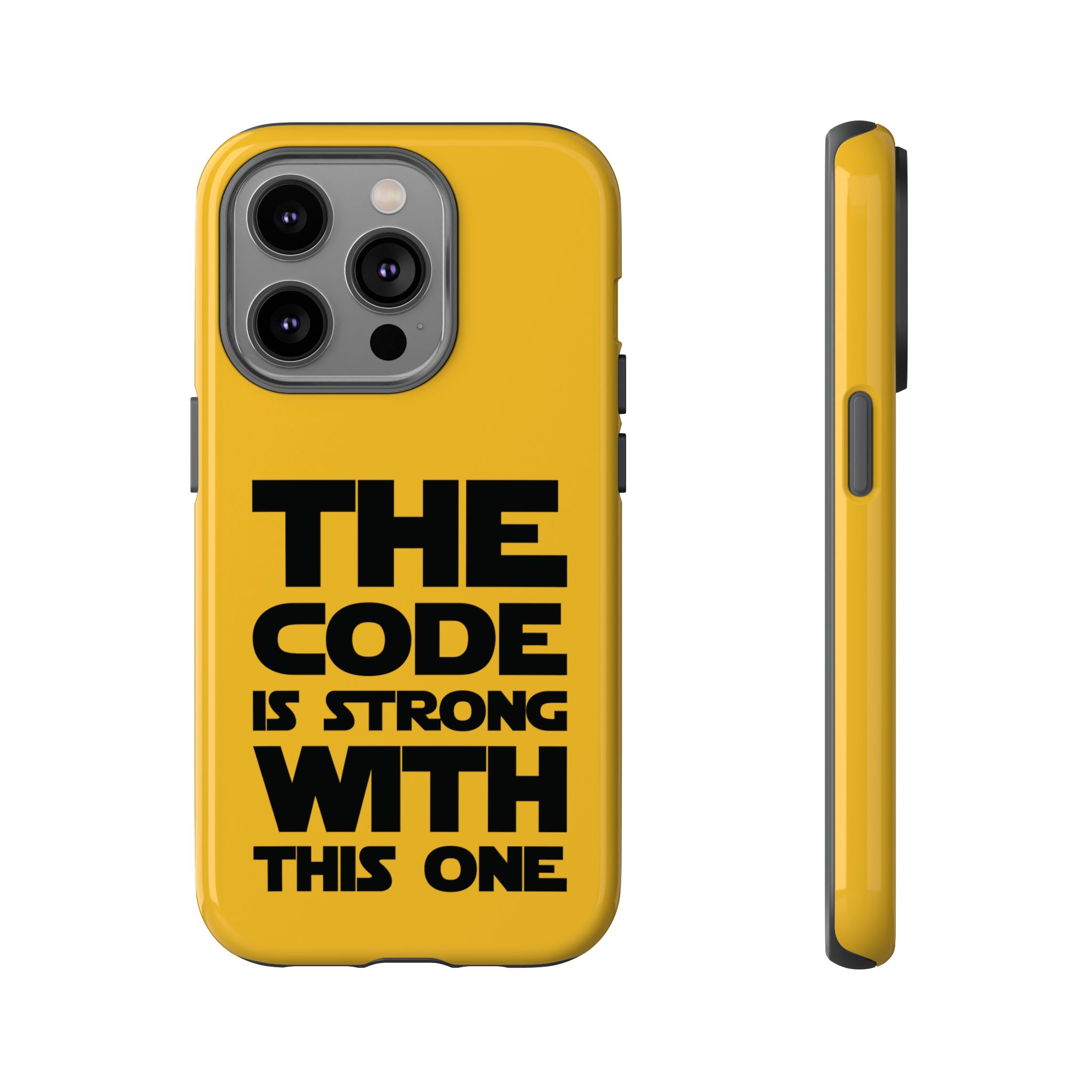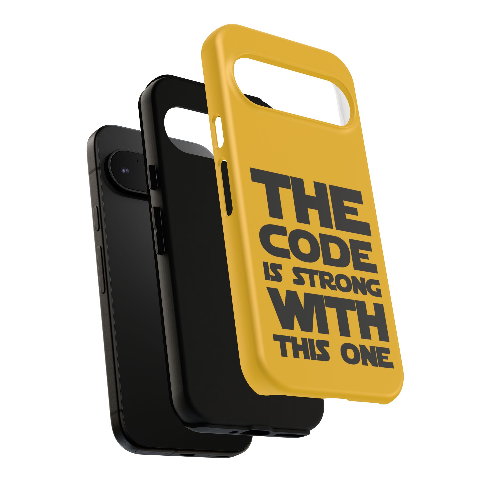 Une coque de téléphone audacieuse et protectrice qui affiche fièrement son côté geek. Un jaune moutarde éclatant habille la coque double couche, tandis qu'un slogan typographique noir net proclame : “ THE CODE IS STRONG WITH THIS ONE ”. La doublure en silicone TPU amortit les chutes et offre une sensation haut de gamme au contact du téléphone. L'impression 3D intégrale préserve l'éclat du message, et la protection UV protège les couleurs en extérieur. Des découpes précises laissent les ports accessibles et la coque est compatible avec la recharge sans fil. Conçue pour résister aux aléas du quotidien d'un développeur – trajets domicile-travail, sessions de travail intensives au café, sessions de débogage nocturnes – elle affiche avec style et assurance.