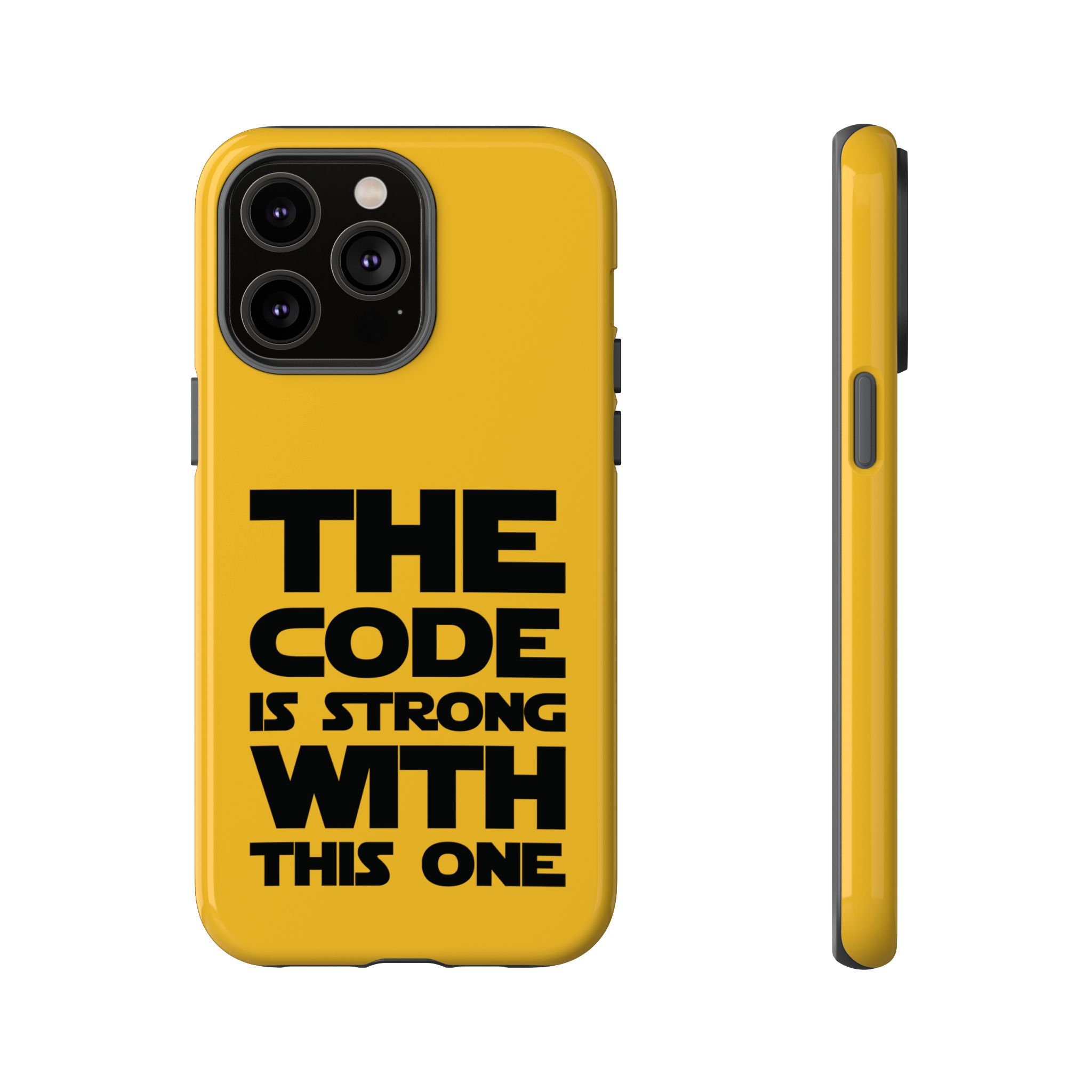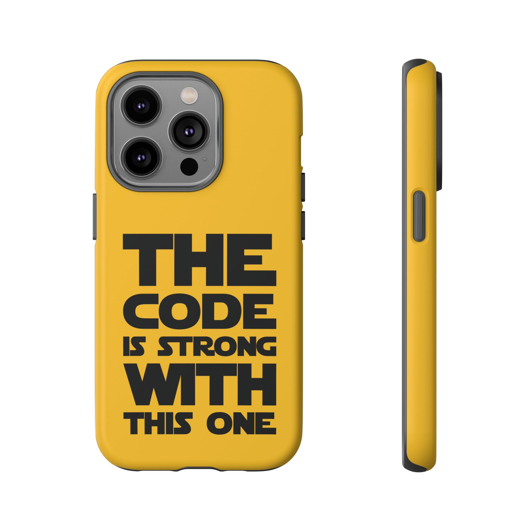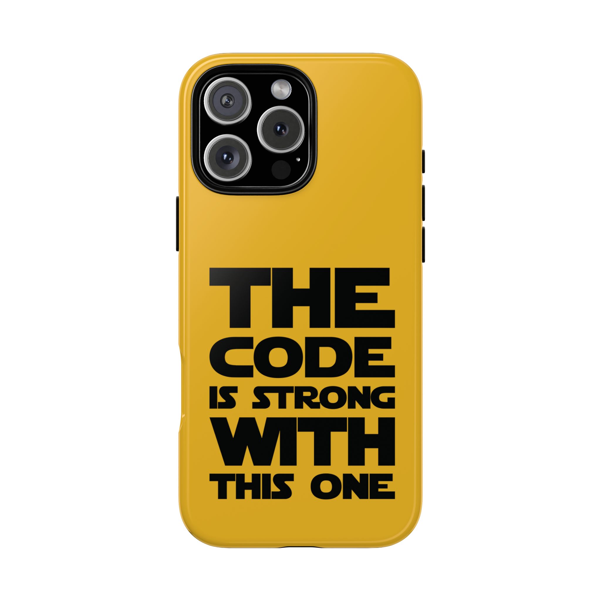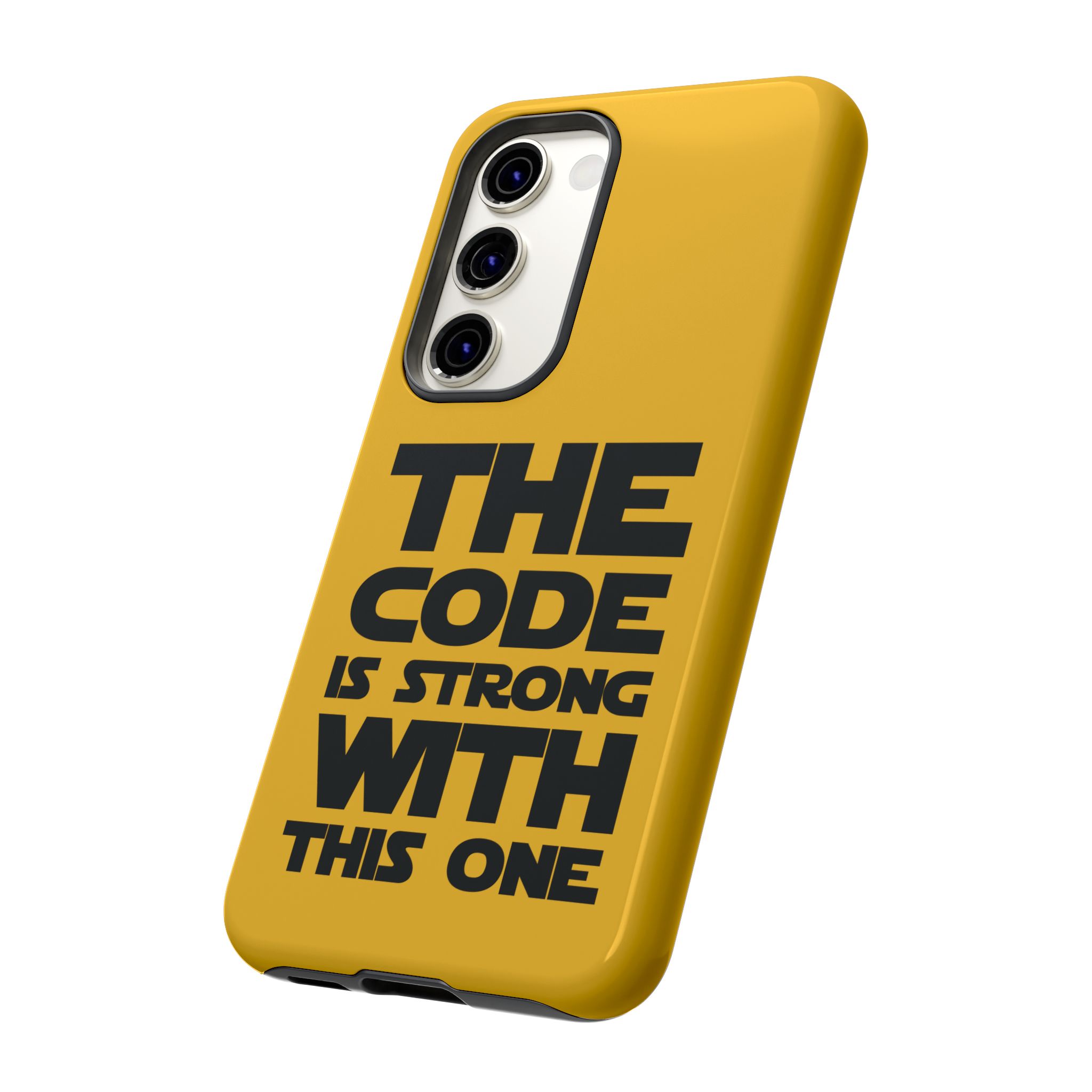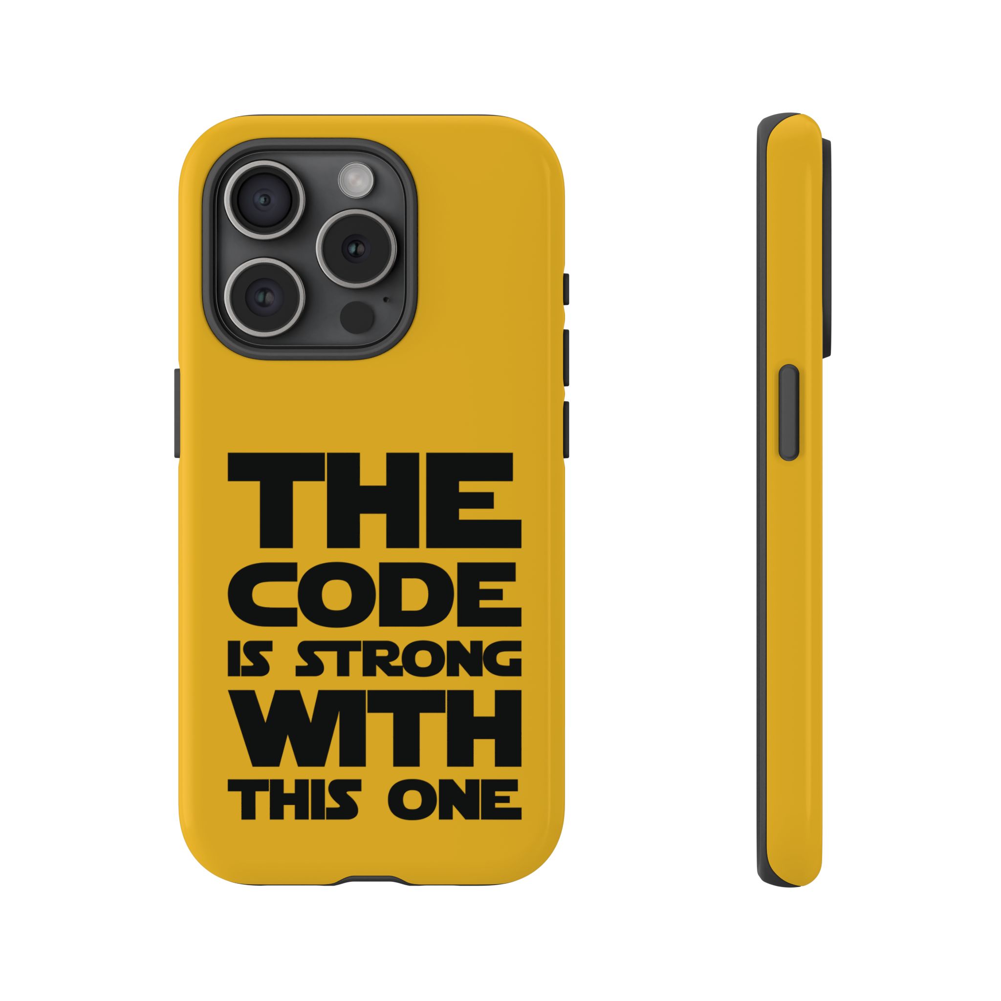 Une coque de téléphone audacieuse et protectrice qui affiche fièrement son côté geek. Un jaune moutarde éclatant habille la coque double couche, tandis qu'un slogan typographique noir net proclame : “ THE CODE IS STRONG WITH THIS ONE ”. La doublure en silicone TPU amortit les chutes et offre une sensation haut de gamme au contact du téléphone. L'impression 3D intégrale préserve l'éclat du message, et la protection UV protège les couleurs en extérieur. Des découpes précises laissent les ports accessibles et la coque est compatible avec la recharge sans fil. Conçue pour résister aux aléas du quotidien d'un développeur – trajets domicile-travail, sessions de travail intensives au café, sessions de débogage nocturnes – elle affiche avec style et assurance.
