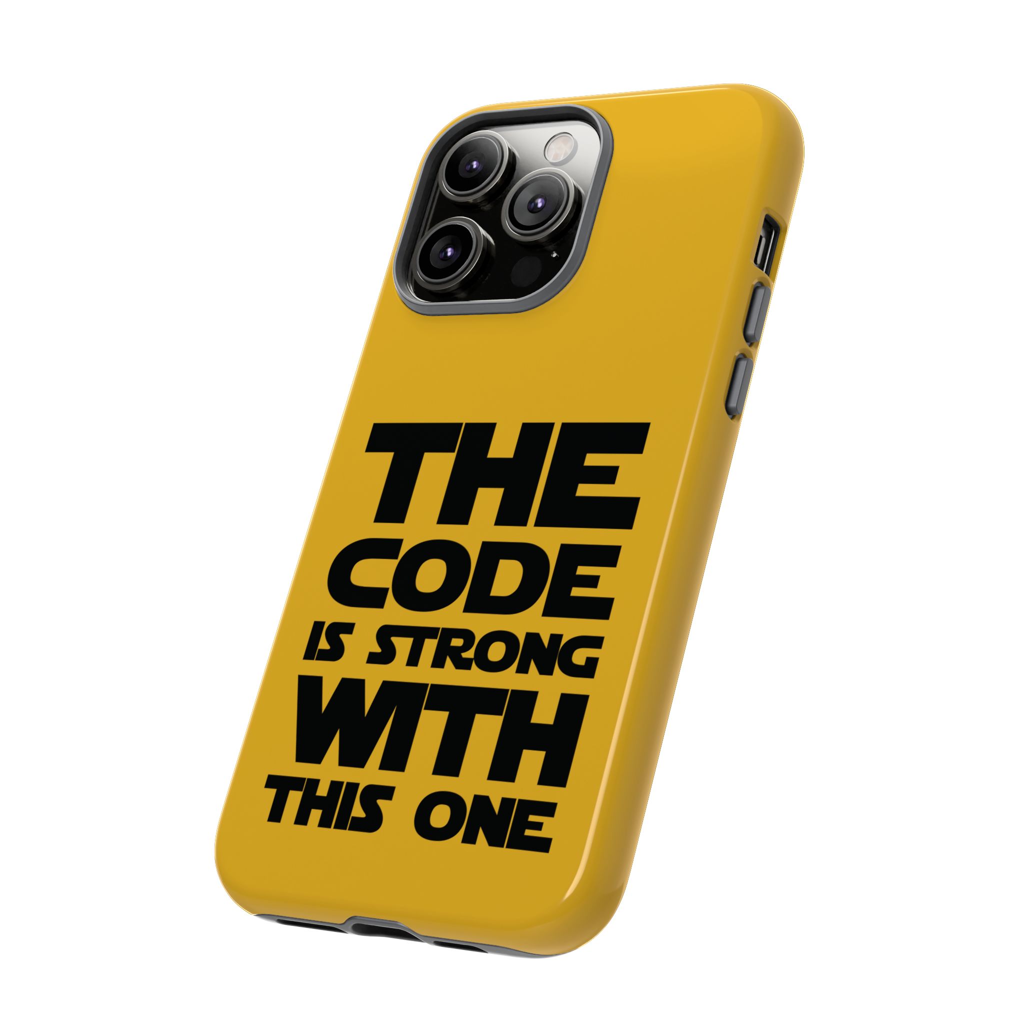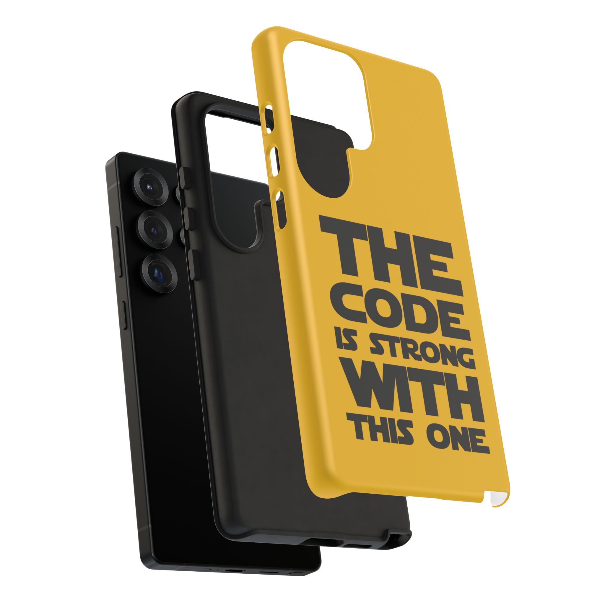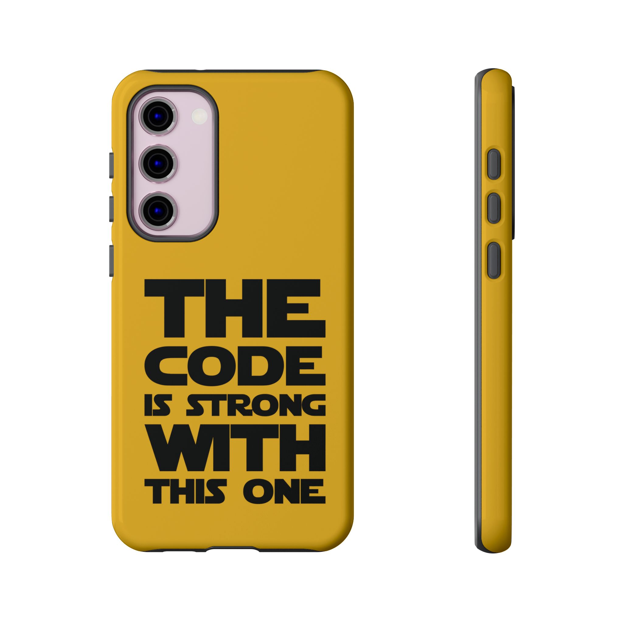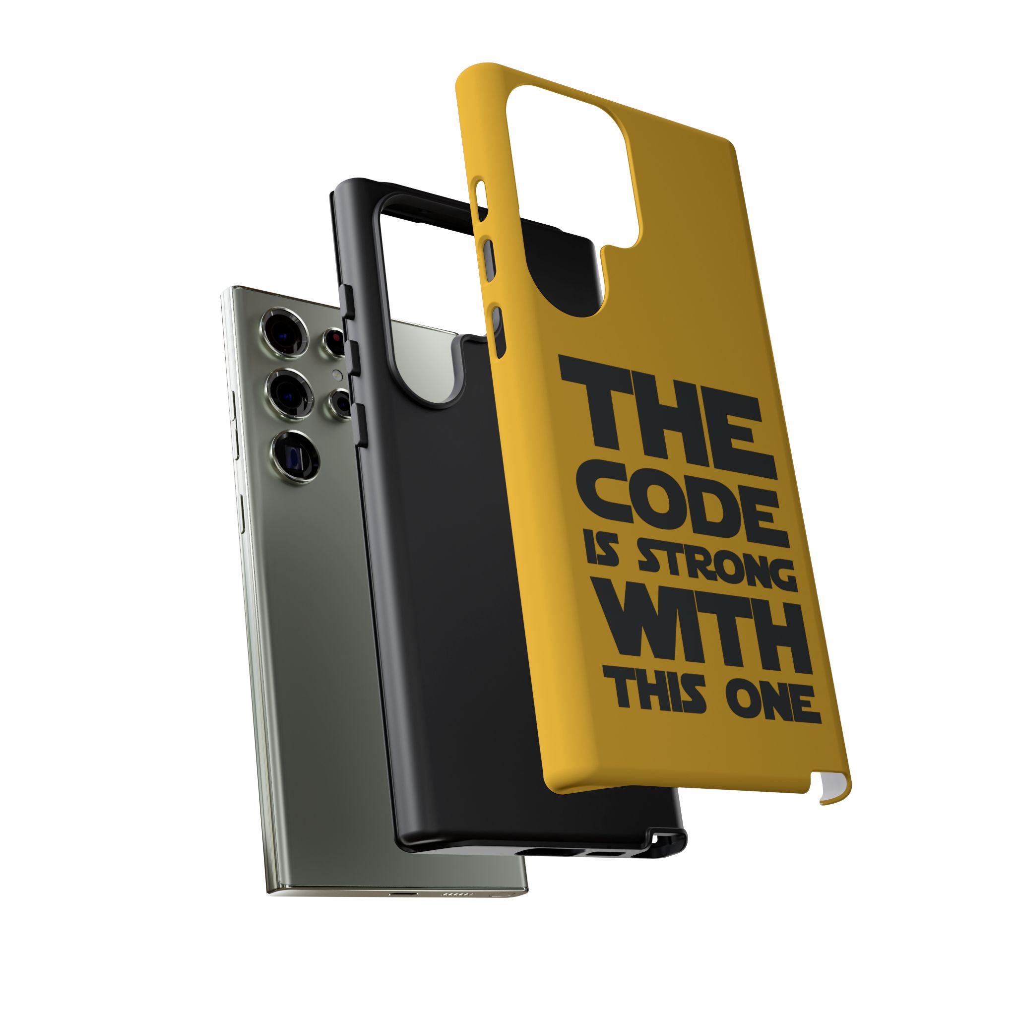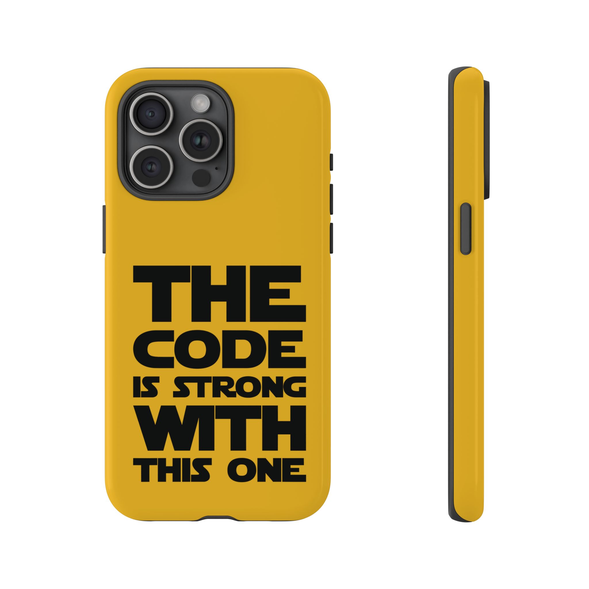 Une coque de téléphone audacieuse et protectrice qui affiche fièrement son côté geek. Un jaune moutarde éclatant habille la coque double couche, tandis qu'un slogan typographique noir net proclame : “ THE CODE IS STRONG WITH THIS ONE ”. La doublure en silicone TPU amortit les chutes et offre une sensation haut de gamme au contact du téléphone. L'impression 3D intégrale préserve l'éclat du message, et la protection UV protège les couleurs en extérieur. Des découpes précises laissent les ports accessibles et la coque est compatible avec la recharge sans fil. Conçue pour résister aux aléas du quotidien d'un développeur – trajets domicile-travail, sessions de travail intensives au café, sessions de débogage nocturnes – elle affiche avec style et assurance.