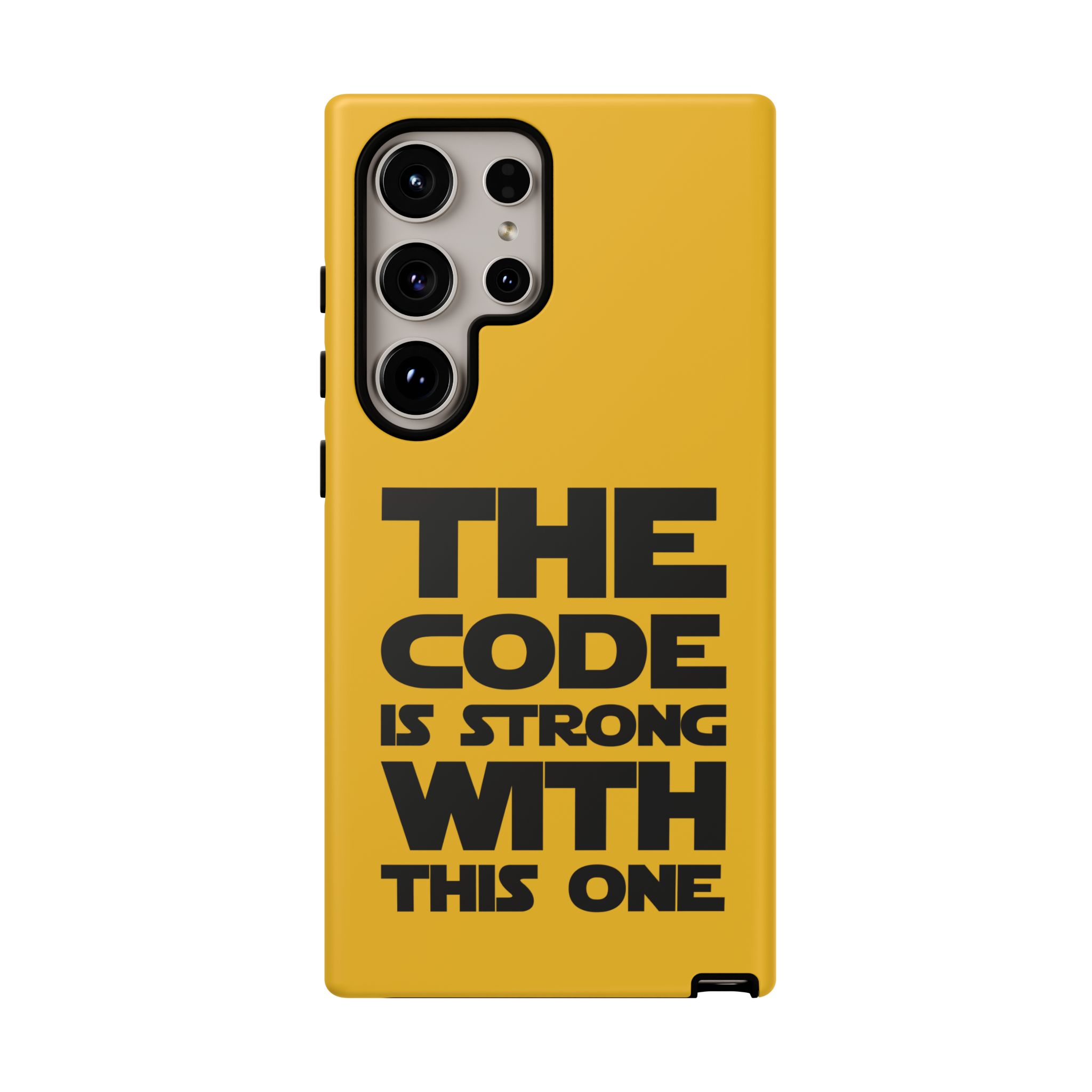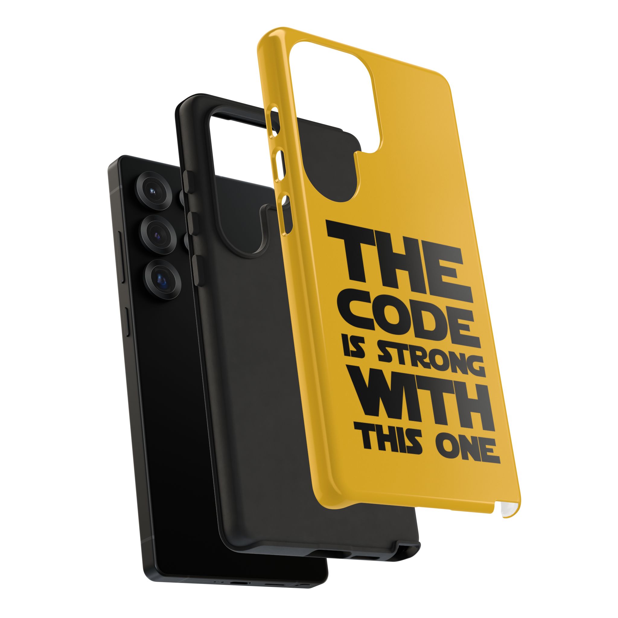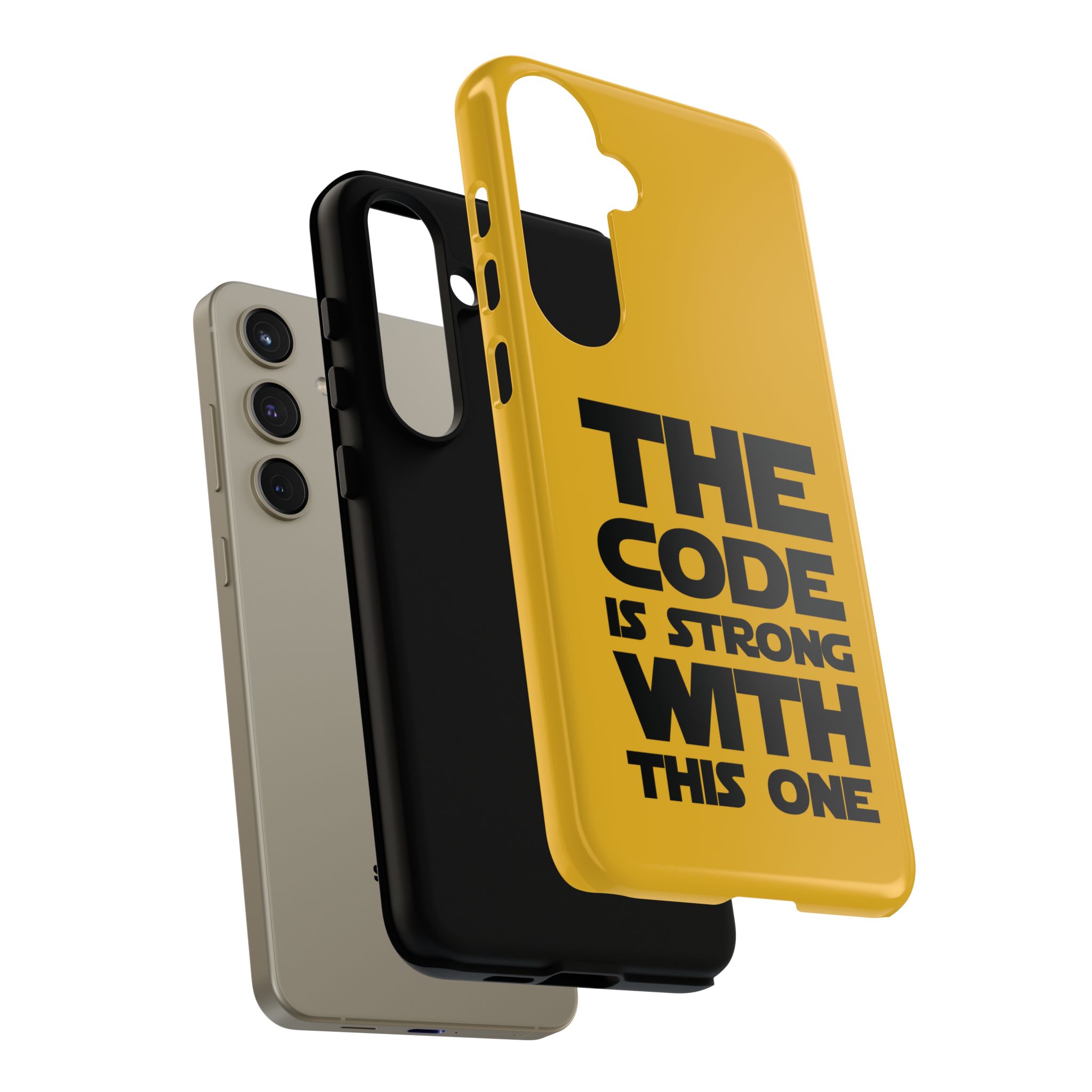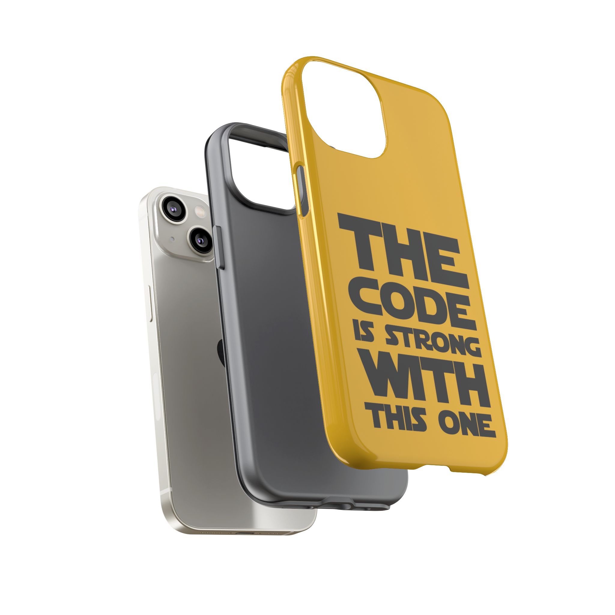 Une coque de téléphone audacieuse et protectrice qui affiche fièrement son côté geek. Un jaune moutarde éclatant habille la coque double couche, tandis qu'un slogan typographique noir net proclame : “ THE CODE IS STRONG WITH THIS ONE ”. La doublure en silicone TPU amortit les chutes et offre une sensation haut de gamme au contact du téléphone. L'impression 3D intégrale préserve l'éclat du message, et la protection UV protège les couleurs en extérieur. Des découpes précises laissent les ports accessibles et la coque est compatible avec la recharge sans fil. Conçue pour résister aux aléas du quotidien d'un développeur – trajets domicile-travail, sessions de travail intensives au café, sessions de débogage nocturnes – elle affiche avec style et assurance.