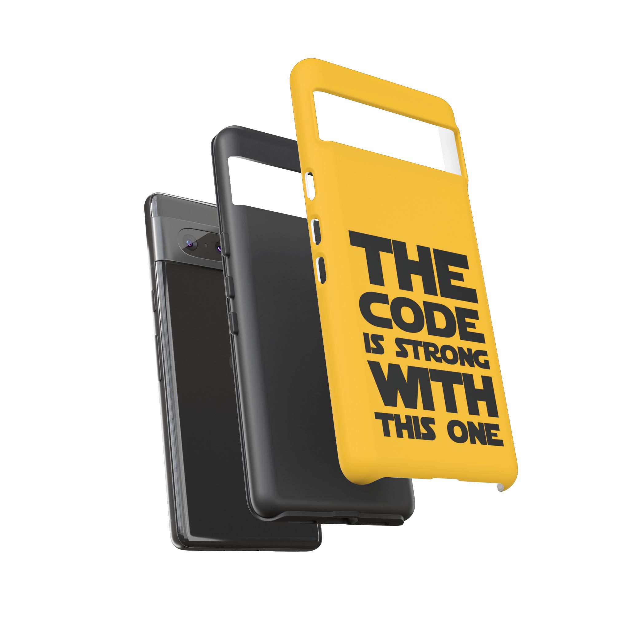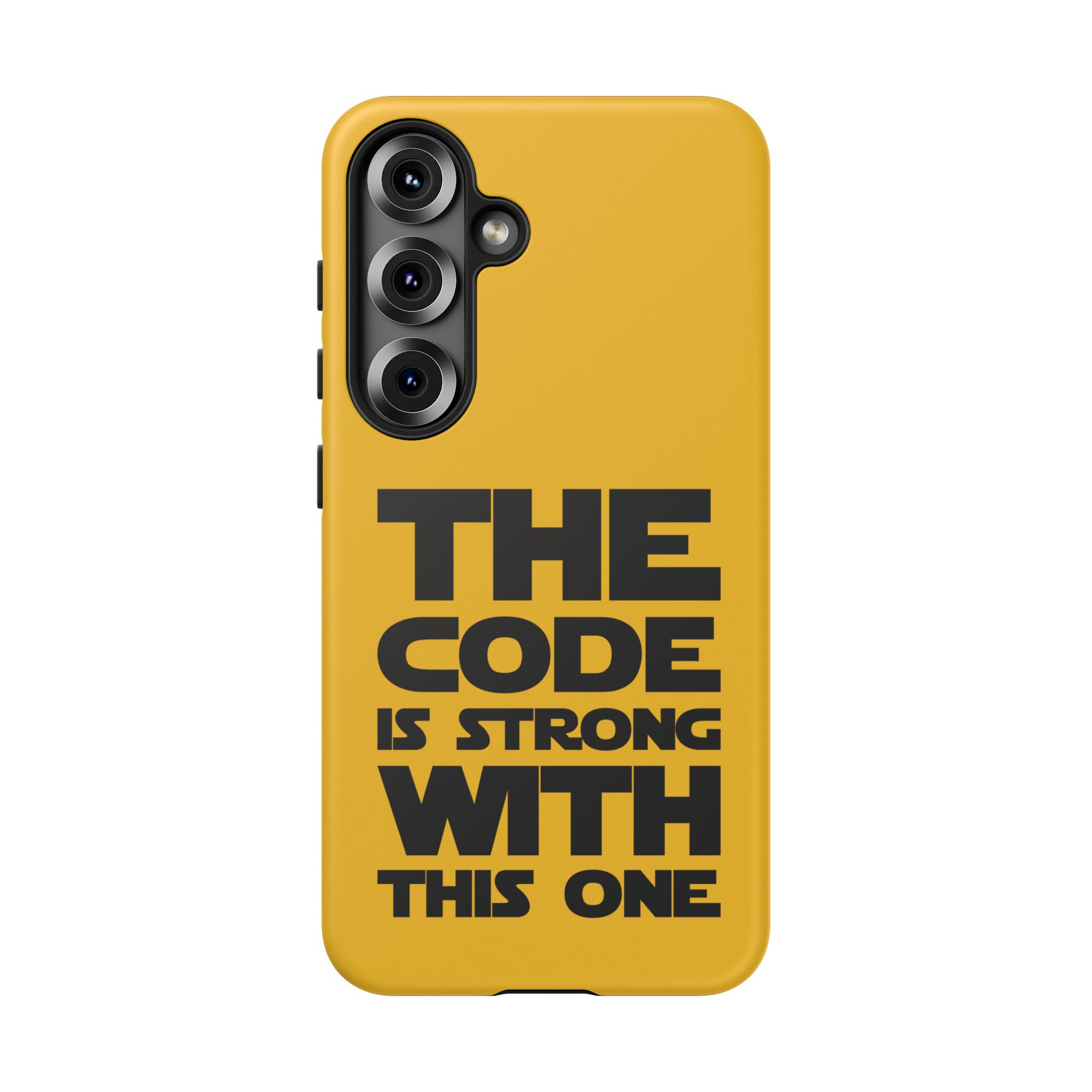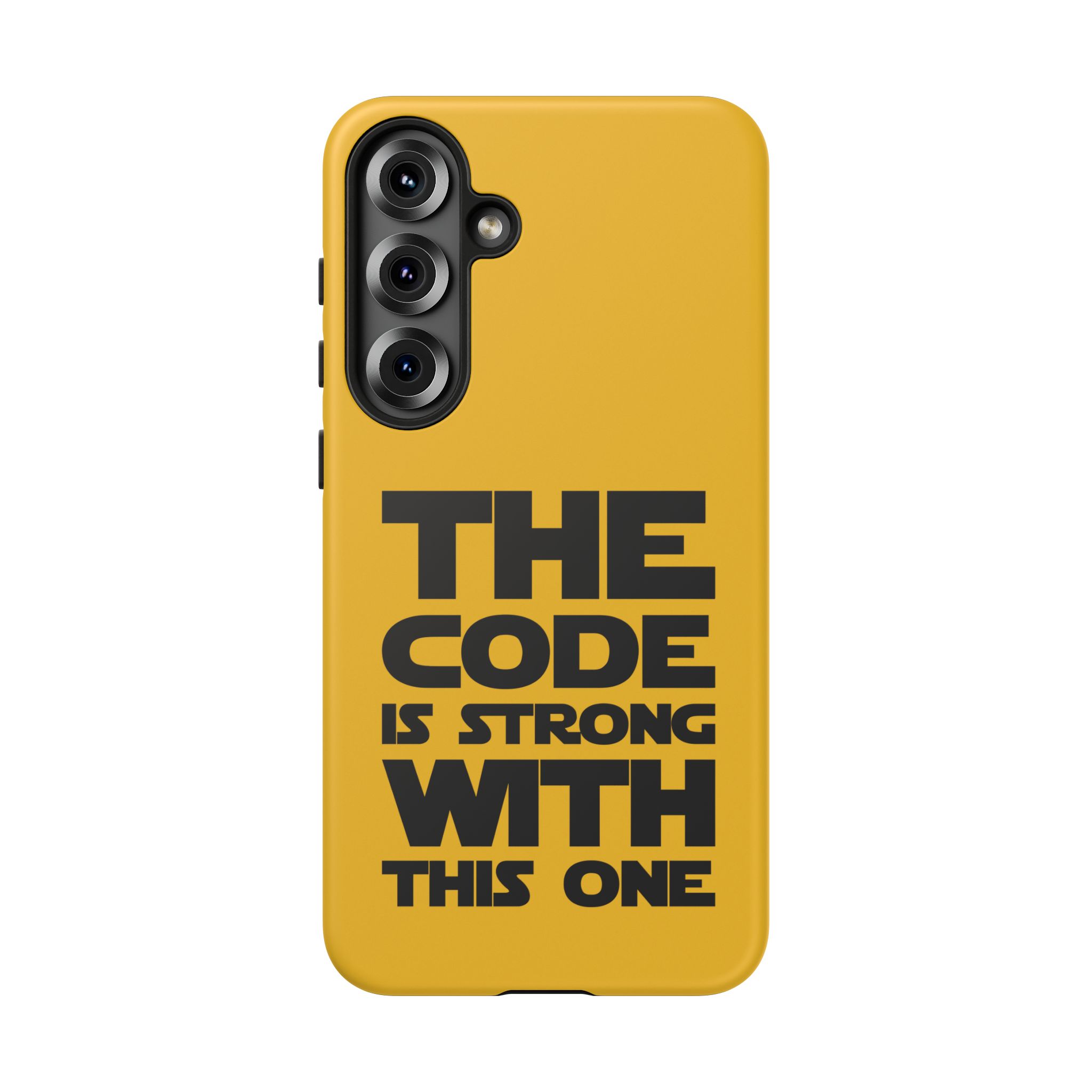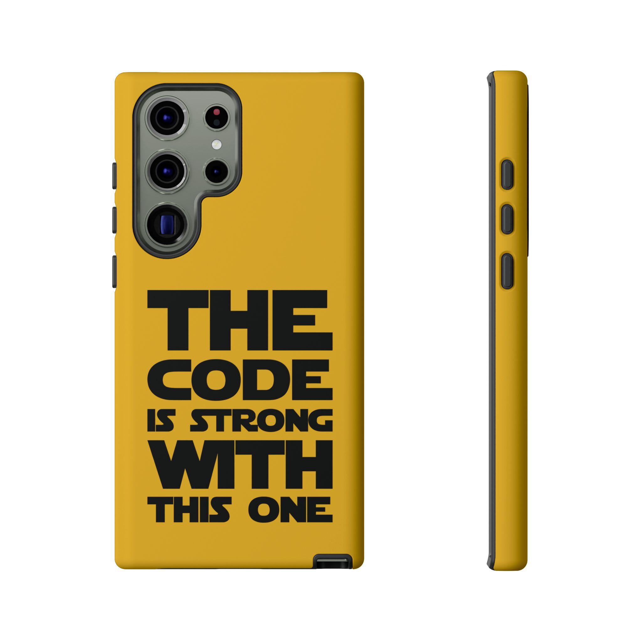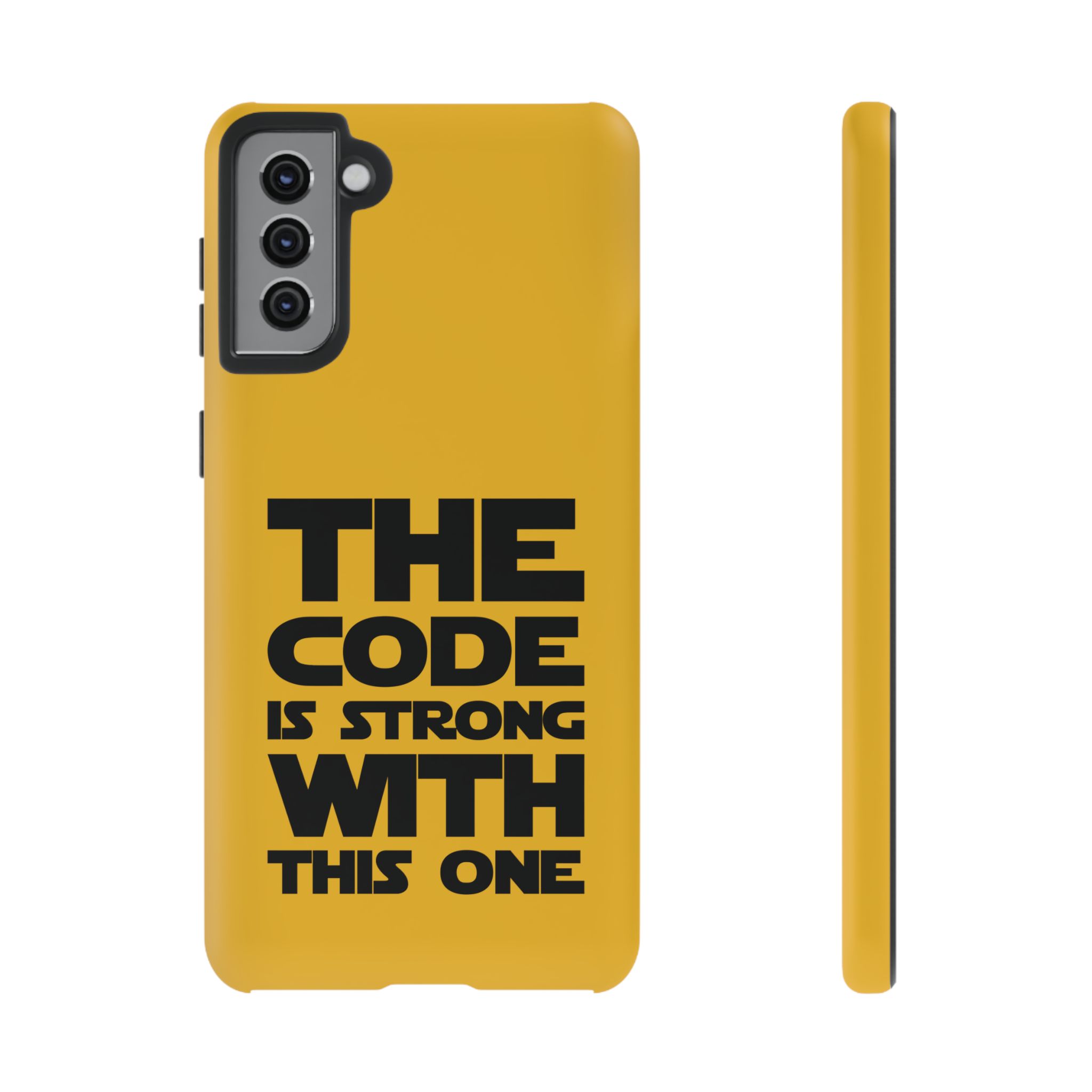 Une coque de téléphone audacieuse et protectrice qui affiche fièrement son côté geek. Un jaune moutarde éclatant habille la coque double couche, tandis qu'un slogan typographique noir net proclame : “ THE CODE IS STRONG WITH THIS ONE ”. La doublure en silicone TPU amortit les chutes et offre une sensation haut de gamme au contact du téléphone. L'impression 3D intégrale préserve l'éclat du message, et la protection UV protège les couleurs en extérieur. Des découpes précises laissent les ports accessibles et la coque est compatible avec la recharge sans fil. Conçue pour résister aux aléas du quotidien d'un développeur – trajets domicile-travail, sessions de travail intensives au café, sessions de débogage nocturnes – elle affiche avec style et assurance.