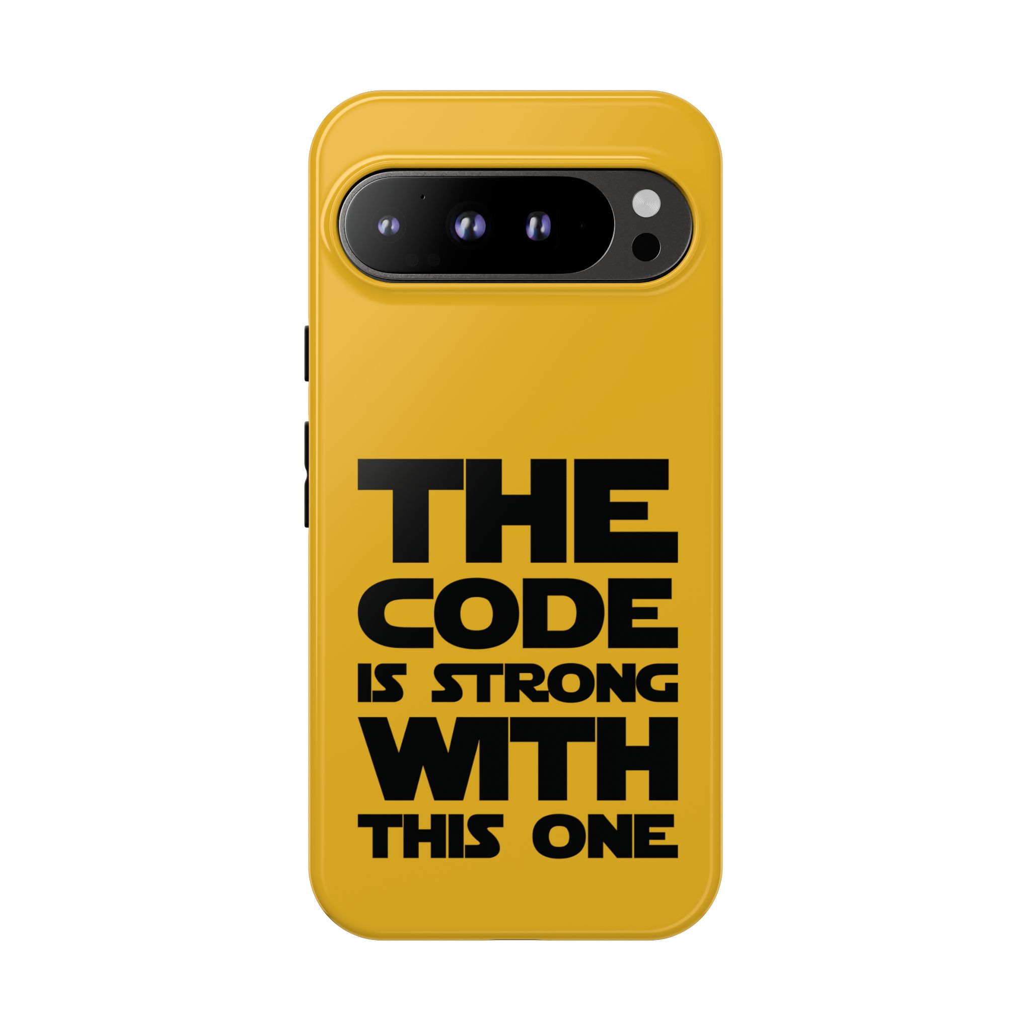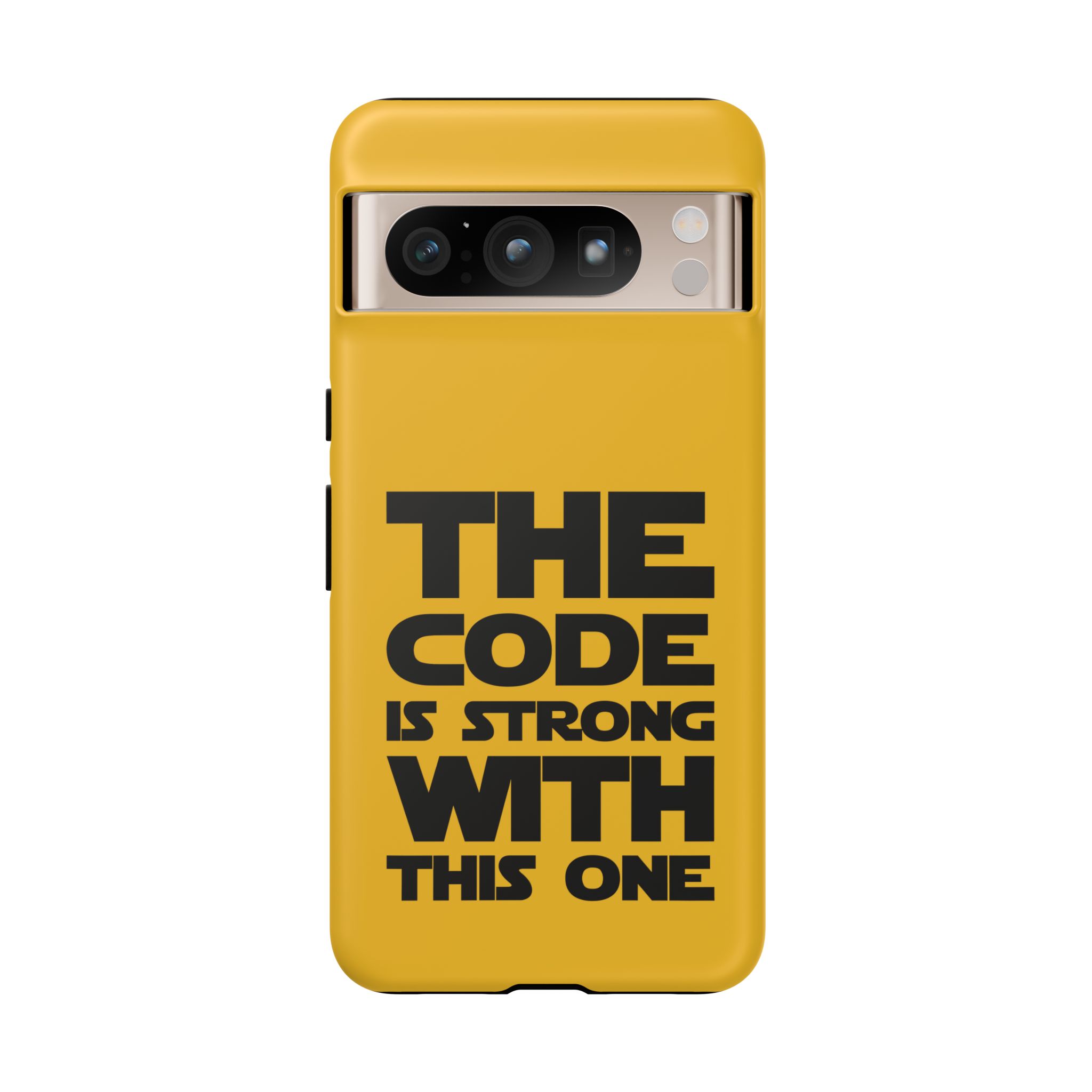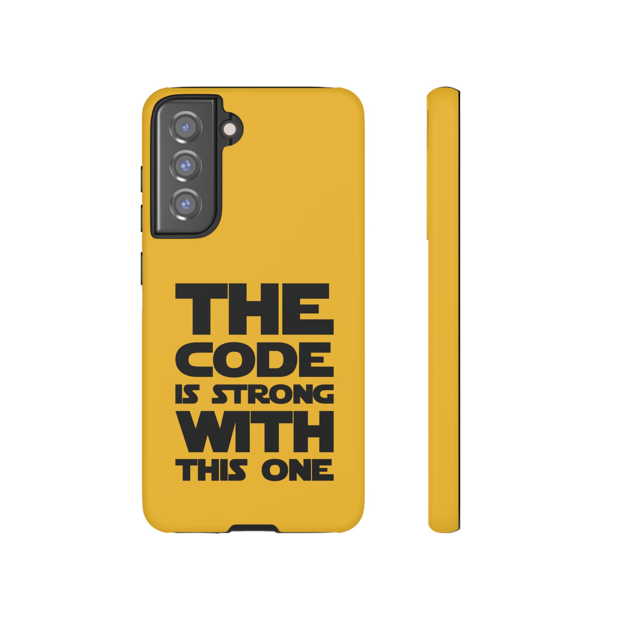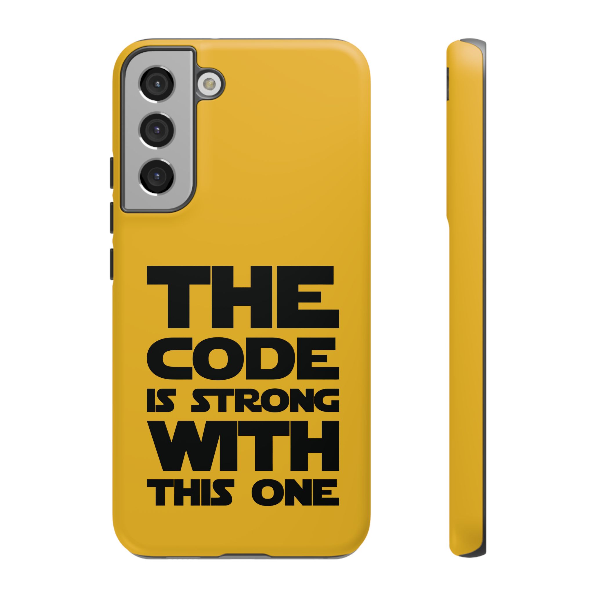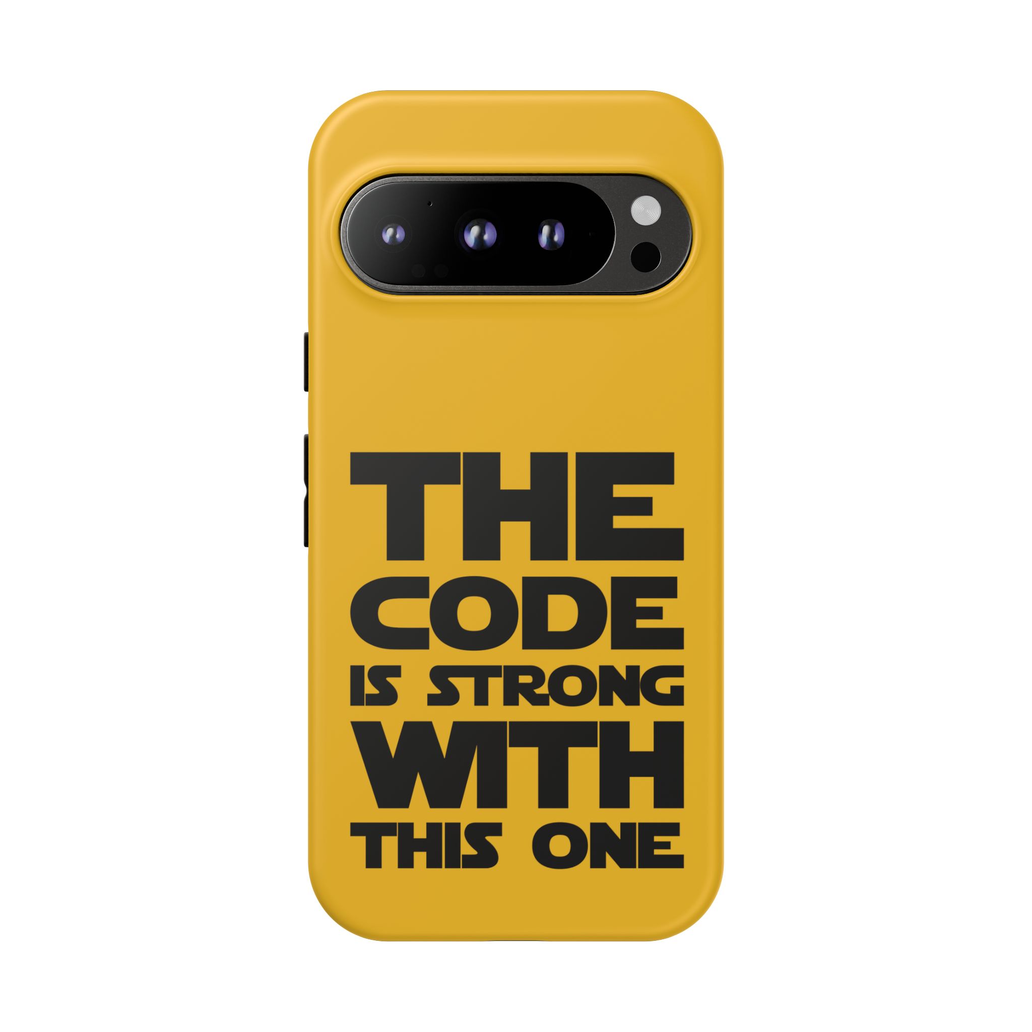 Une coque de téléphone audacieuse et protectrice qui affiche fièrement son côté geek. Un jaune moutarde éclatant habille la coque double couche, tandis qu'un slogan typographique noir net proclame : “ THE CODE IS STRONG WITH THIS ONE ”. La doublure en silicone TPU amortit les chutes et offre une sensation haut de gamme au contact du téléphone. L'impression 3D intégrale préserve l'éclat du message, et la protection UV protège les couleurs en extérieur. Des découpes précises laissent les ports accessibles et la coque est compatible avec la recharge sans fil. Conçue pour résister aux aléas du quotidien d'un développeur – trajets domicile-travail, sessions de travail intensives au café, sessions de débogage nocturnes – elle affiche avec style et assurance.