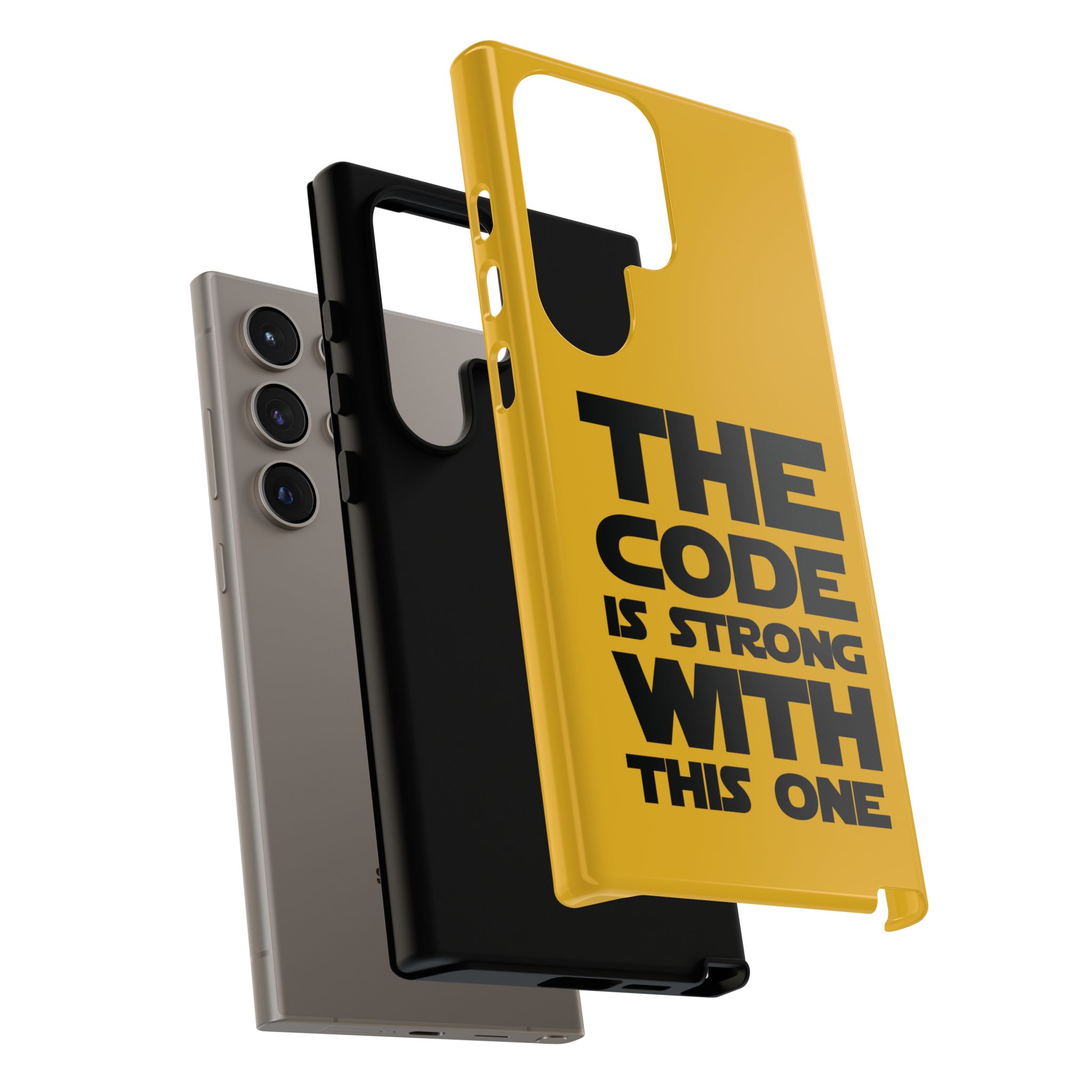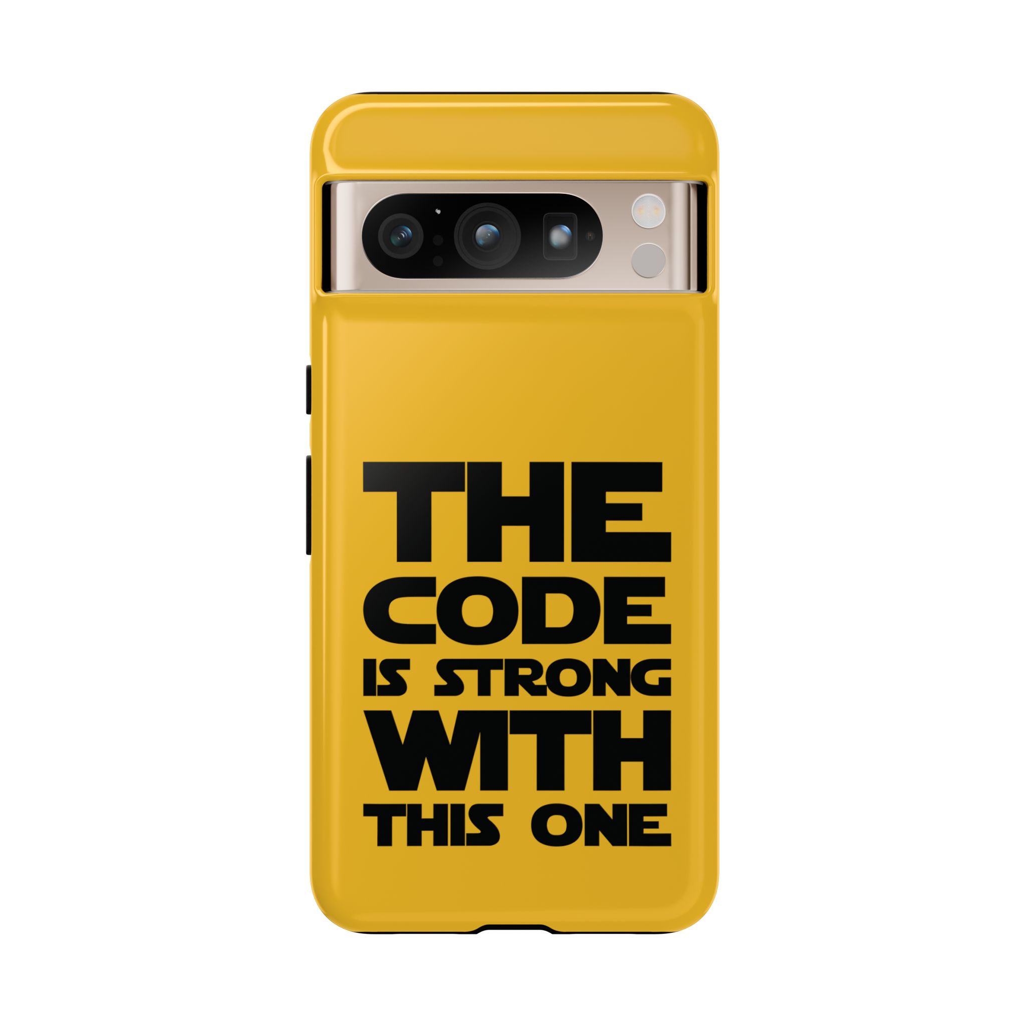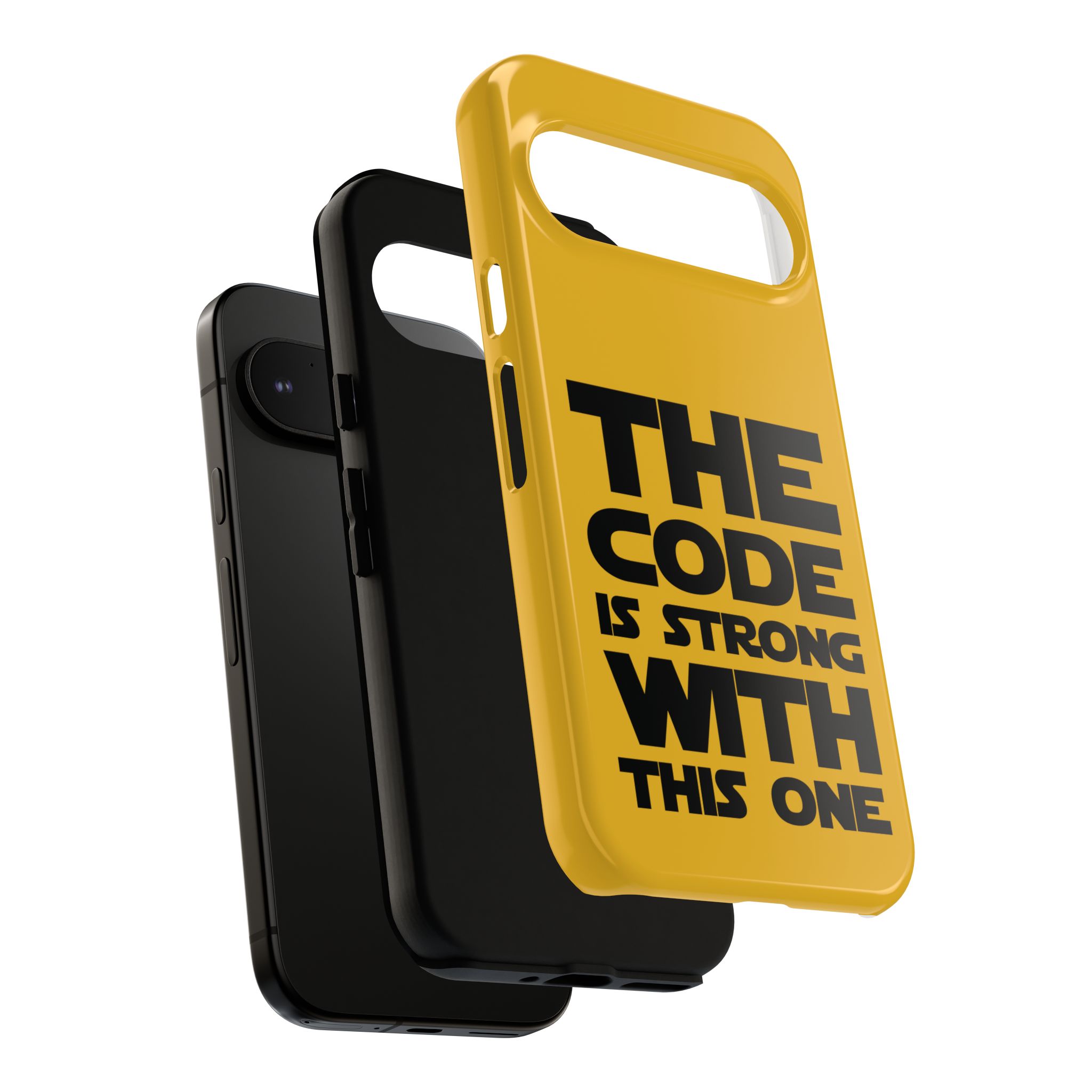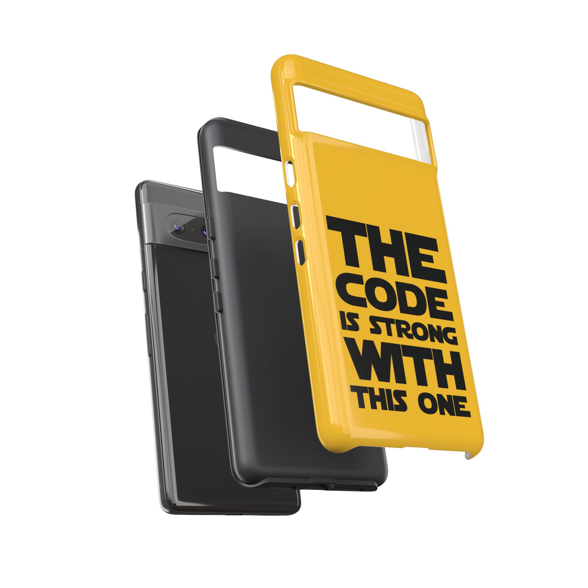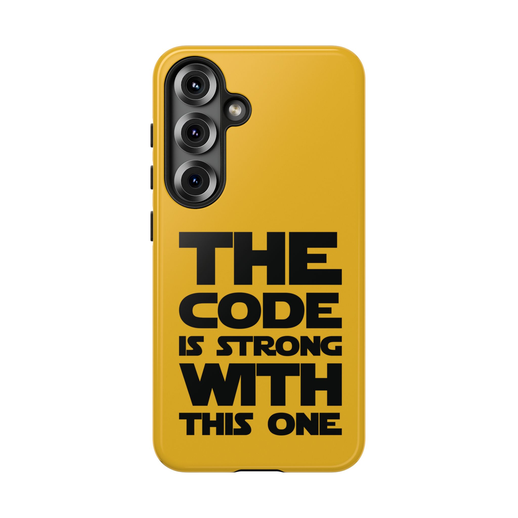 Une coque de téléphone audacieuse et protectrice qui affiche fièrement son côté geek. Un jaune moutarde éclatant habille la coque double couche, tandis qu'un slogan typographique noir net proclame : “ THE CODE IS STRONG WITH THIS ONE ”. La doublure en silicone TPU amortit les chutes et offre une sensation haut de gamme au contact du téléphone. L'impression 3D intégrale préserve l'éclat du message, et la protection UV protège les couleurs en extérieur. Des découpes précises laissent les ports accessibles et la coque est compatible avec la recharge sans fil. Conçue pour résister aux aléas du quotidien d'un développeur – trajets domicile-travail, sessions de travail intensives au café, sessions de débogage nocturnes – elle affiche avec style et assurance.