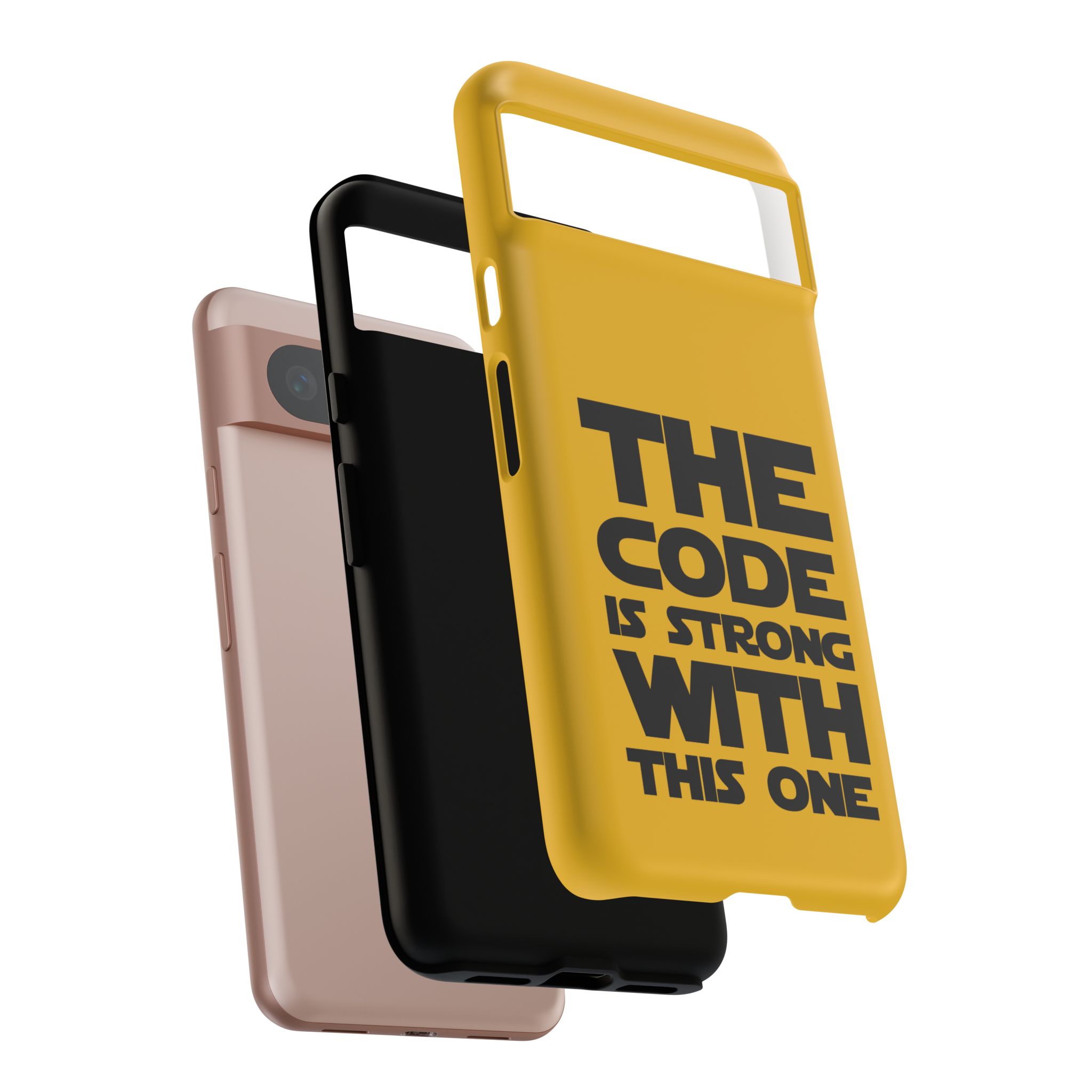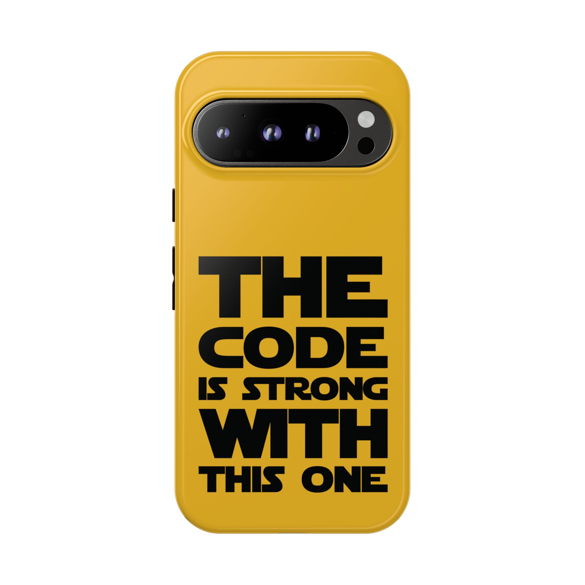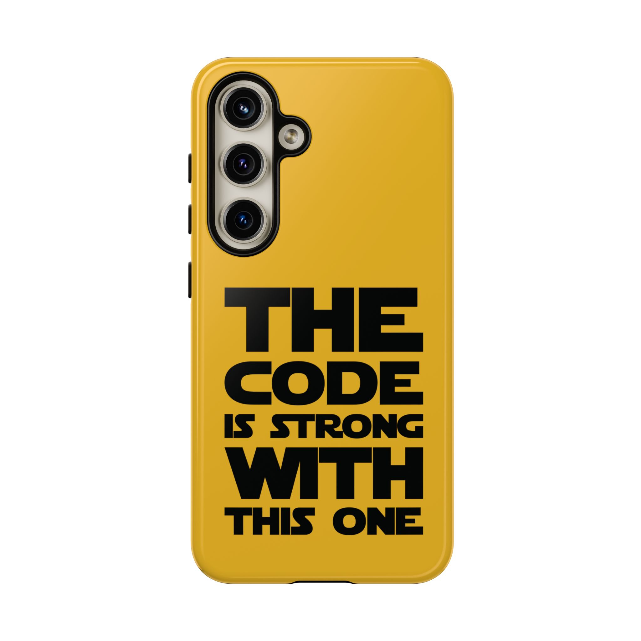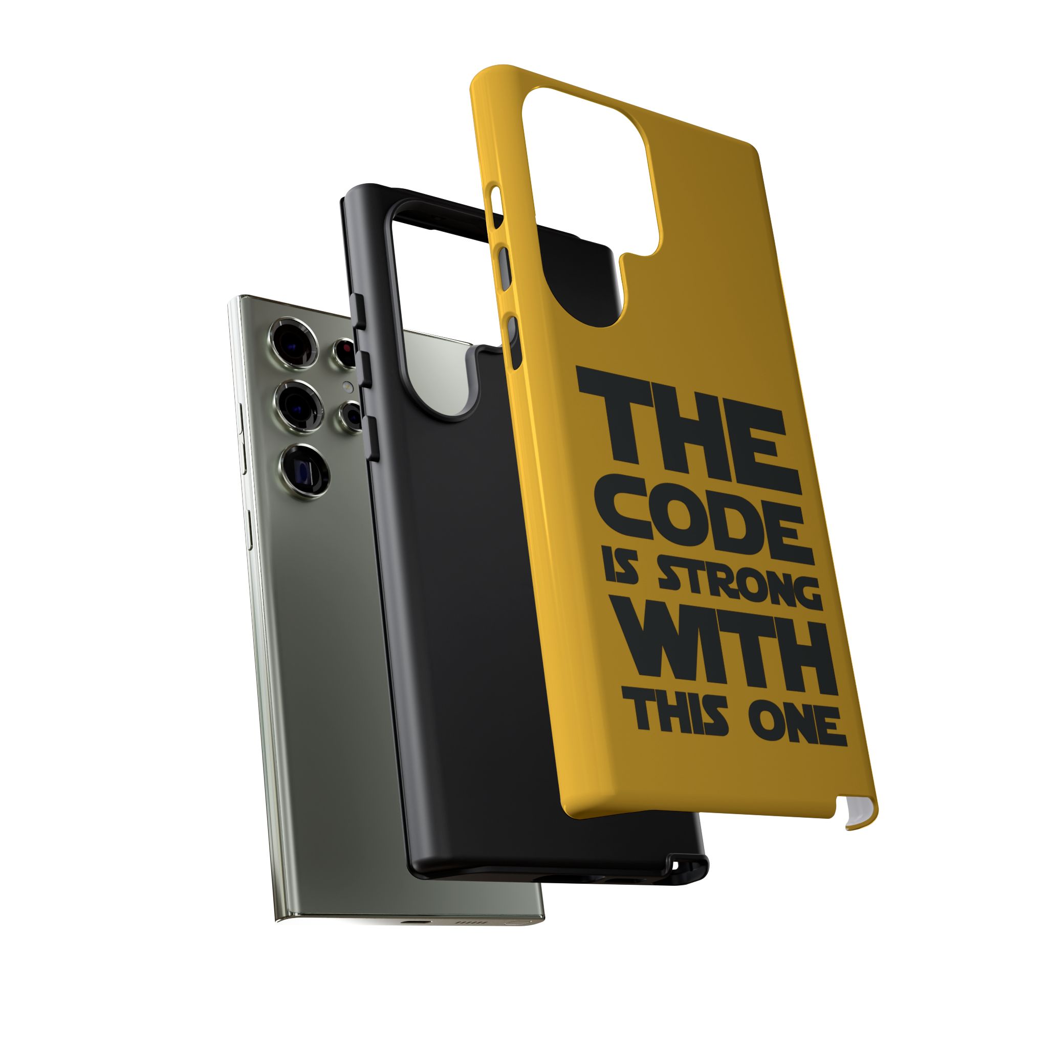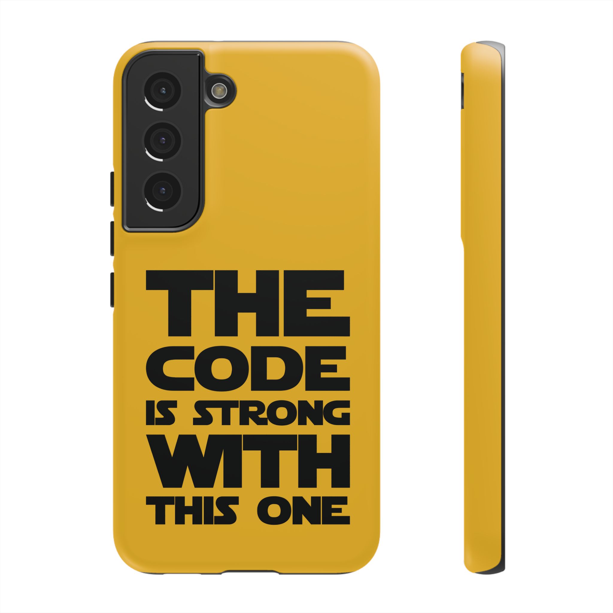 Une coque de téléphone audacieuse et protectrice qui affiche fièrement son côté geek. Un jaune moutarde éclatant habille la coque double couche, tandis qu'un slogan typographique noir net proclame : “ THE CODE IS STRONG WITH THIS ONE ”. La doublure en silicone TPU amortit les chutes et offre une sensation haut de gamme au contact du téléphone. L'impression 3D intégrale préserve l'éclat du message, et la protection UV protège les couleurs en extérieur. Des découpes précises laissent les ports accessibles et la coque est compatible avec la recharge sans fil. Conçue pour résister aux aléas du quotidien d'un développeur – trajets domicile-travail, sessions de travail intensives au café, sessions de débogage nocturnes – elle affiche avec style et assurance.