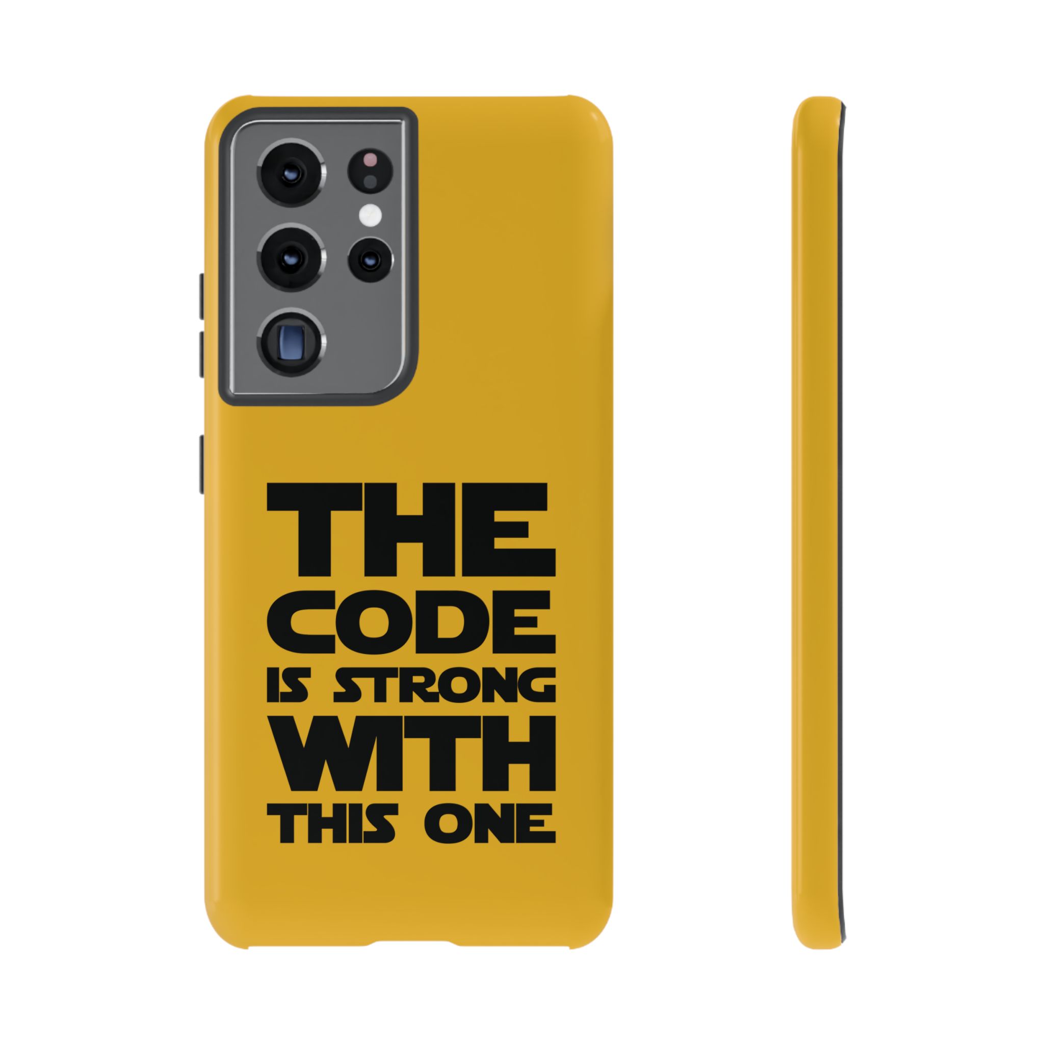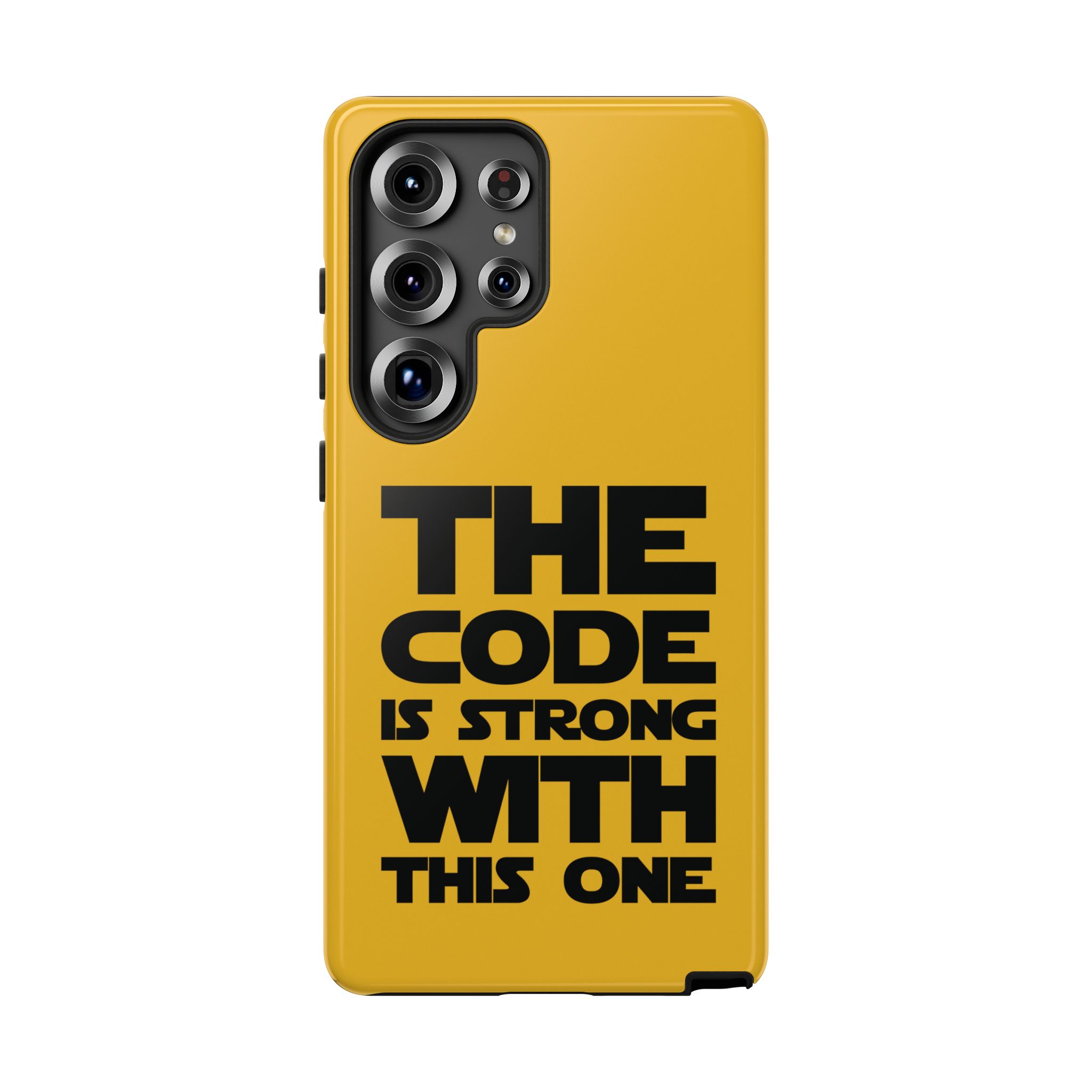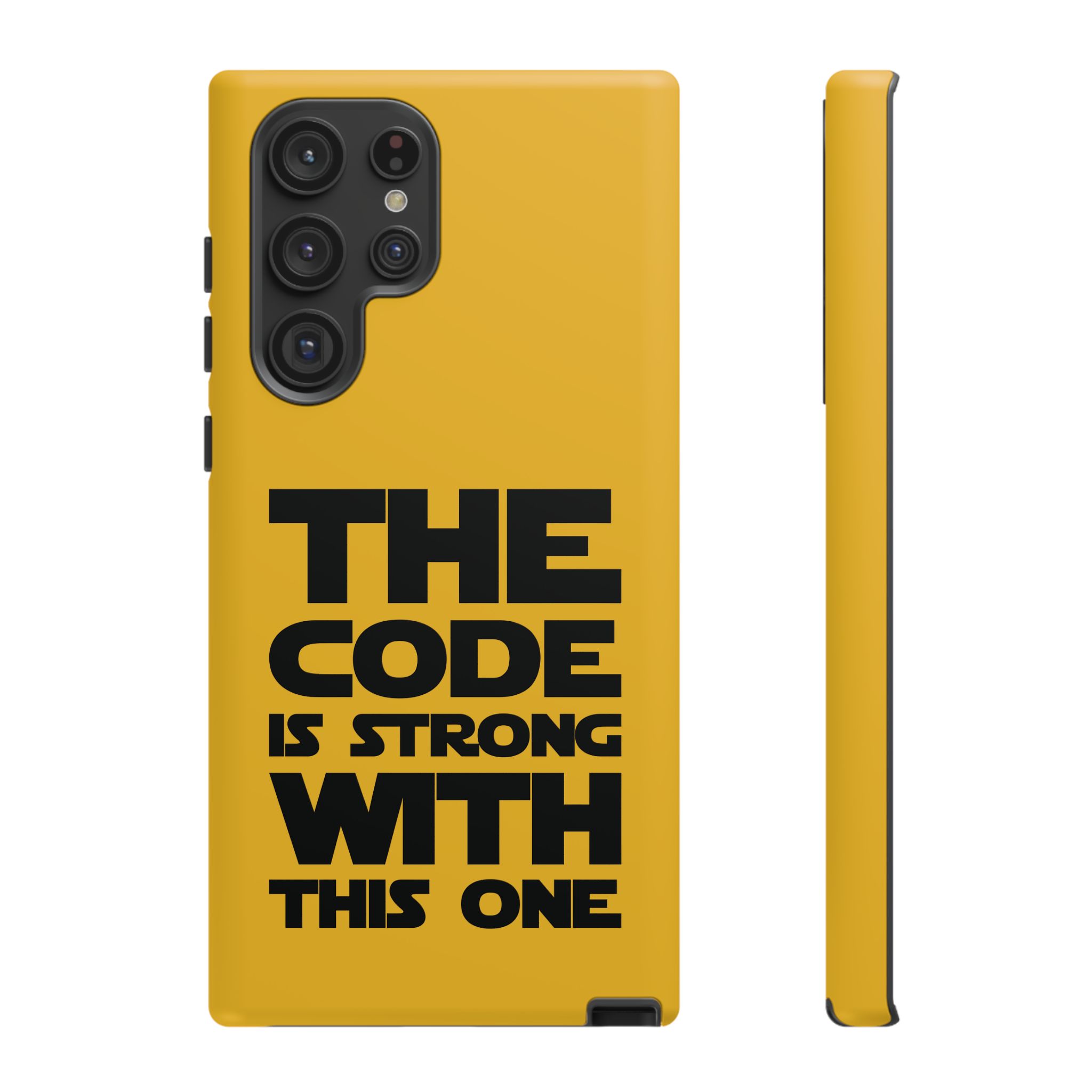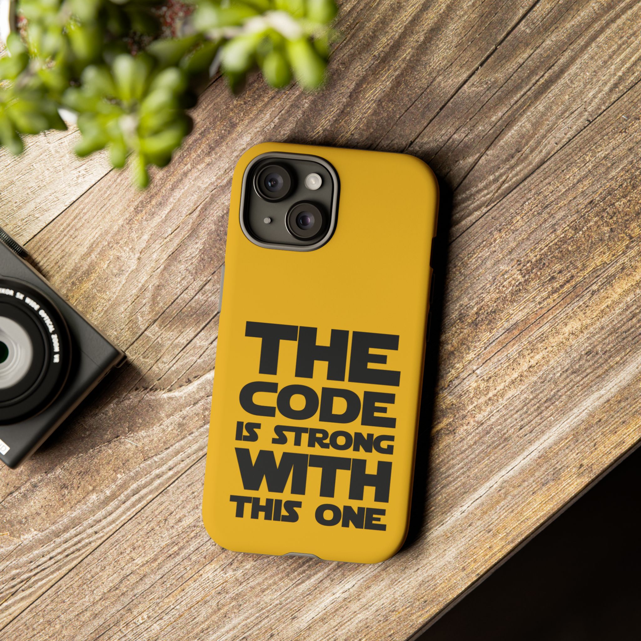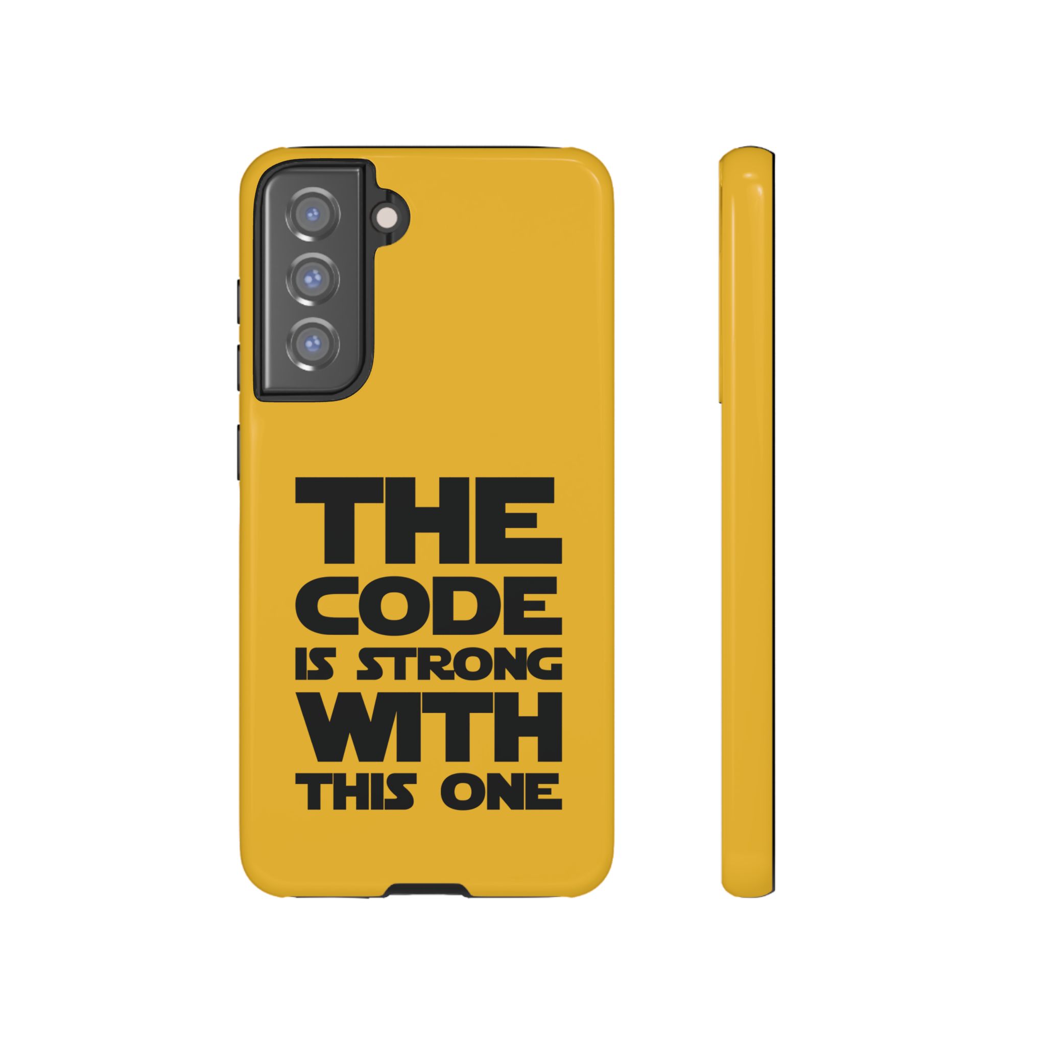 Une coque de téléphone audacieuse et protectrice qui affiche fièrement son côté geek. Un jaune moutarde éclatant habille la coque double couche, tandis qu'un slogan typographique noir net proclame : “ THE CODE IS STRONG WITH THIS ONE ”. La doublure en silicone TPU amortit les chutes et offre une sensation haut de gamme au contact du téléphone. L'impression 3D intégrale préserve l'éclat du message, et la protection UV protège les couleurs en extérieur. Des découpes précises laissent les ports accessibles et la coque est compatible avec la recharge sans fil. Conçue pour résister aux aléas du quotidien d'un développeur – trajets domicile-travail, sessions de travail intensives au café, sessions de débogage nocturnes – elle affiche avec style et assurance.