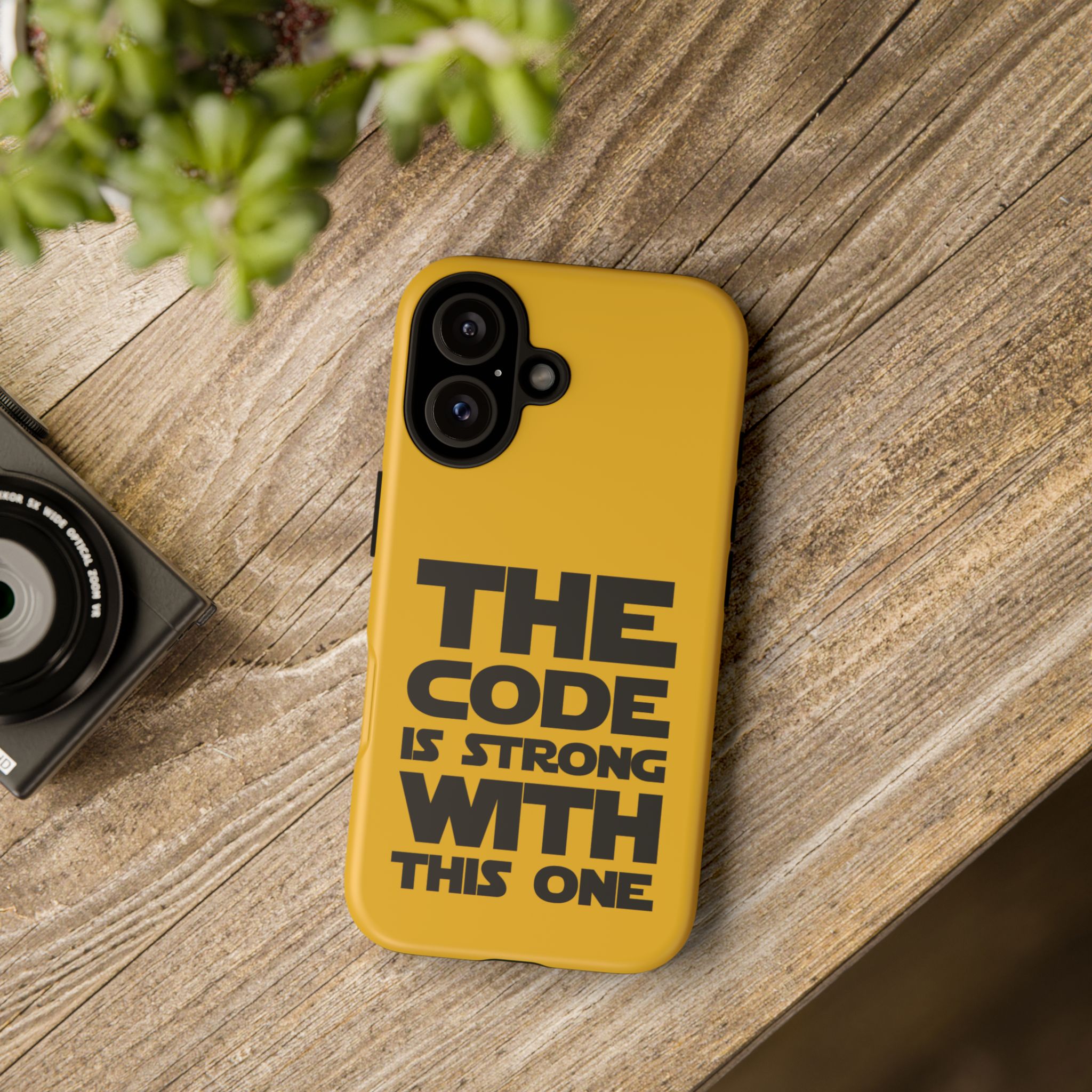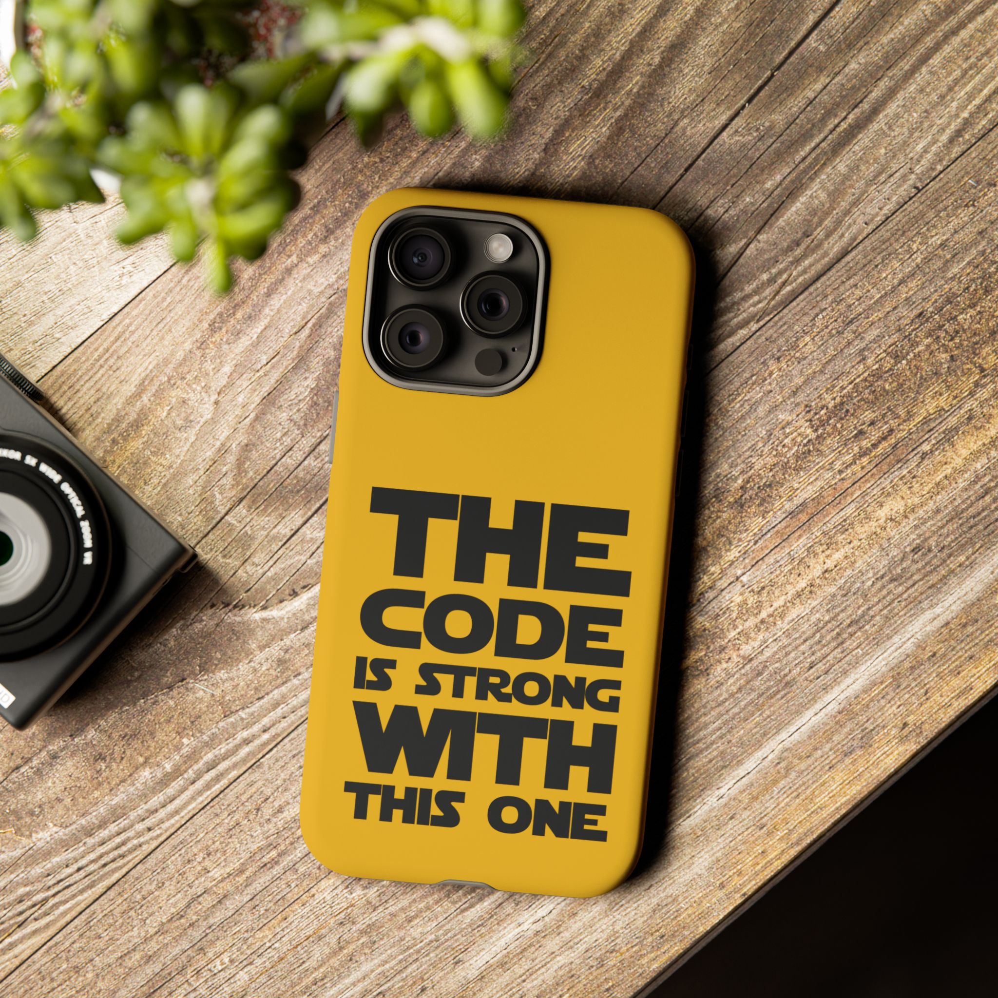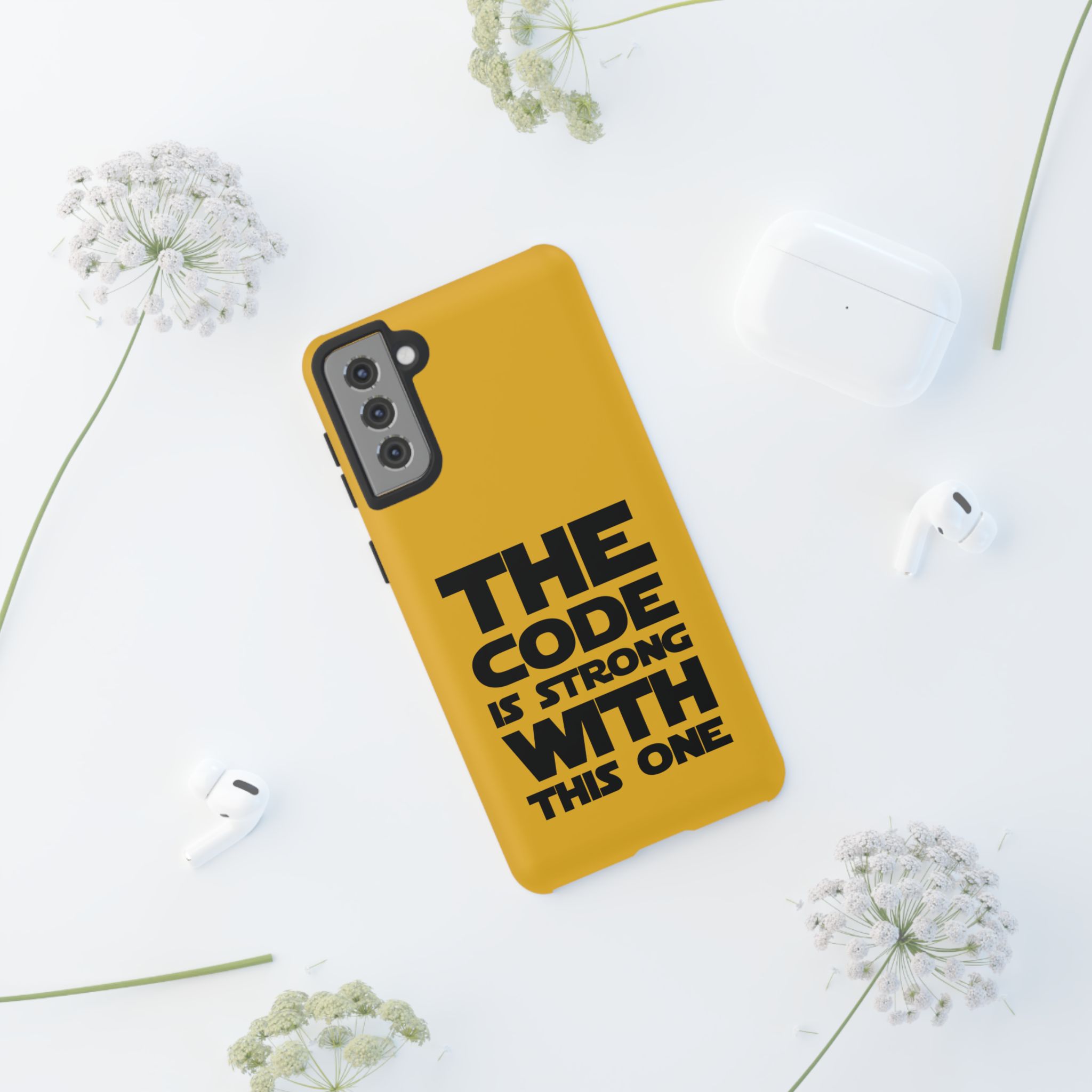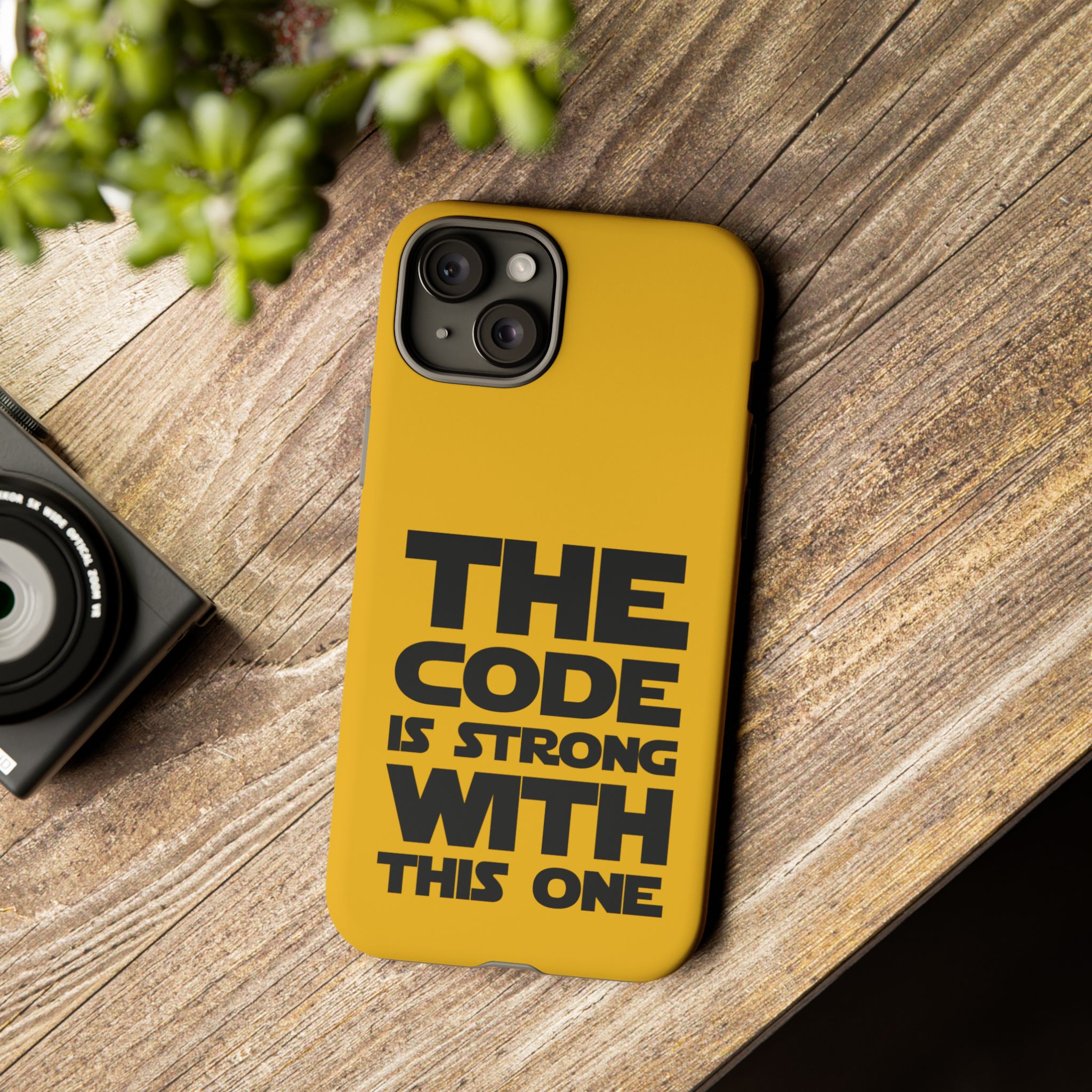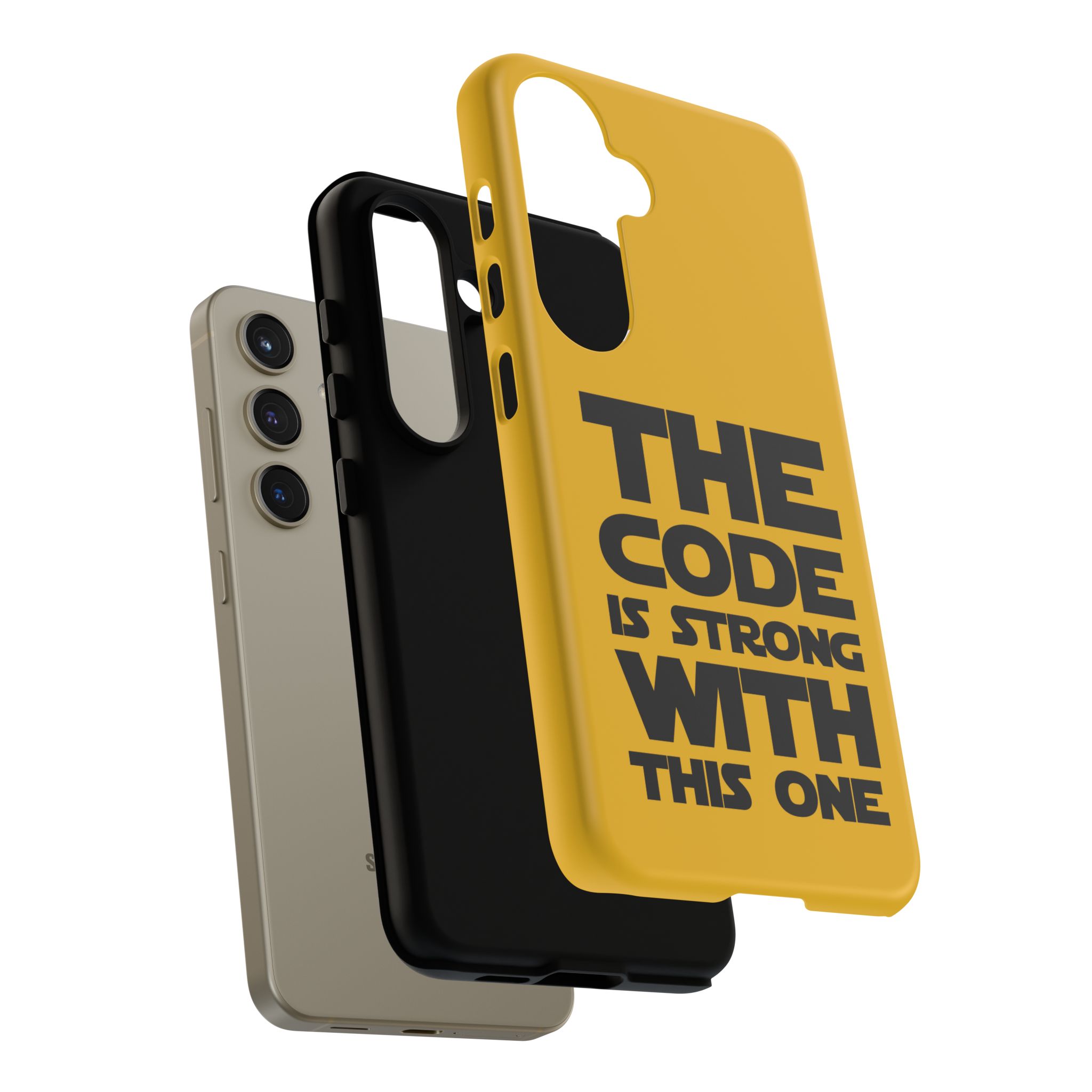 Une coque de téléphone audacieuse et protectrice qui affiche fièrement son côté geek. Un jaune moutarde éclatant habille la coque double couche, tandis qu'un slogan typographique noir net proclame : “ THE CODE IS STRONG WITH THIS ONE ”. La doublure en silicone TPU amortit les chutes et offre une sensation haut de gamme au contact du téléphone. L'impression 3D intégrale préserve l'éclat du message, et la protection UV protège les couleurs en extérieur. Des découpes précises laissent les ports accessibles et la coque est compatible avec la recharge sans fil. Conçue pour résister aux aléas du quotidien d'un développeur – trajets domicile-travail, sessions de travail intensives au café, sessions de débogage nocturnes – elle affiche avec style et assurance.