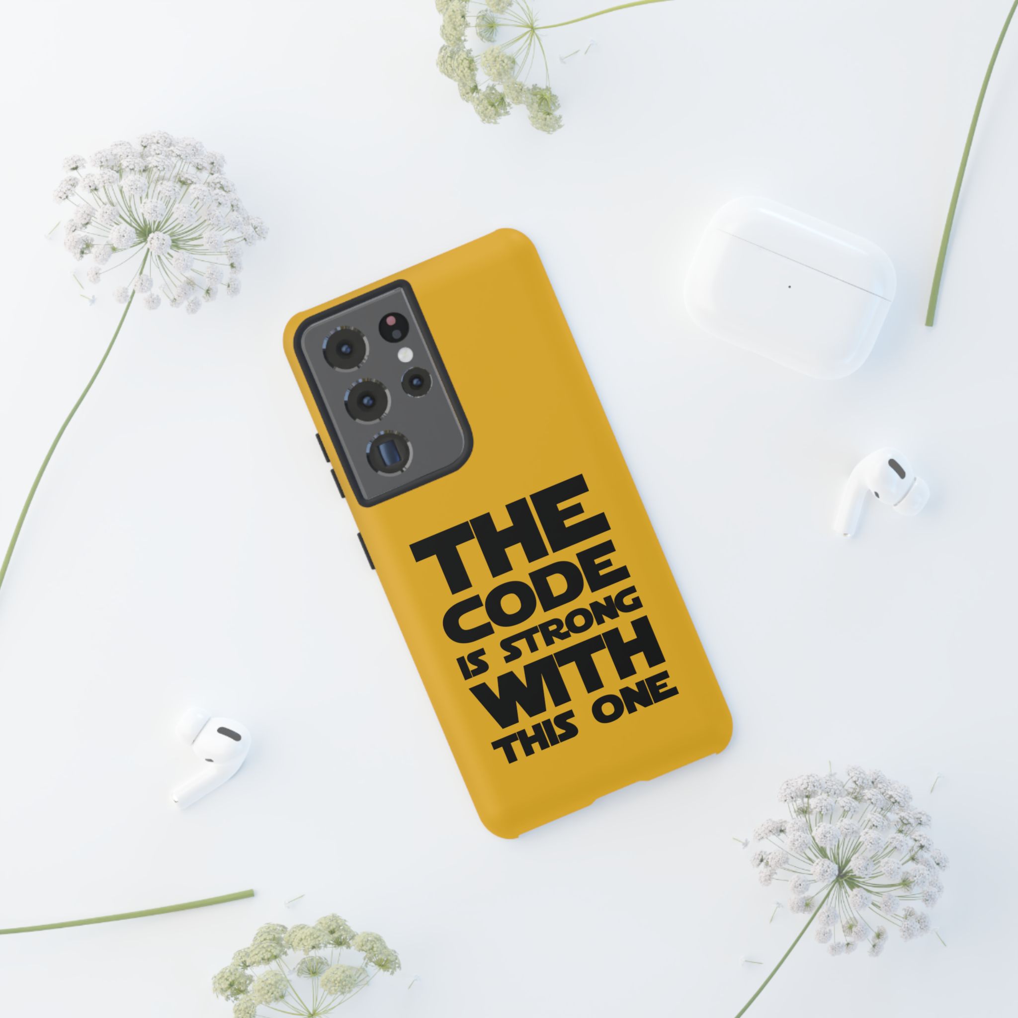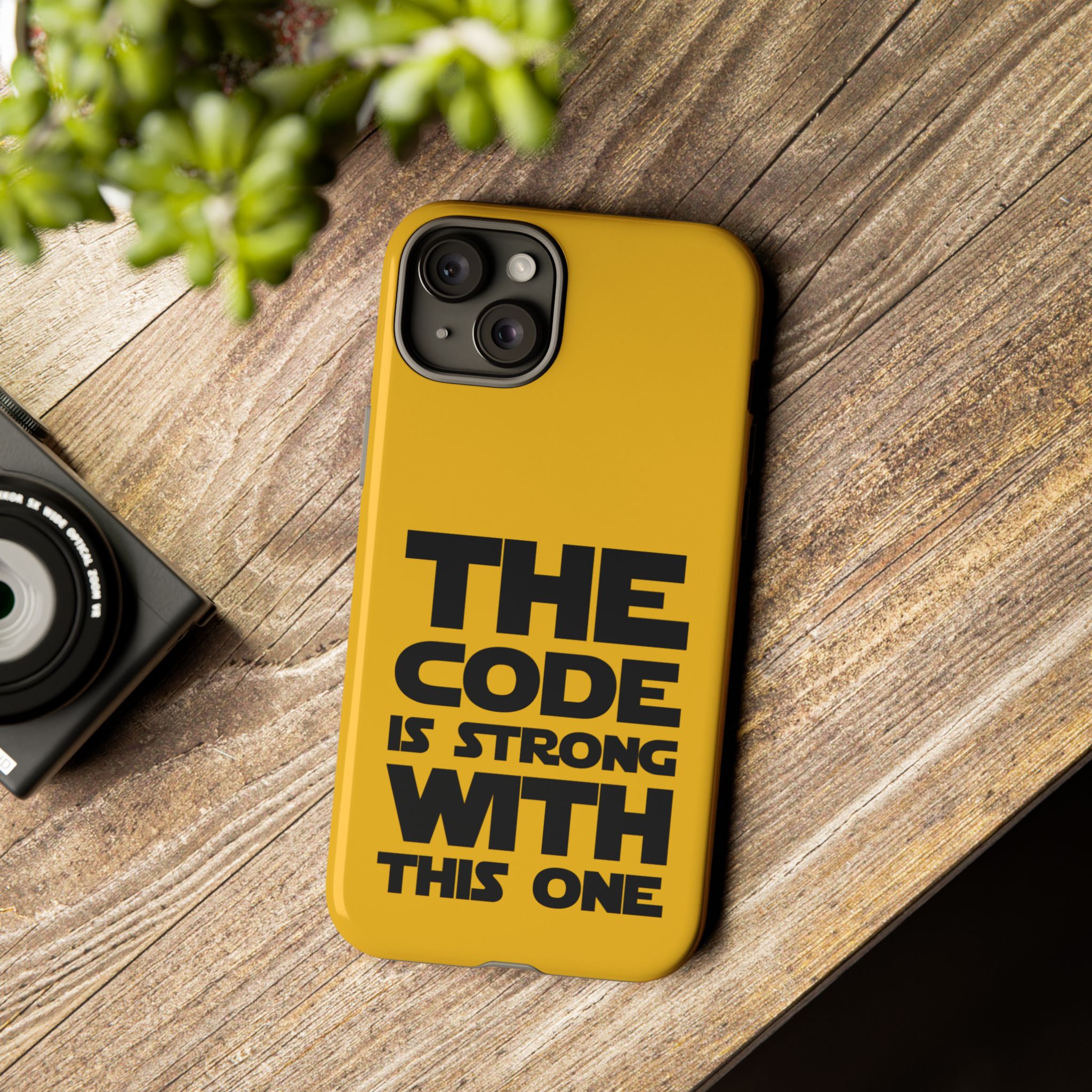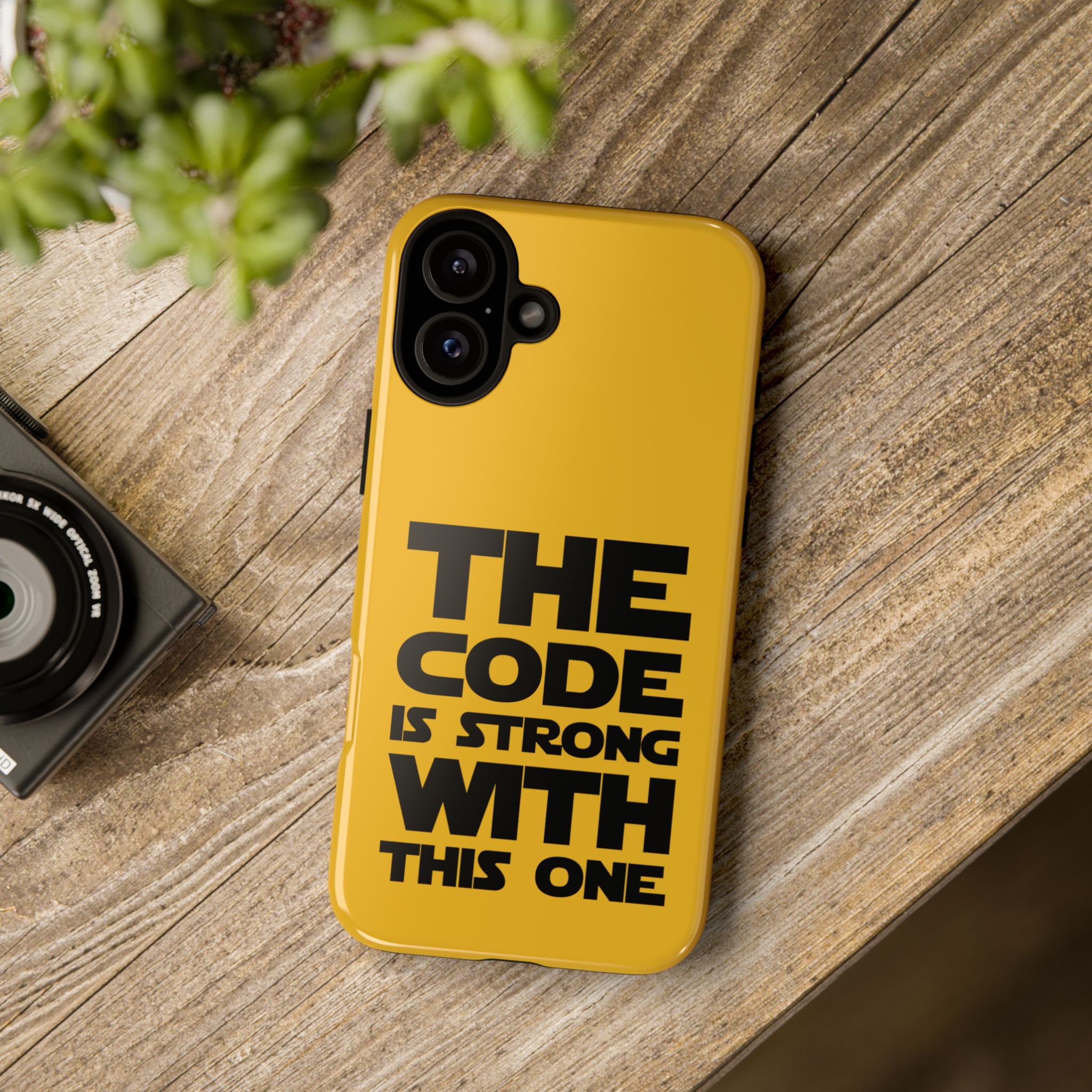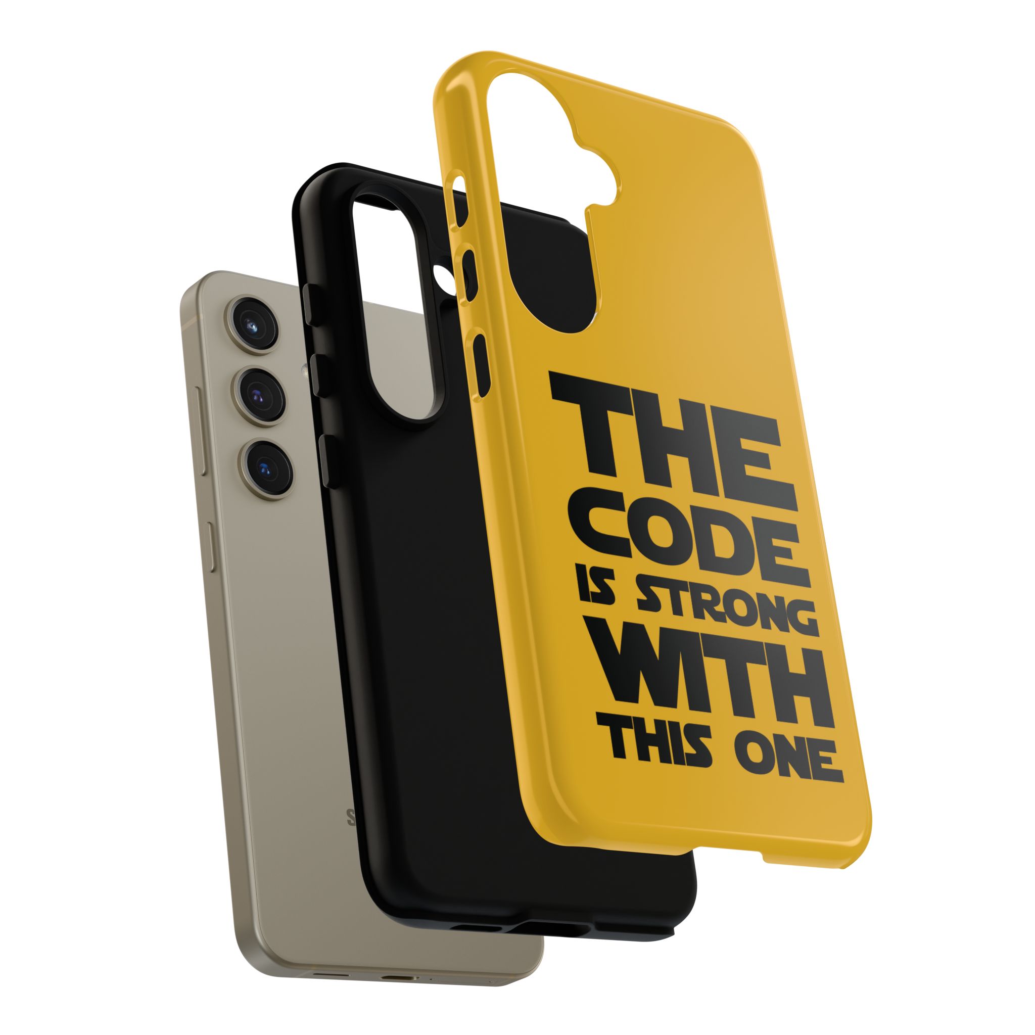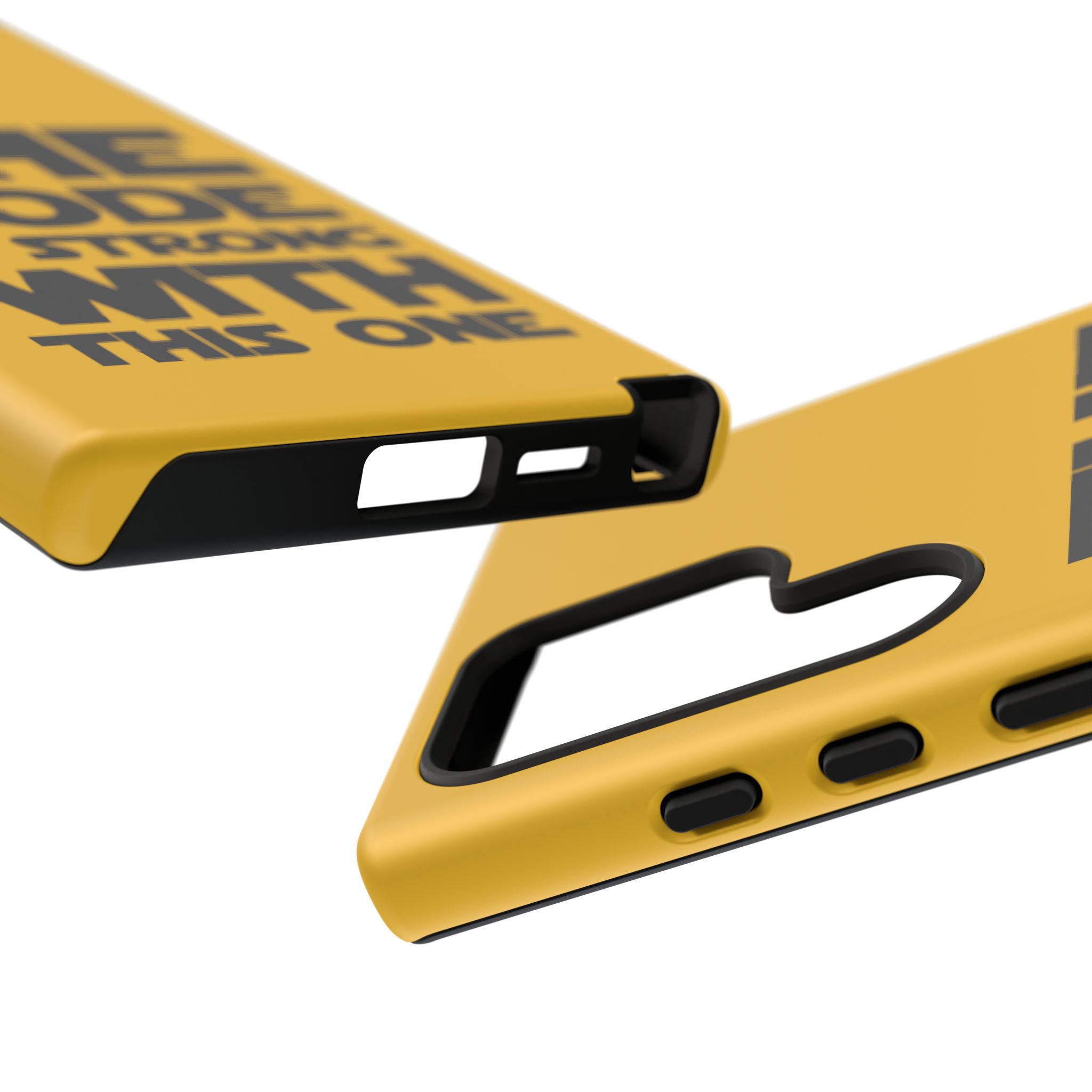 Une coque de téléphone audacieuse et protectrice qui affiche fièrement son côté geek. Un jaune moutarde éclatant habille la coque double couche, tandis qu'un slogan typographique noir net proclame : “ THE CODE IS STRONG WITH THIS ONE ”. La doublure en silicone TPU amortit les chutes et offre une sensation haut de gamme au contact du téléphone. L'impression 3D intégrale préserve l'éclat du message, et la protection UV protège les couleurs en extérieur. Des découpes précises laissent les ports accessibles et la coque est compatible avec la recharge sans fil. Conçue pour résister aux aléas du quotidien d'un développeur – trajets domicile-travail, sessions de travail intensives au café, sessions de débogage nocturnes – elle affiche avec style et assurance.