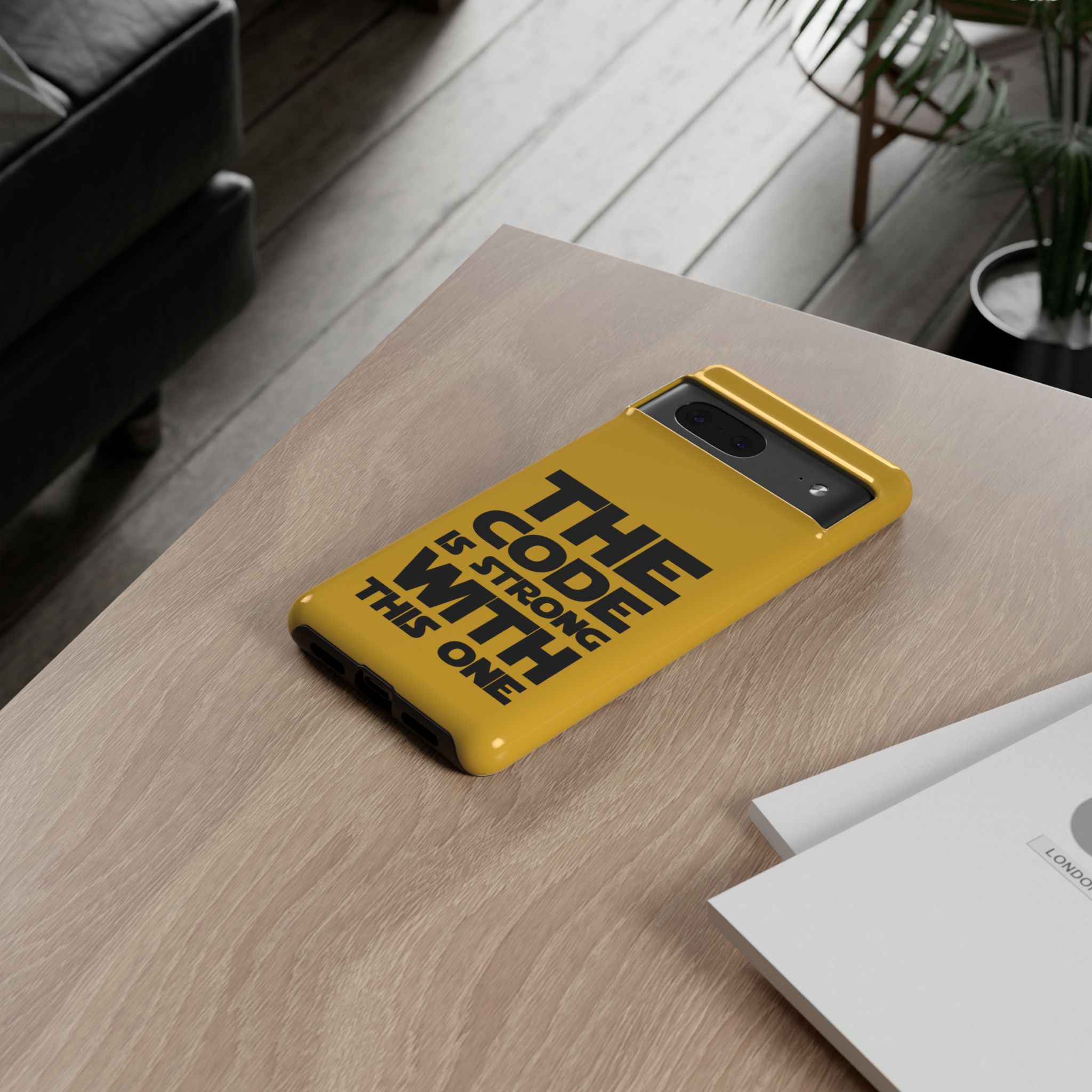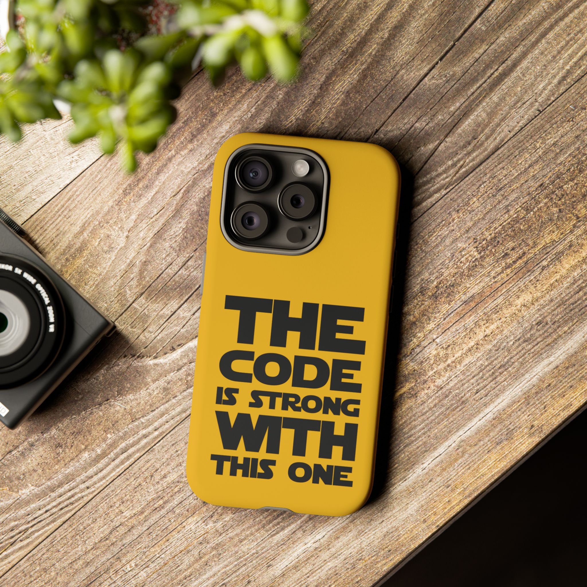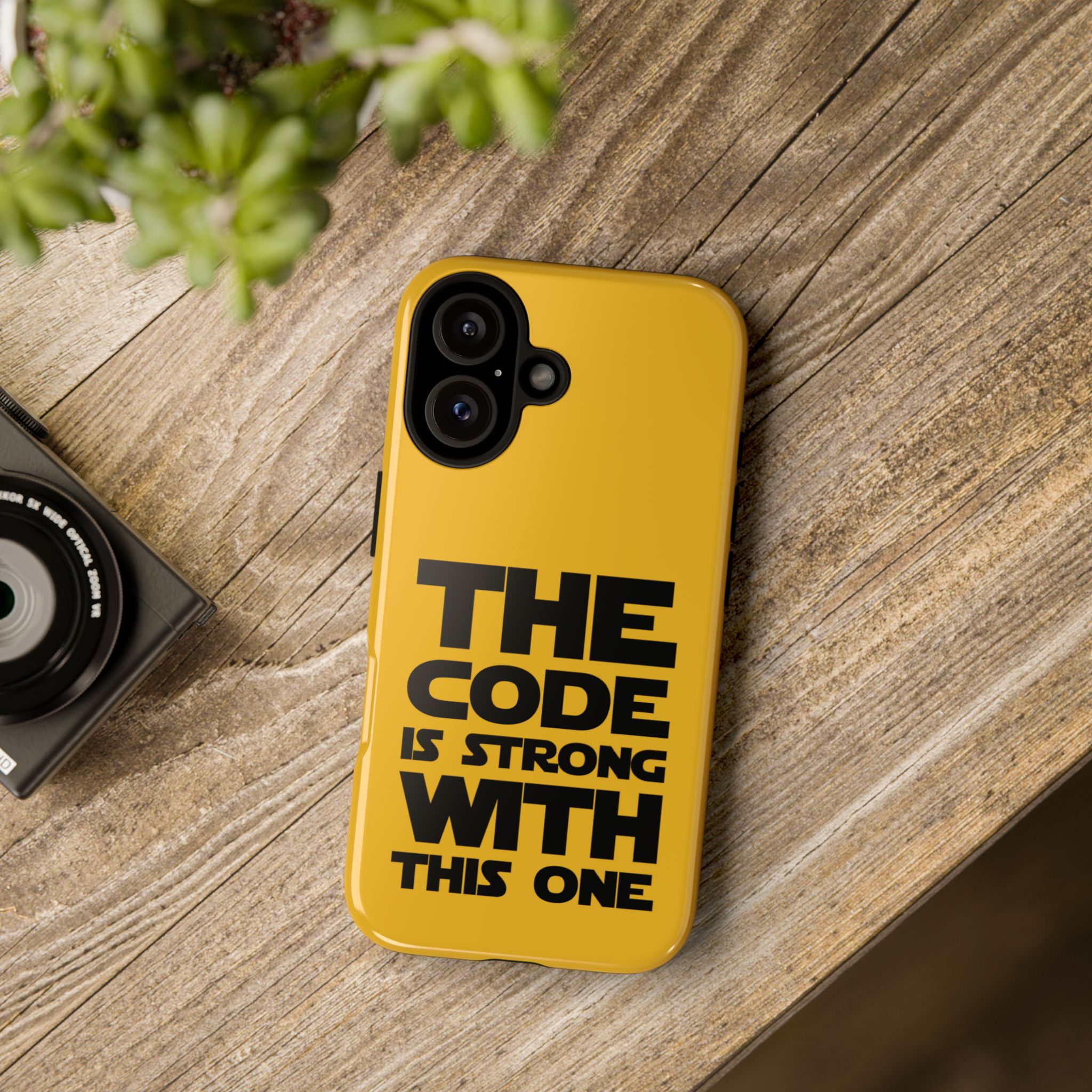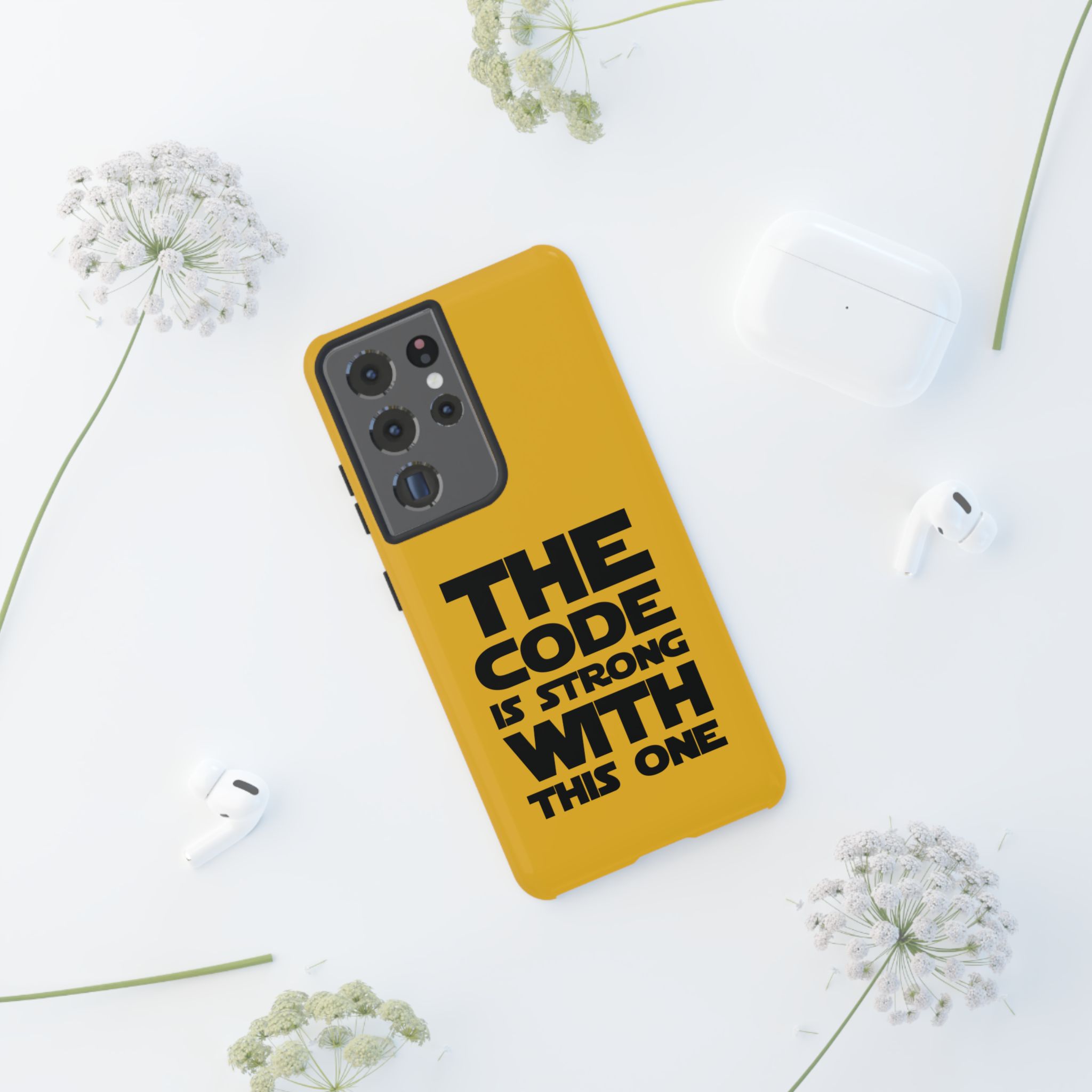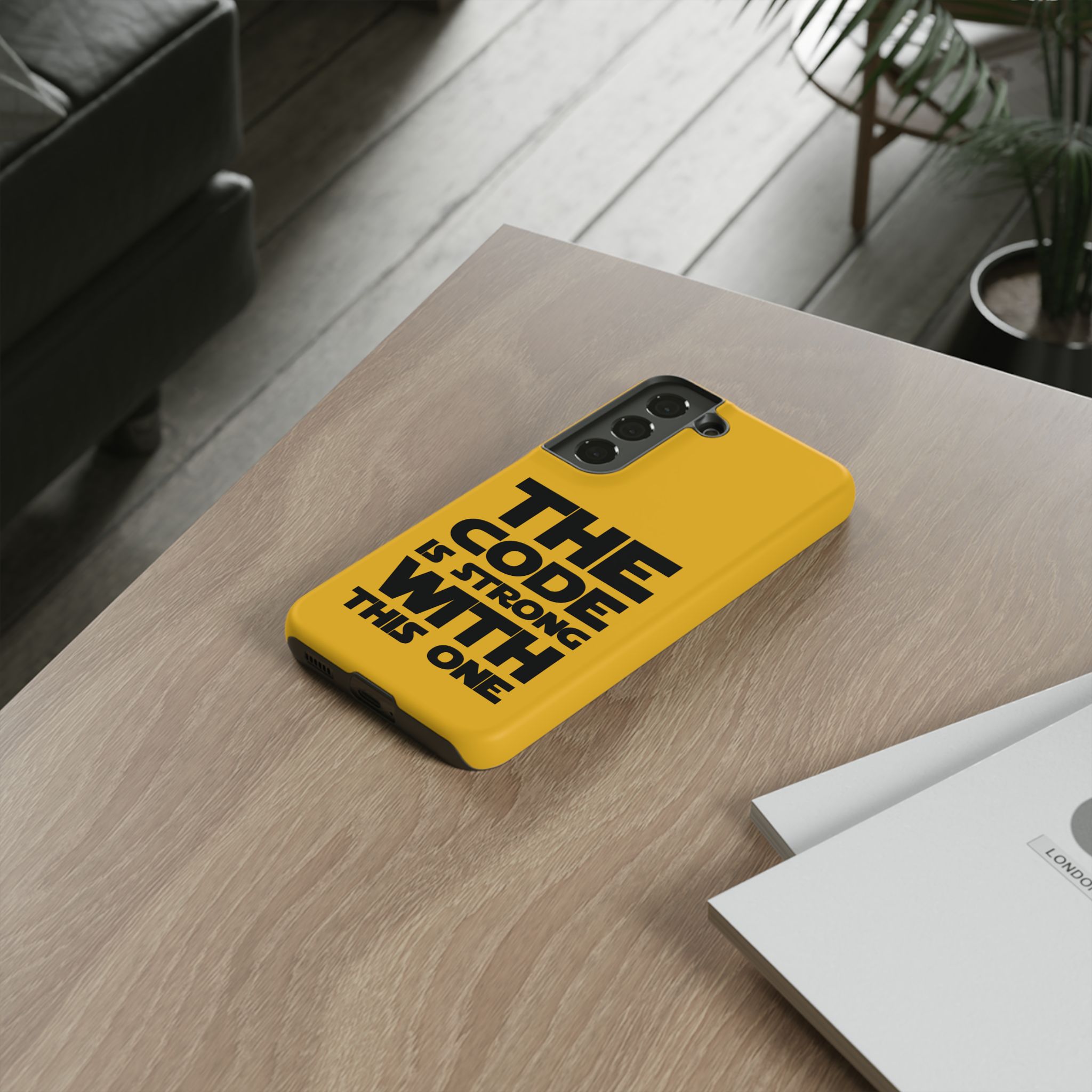 Une coque de téléphone audacieuse et protectrice qui affiche fièrement son côté geek. Un jaune moutarde éclatant habille la coque double couche, tandis qu'un slogan typographique noir net proclame : “ THE CODE IS STRONG WITH THIS ONE ”. La doublure en silicone TPU amortit les chutes et offre une sensation haut de gamme au contact du téléphone. L'impression 3D intégrale préserve l'éclat du message, et la protection UV protège les couleurs en extérieur. Des découpes précises laissent les ports accessibles et la coque est compatible avec la recharge sans fil. Conçue pour résister aux aléas du quotidien d'un développeur – trajets domicile-travail, sessions de travail intensives au café, sessions de débogage nocturnes – elle affiche avec style et assurance.