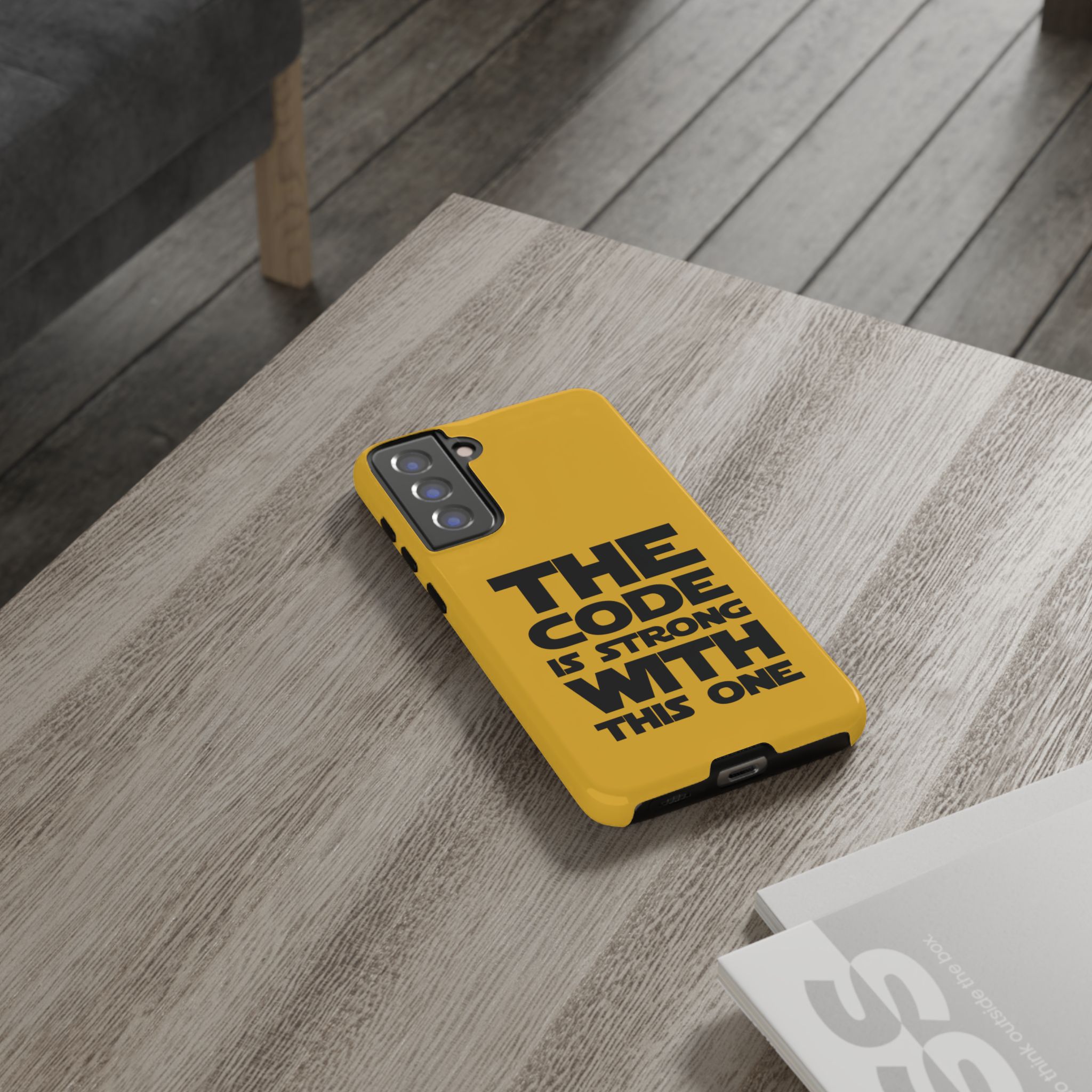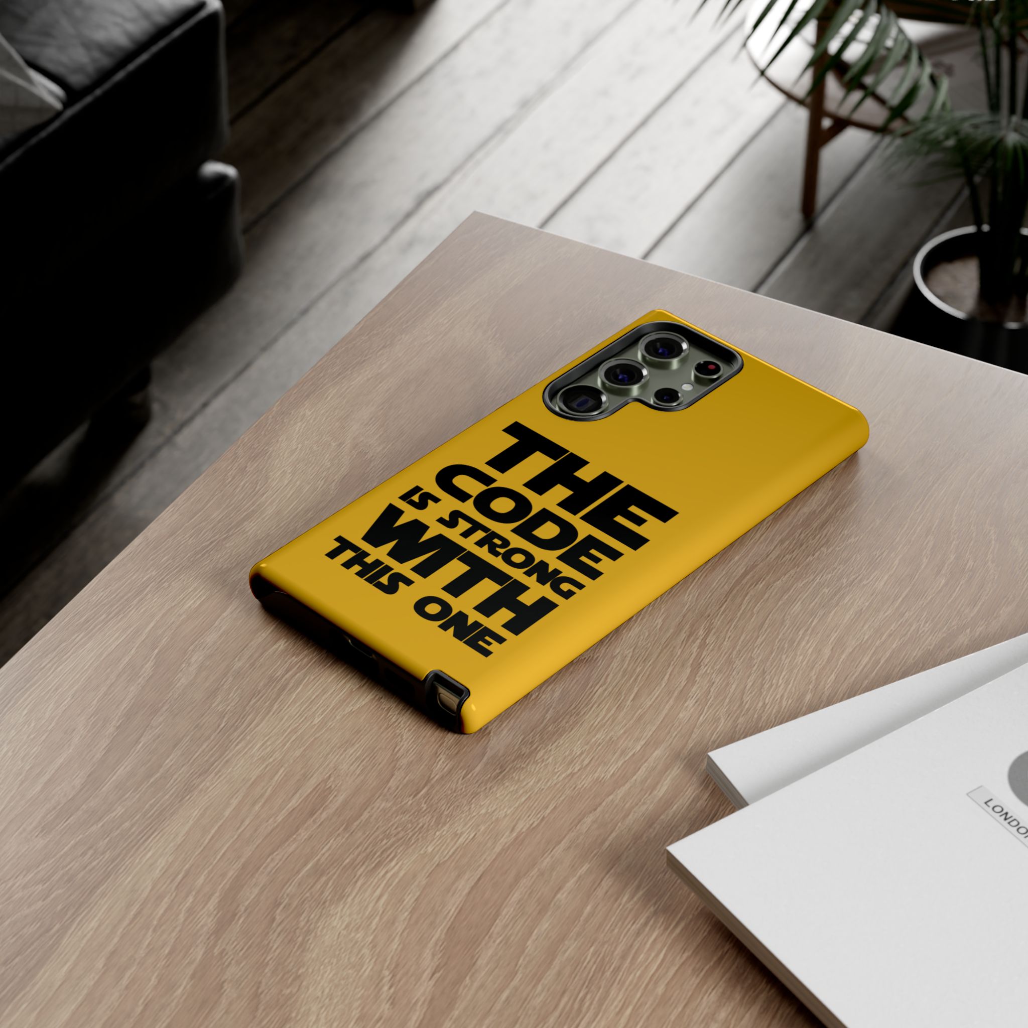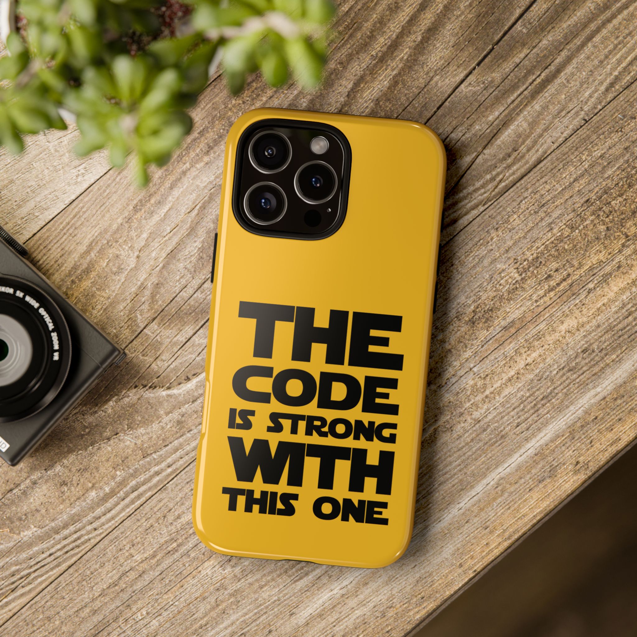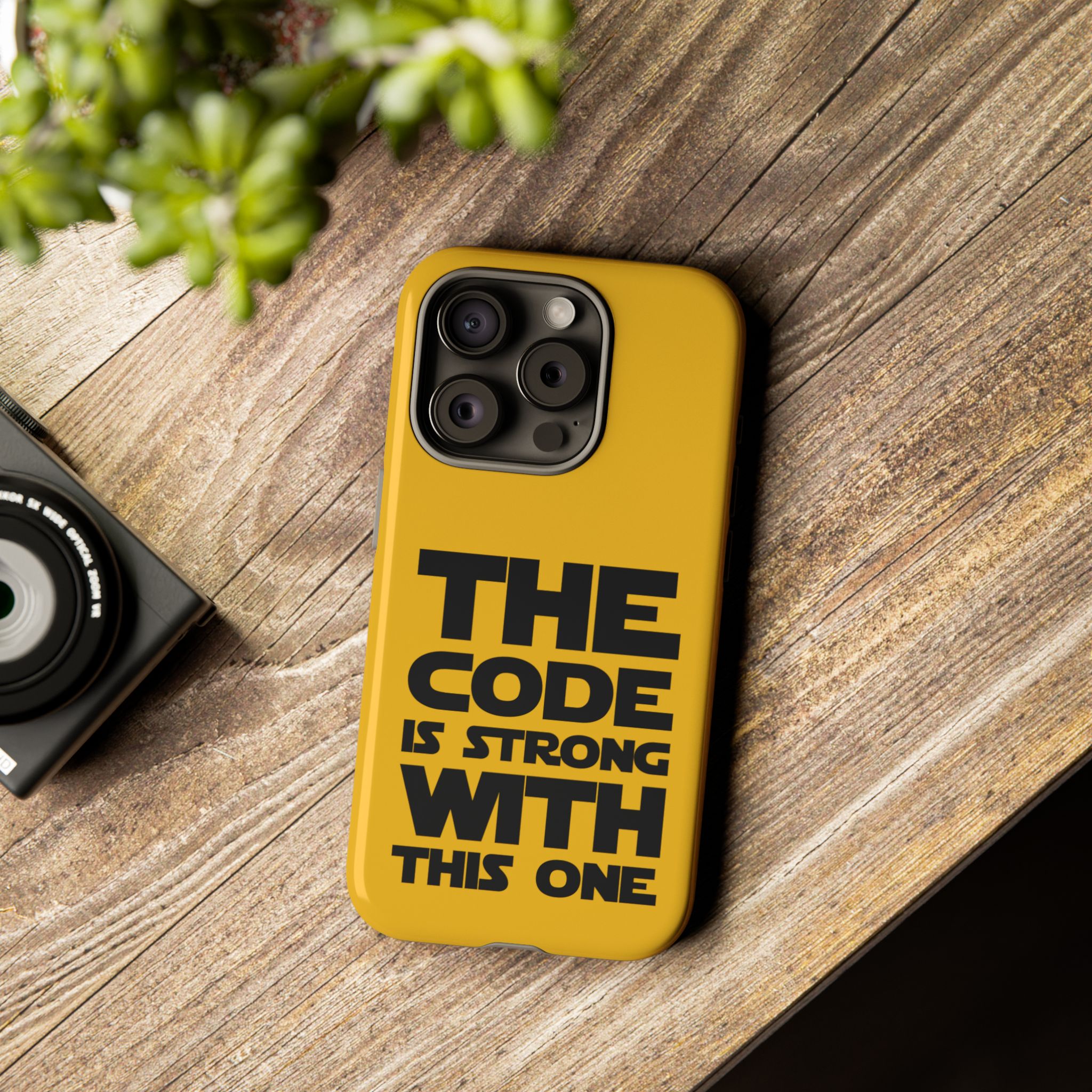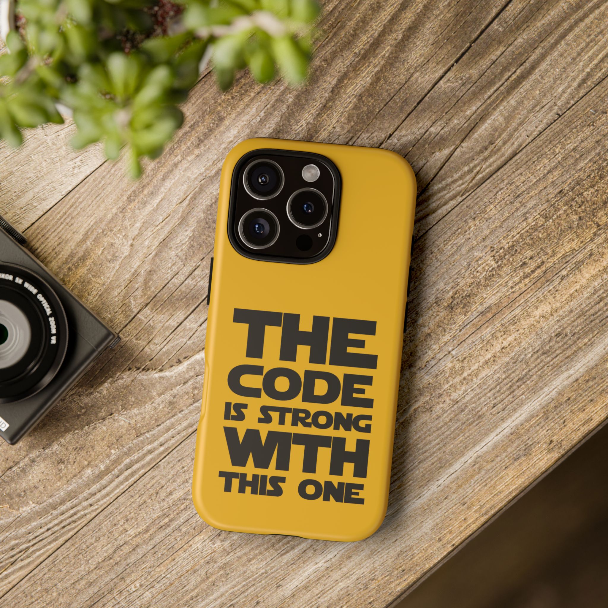 Une coque de téléphone audacieuse et protectrice qui affiche fièrement son côté geek. Un jaune moutarde éclatant habille la coque double couche, tandis qu'un slogan typographique noir net proclame : “ THE CODE IS STRONG WITH THIS ONE ”. La doublure en silicone TPU amortit les chutes et offre une sensation haut de gamme au contact du téléphone. L'impression 3D intégrale préserve l'éclat du message, et la protection UV protège les couleurs en extérieur. Des découpes précises laissent les ports accessibles et la coque est compatible avec la recharge sans fil. Conçue pour résister aux aléas du quotidien d'un développeur – trajets domicile-travail, sessions de travail intensives au café, sessions de débogage nocturnes – elle affiche avec style et assurance.